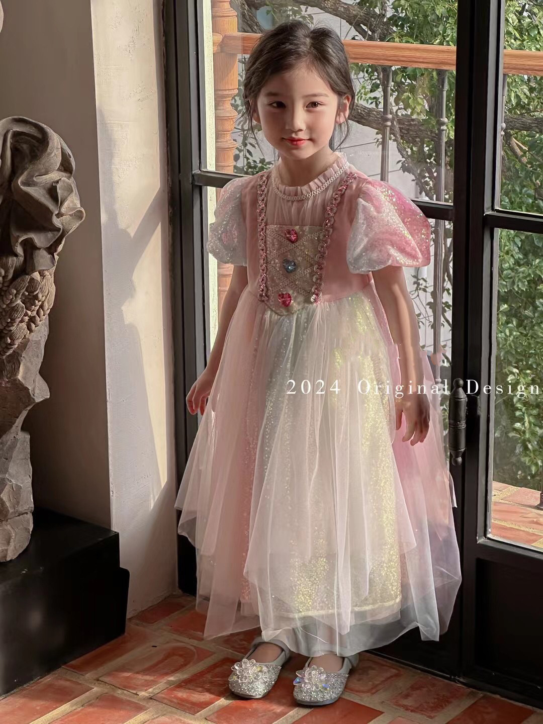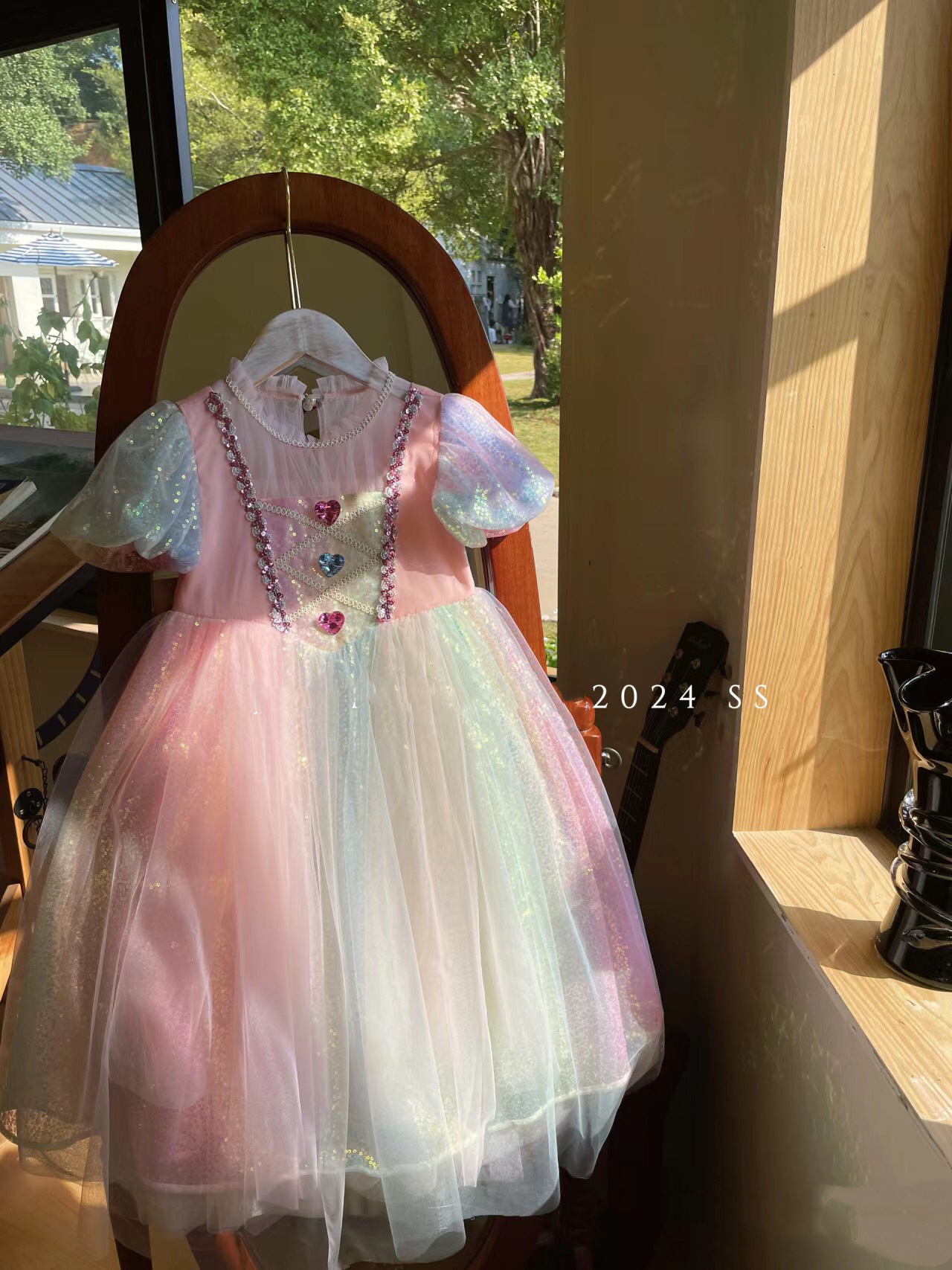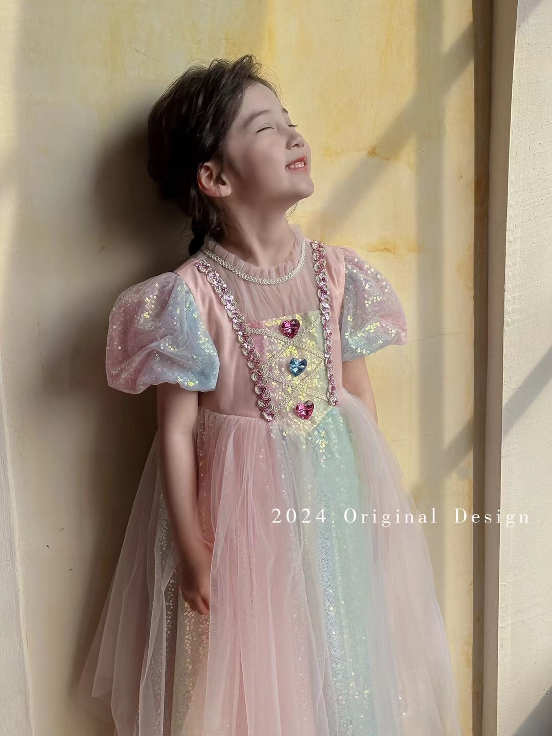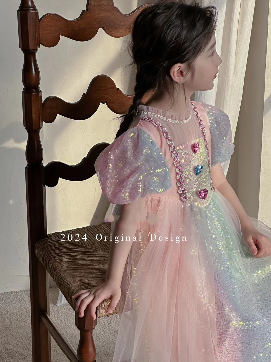 소녀의 원피스 캔디 컬러 스팽글 인어 공주 원피스 그라디언트 메쉬 24 여름 새로운 무거운 작업 원피스 성능