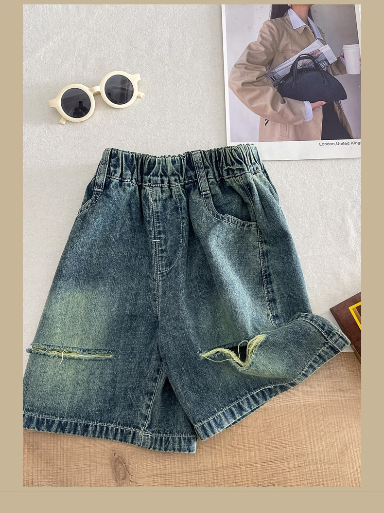 아동 데님 반바지 5부 바지 여름 스타일 2025 새로운 스타일 소년 찢어진 바지 중소 어린이를위한 얇은 여름 바지스토어 가기