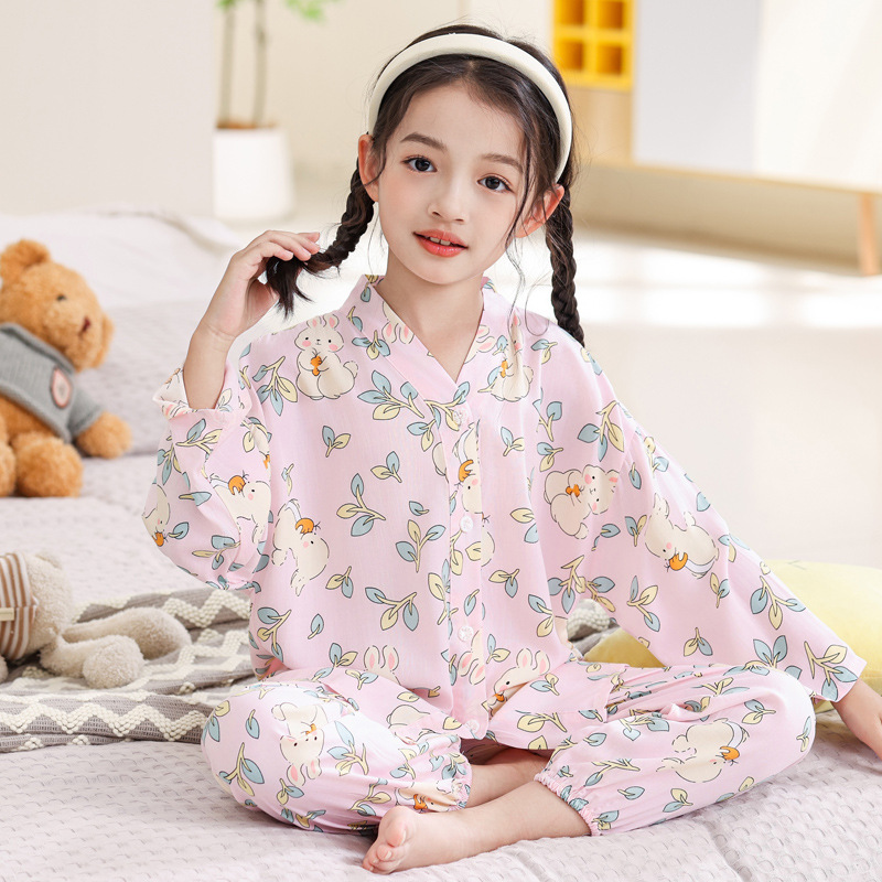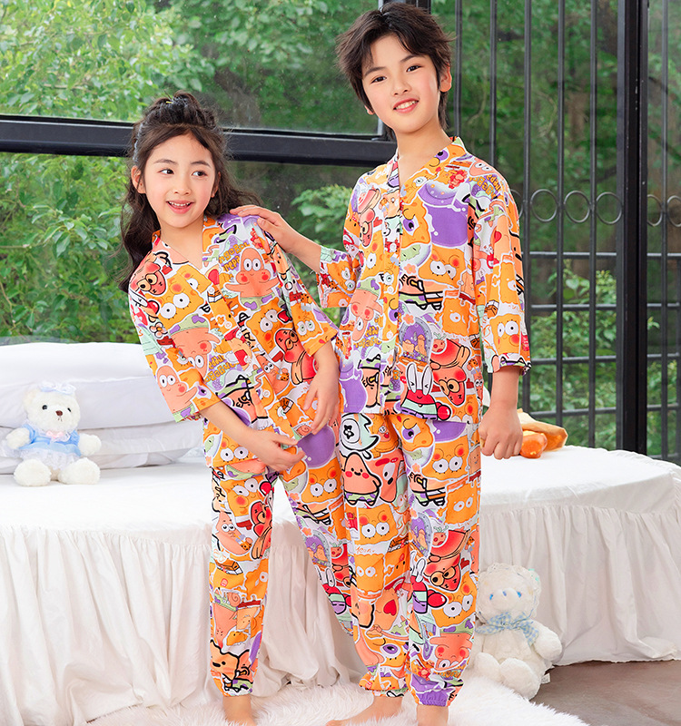 여름 어린이 면화 실크 잠옷 세트 소년과 소녀 카디건 소년과 어린 소녀 아기 얇은 면화 실크 가정 의류
