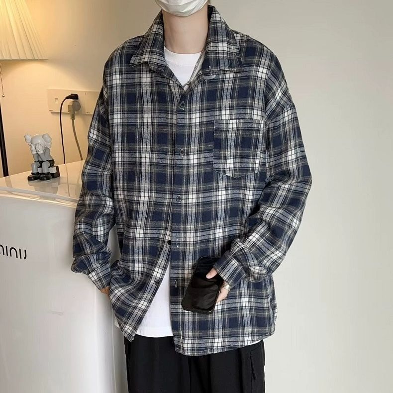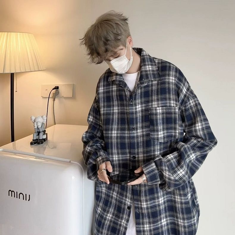 일본 격자 무늬 셔츠 남성 긴 소매 봄 새로운 청소년 트렌디 한 올 매치 느슨한 캐주얼 작업복 셔츠 재킷