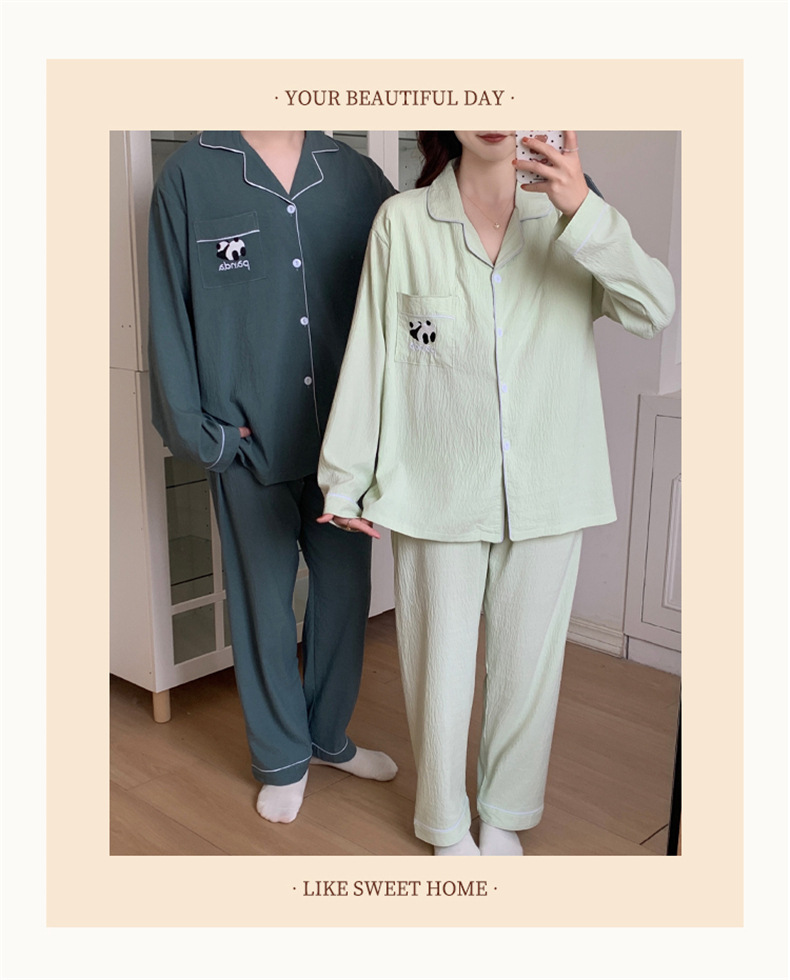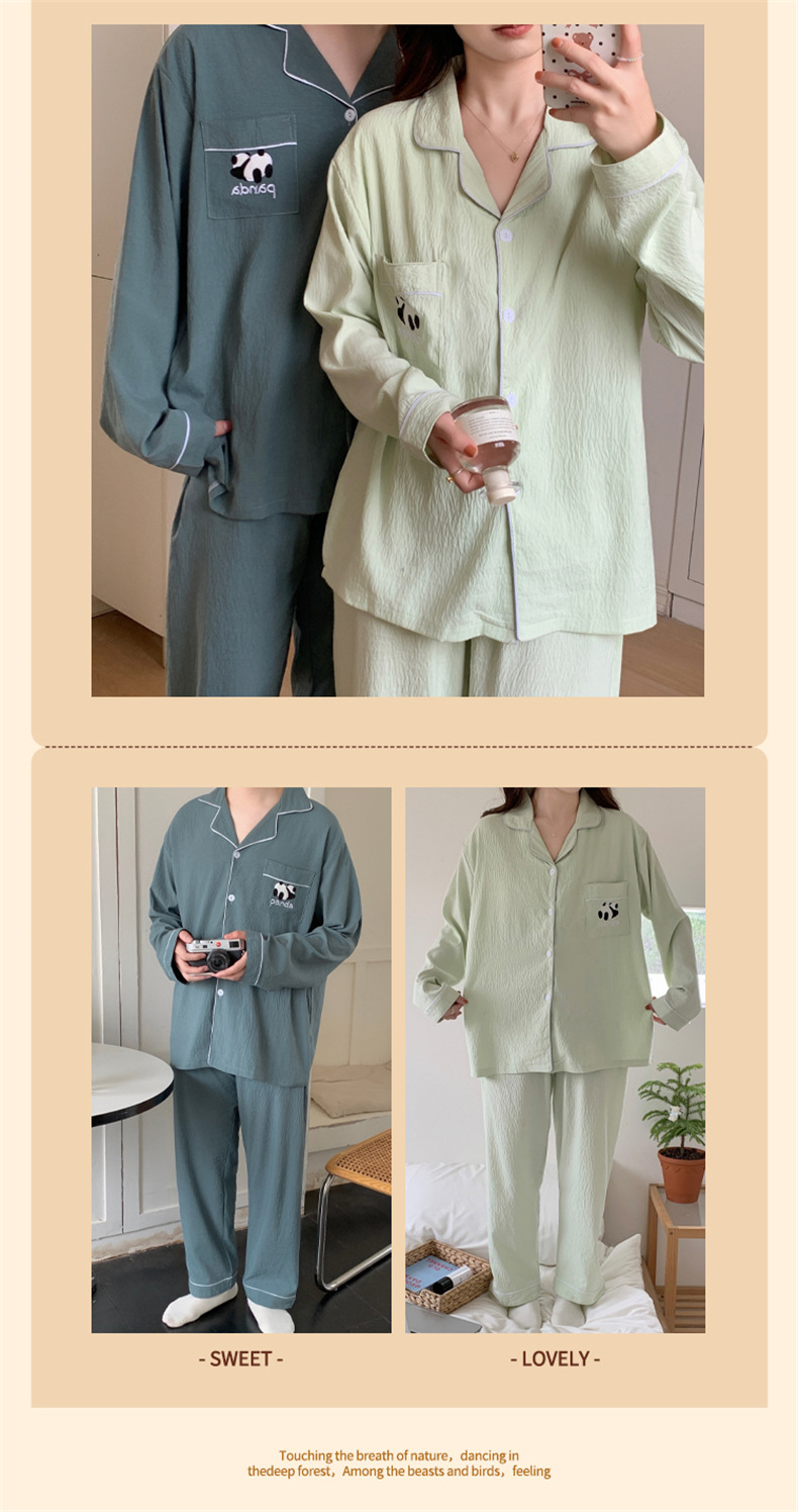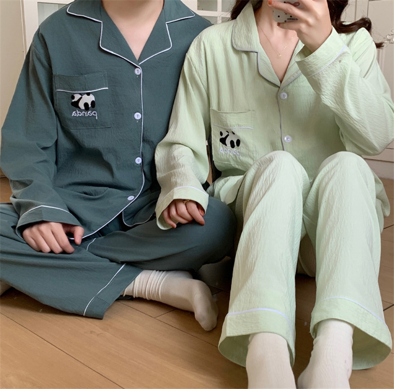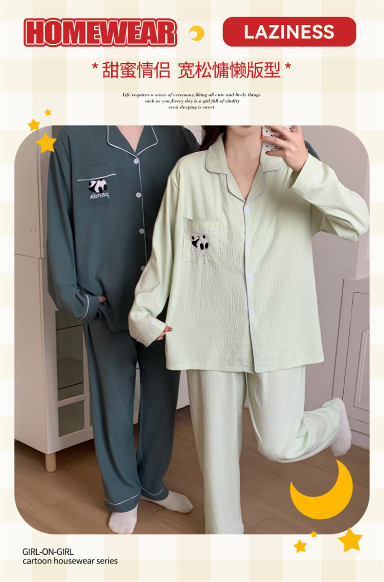 커플 잠옷 여성의 봄과 가을 면사 긴 소매 여성 만화 팬더 남자 캐주얼 홈 의류 세트 가슴 패드스토어 가기