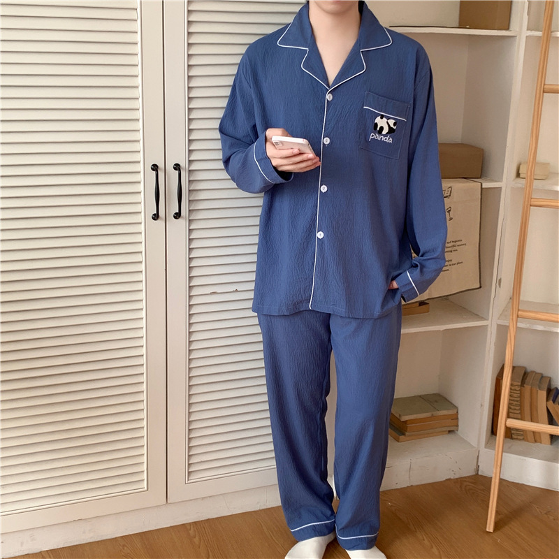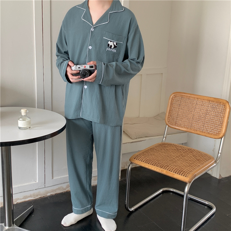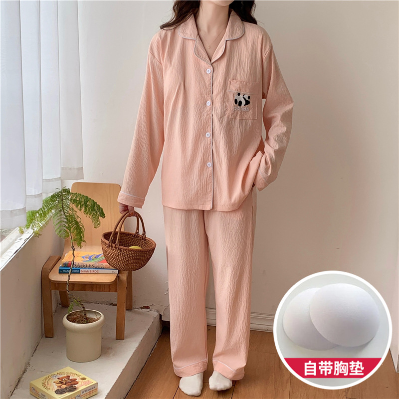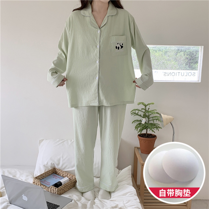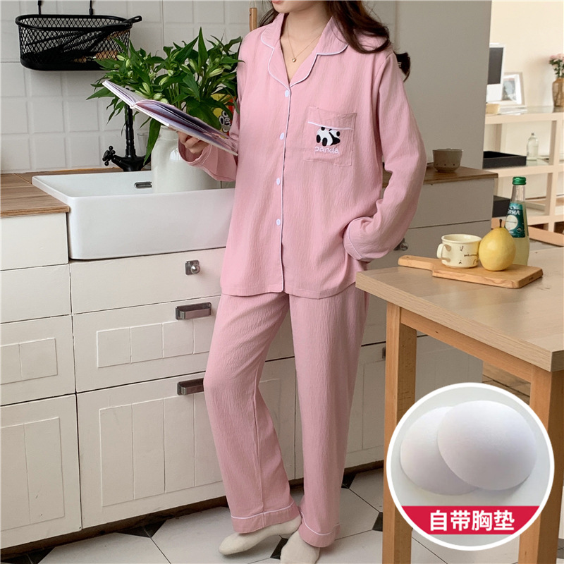 커플 잠옷 여성의 봄과 가을 면사 긴 소매 여성 만화 팬더 남자 캐주얼 홈 의류 세트 가슴 패드스토어 가기