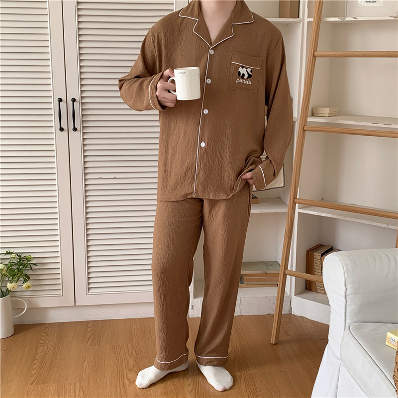 커플 잠옷 여성의 봄과 가을 면사 긴 소매 여성 만화 팬더 남자 캐주얼 홈 의류 세트 가슴 패드