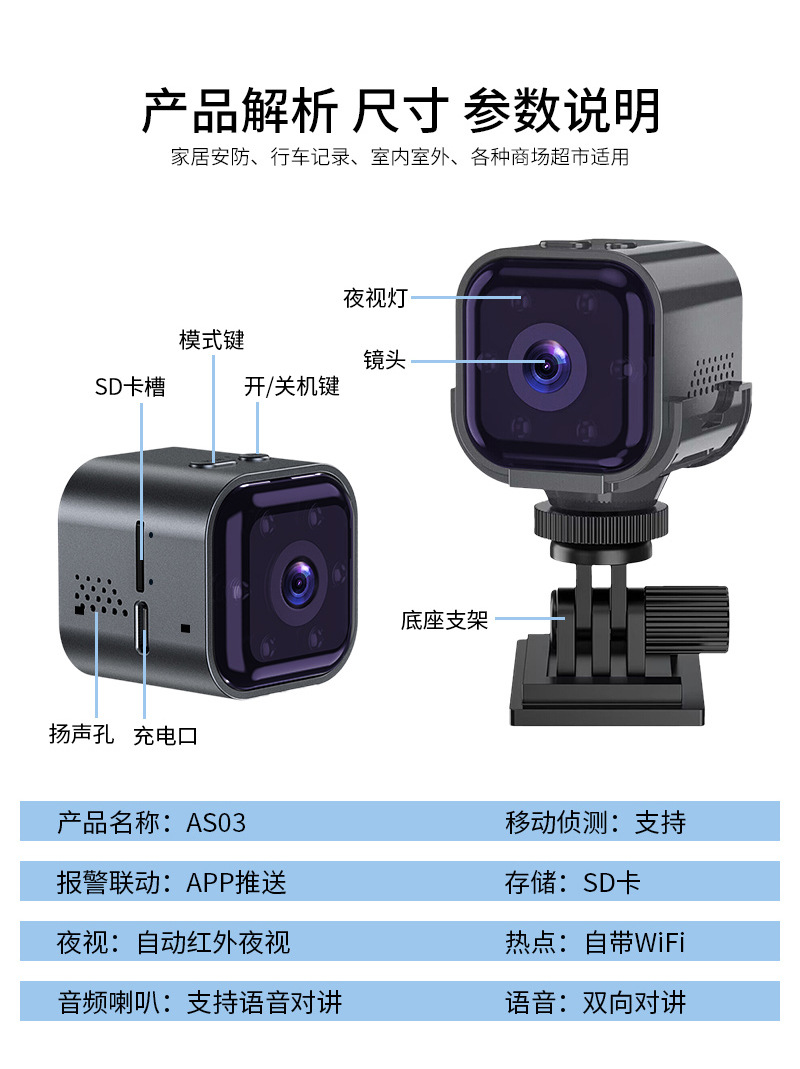 국경 간 AS03 저전력 카메라 인터콤 모션 감지 적외선 야간 투시경 HD 1080 WiFi 액션 카메라스토어 가기