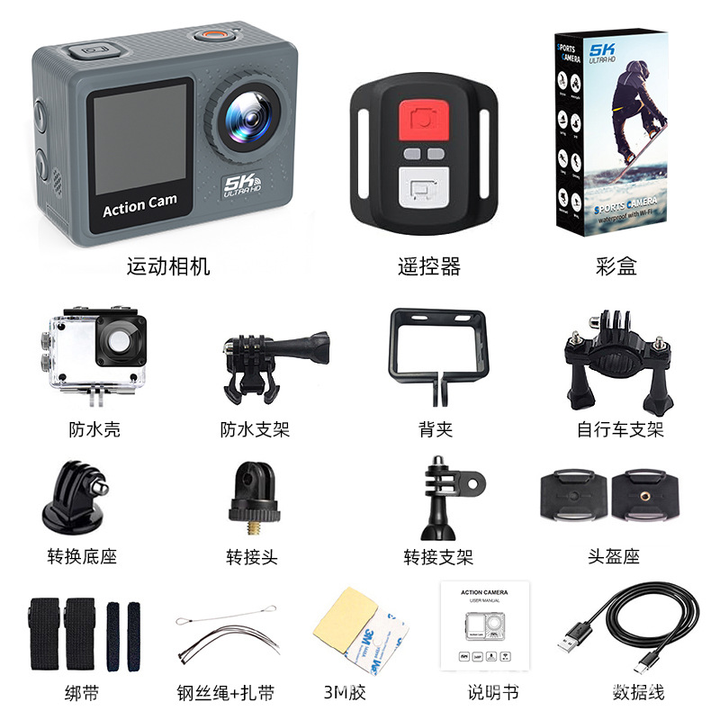 야외 방수 스포츠 카메라 5K HD 안티 쉐이크 원격 제어 듀얼 스크린 카메라 미니 스포츠 카메라 공장 재고