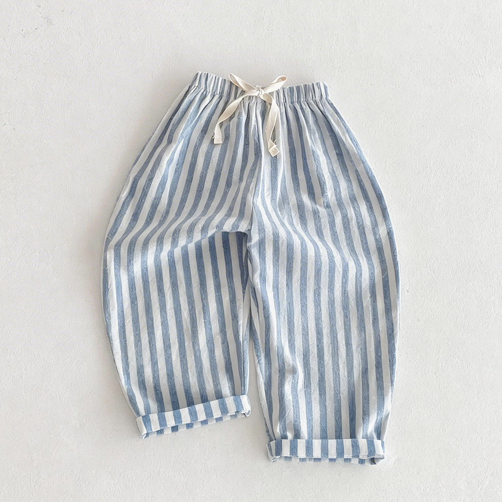 Ins 한국 봄, 여름 소년 린넨 코튼 세로 스트립 통기성 바지 레이스 업 스트레이트 바지 소년과 소녀 모기 방지 바지 느슨한 아동 바지