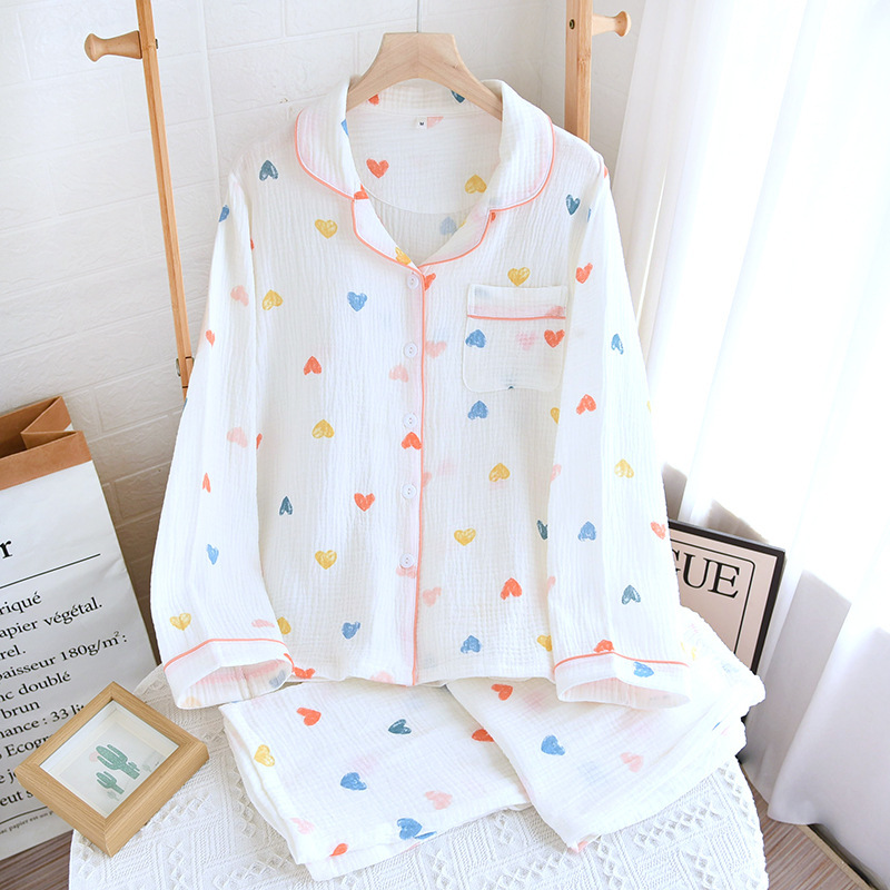 새 봄 여름 가을 면사 여성 잠옷 옷깃 귀여운 작은 복숭아 심장 긴 소매 바지 가정복 세트