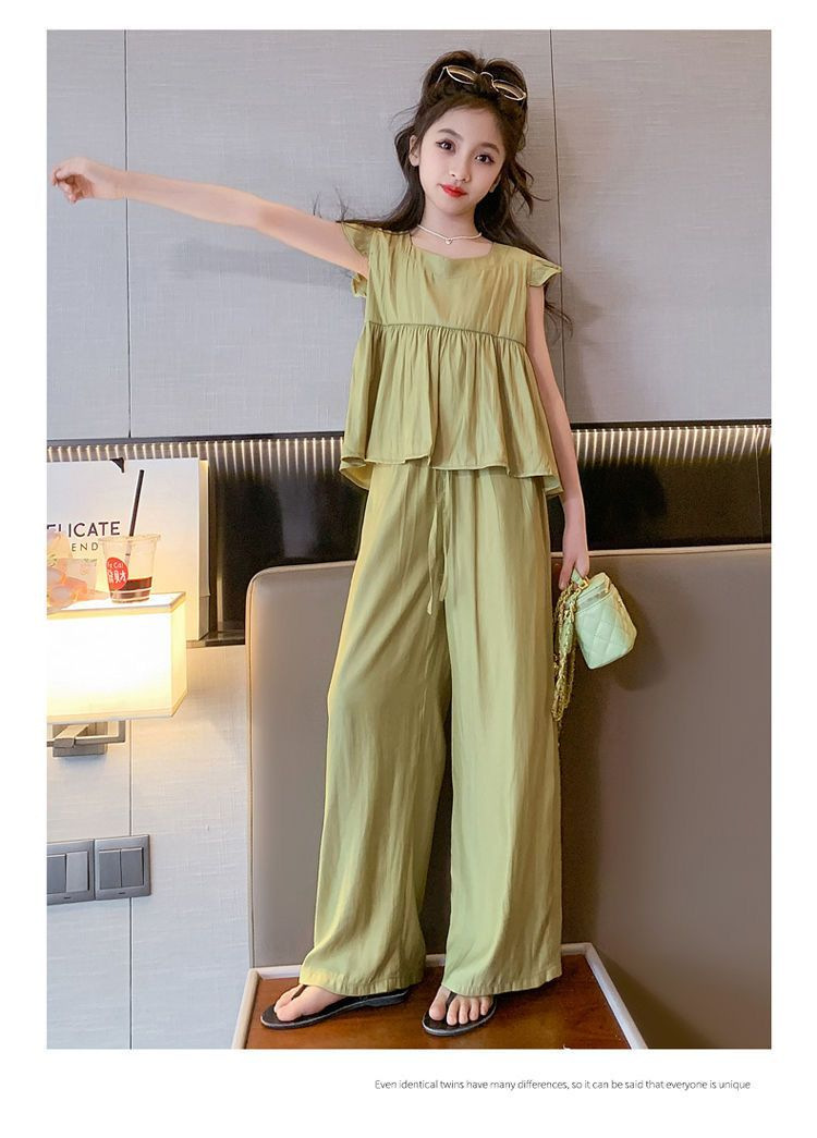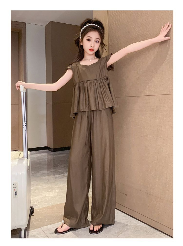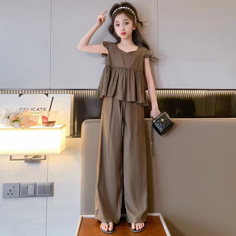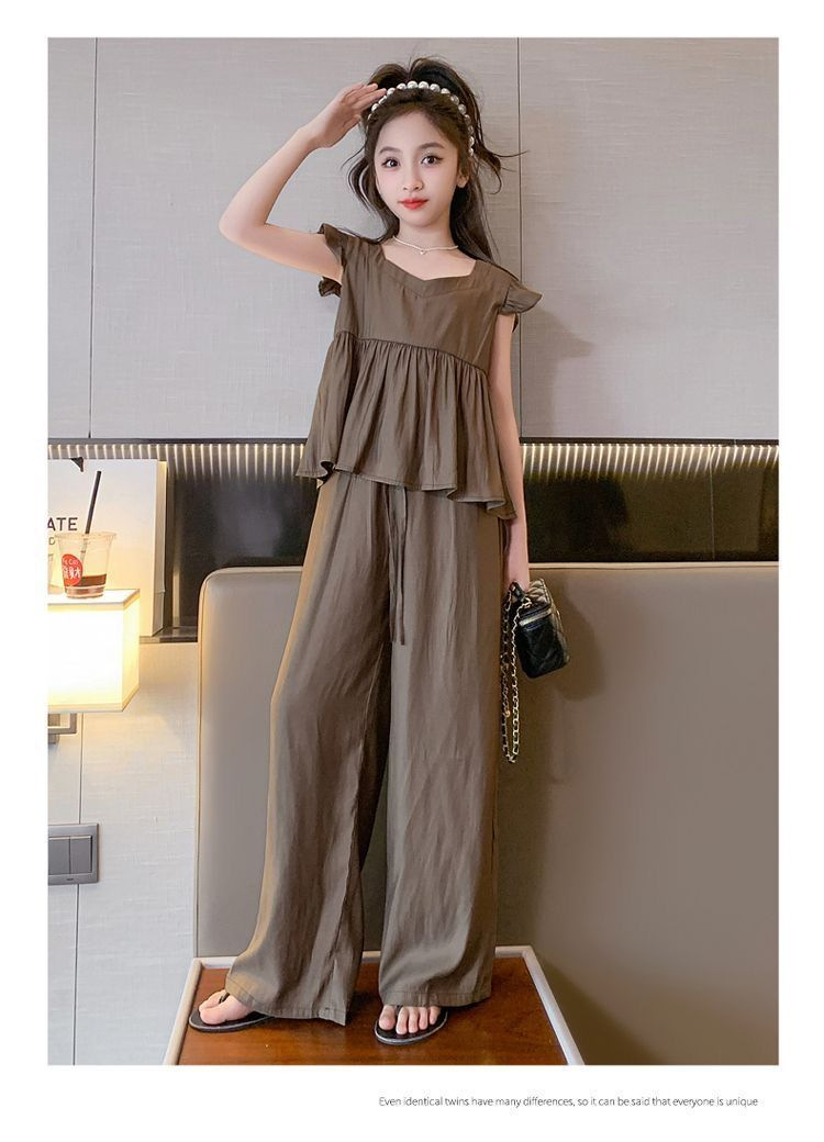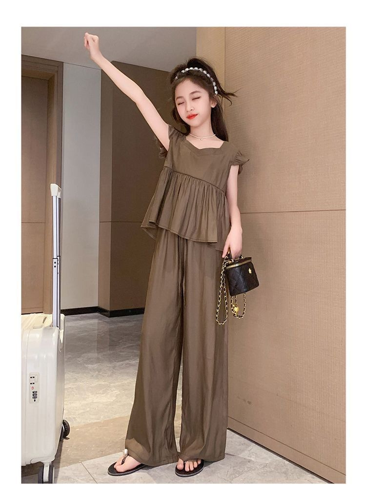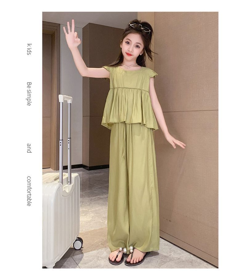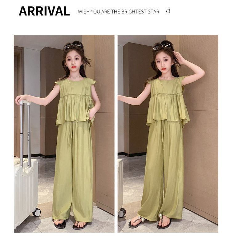 소녀 세트 여름 새로운 미디어와 큰 아이들 느슨한 드레이핑 옷 소녀 캐주얼 탑 와이드 레그 바지 투피스 세트 패션스토어 가기