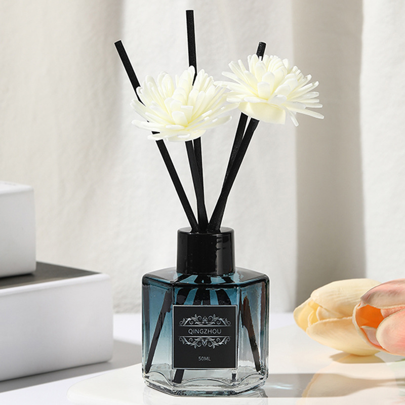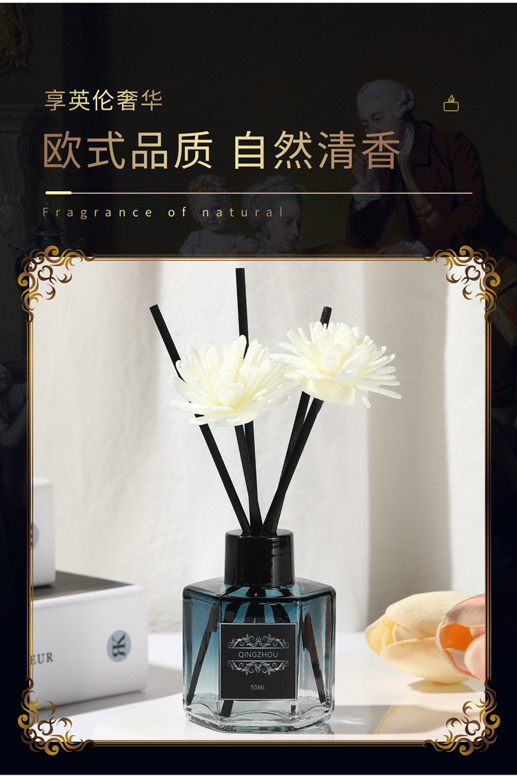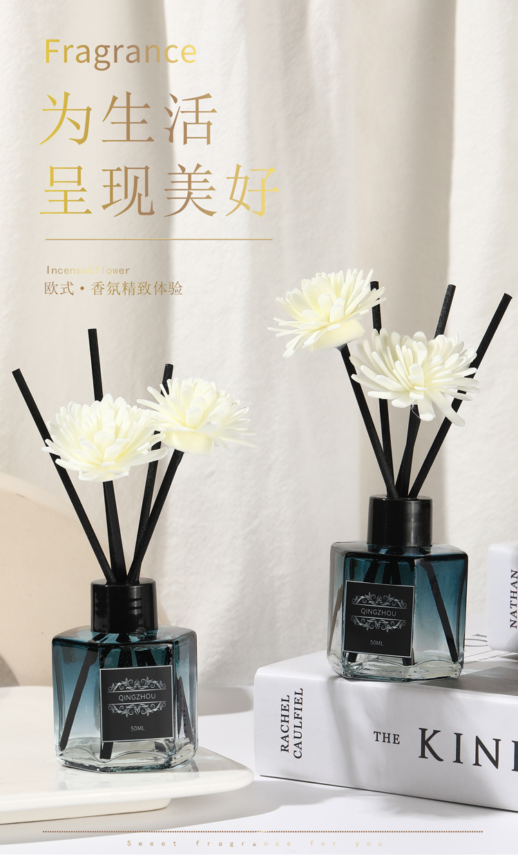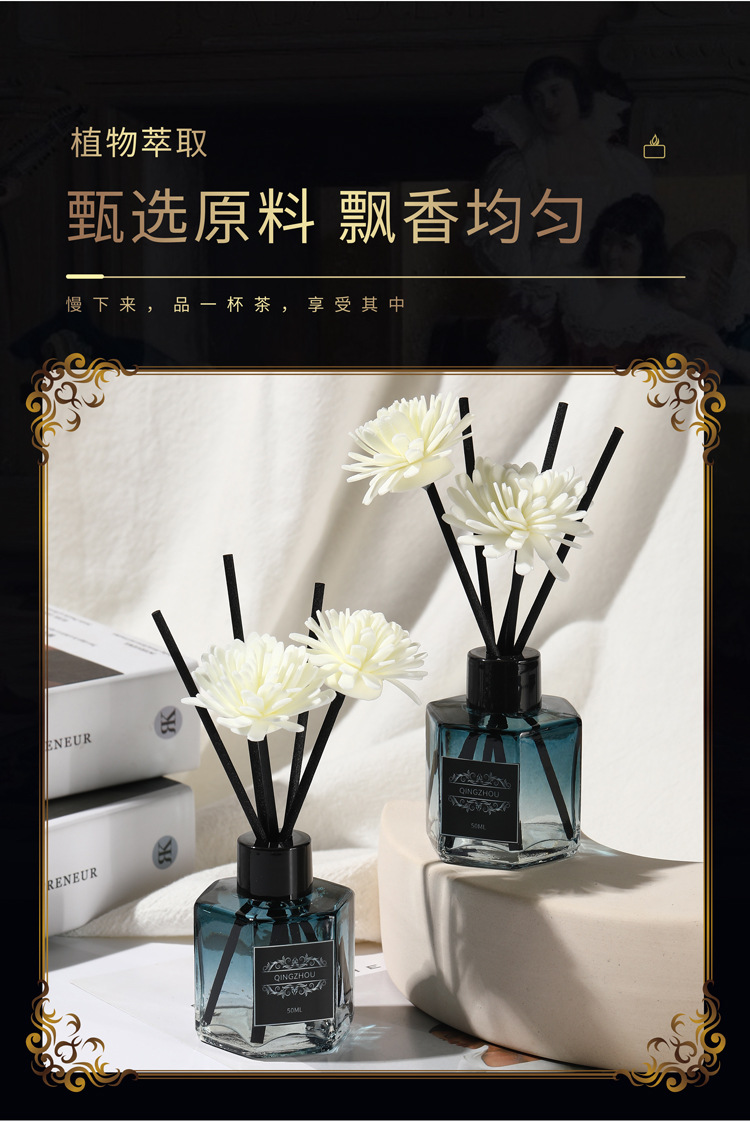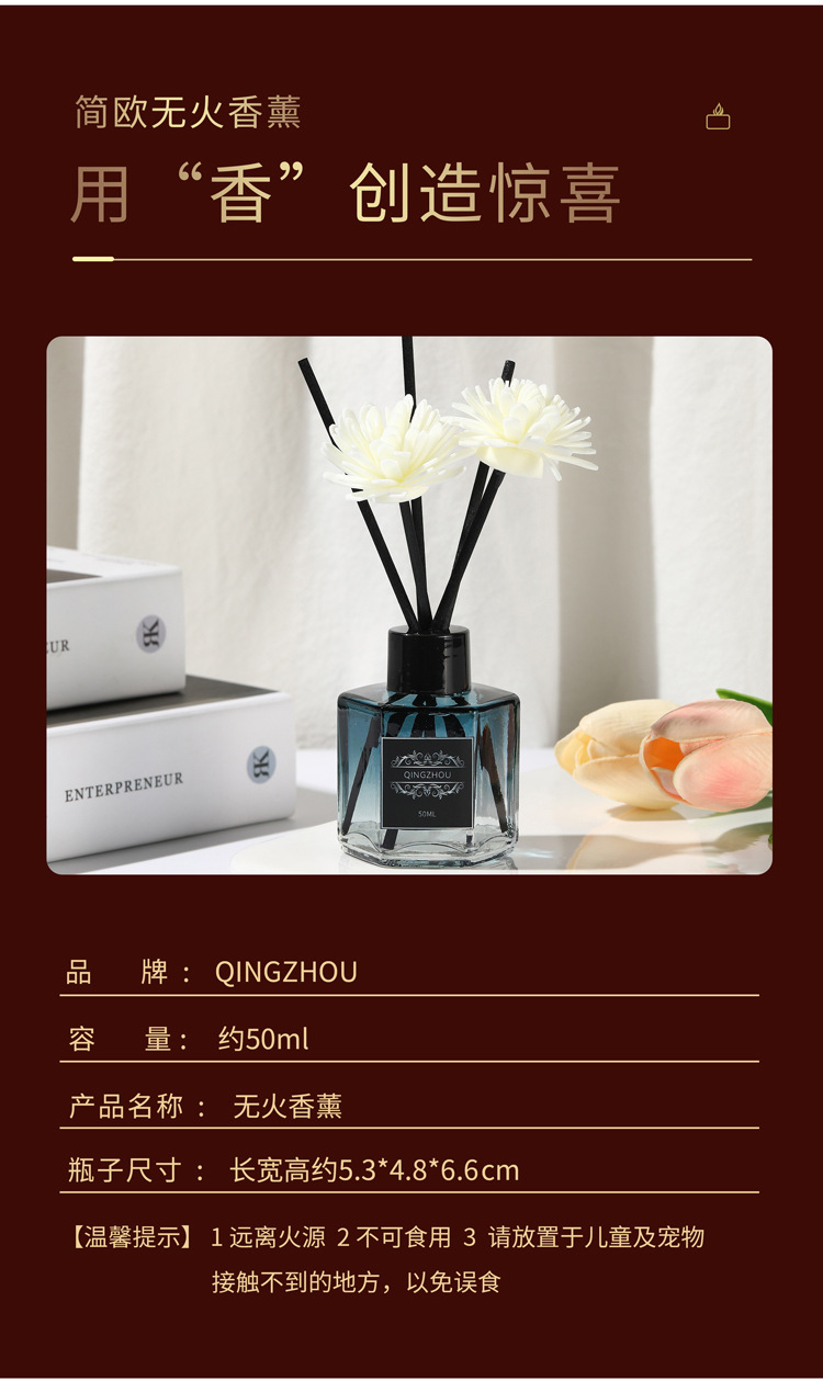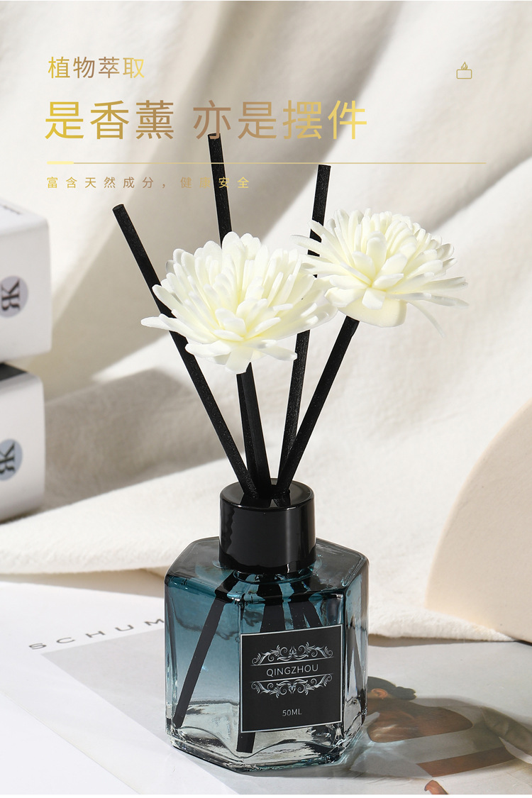 #产品信息:香薰套装(含液体),黑色装饰盖,5根黑色12cm纤维棒,2朵PE花