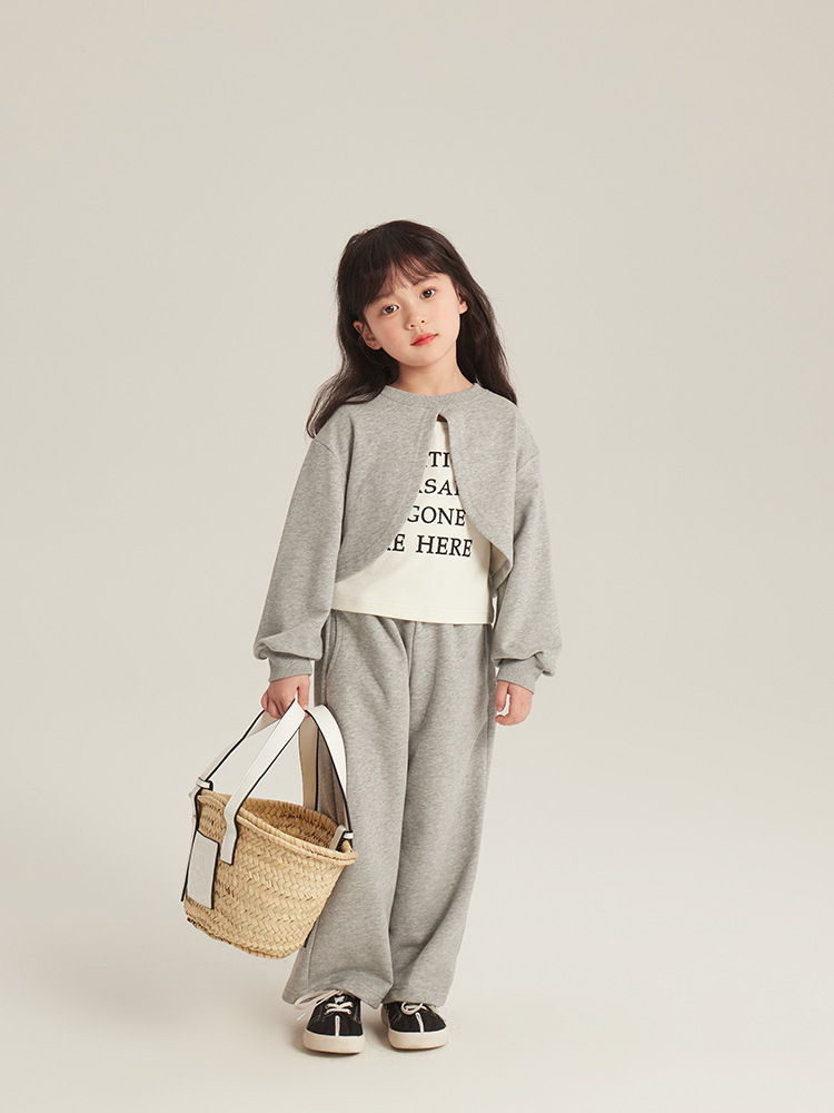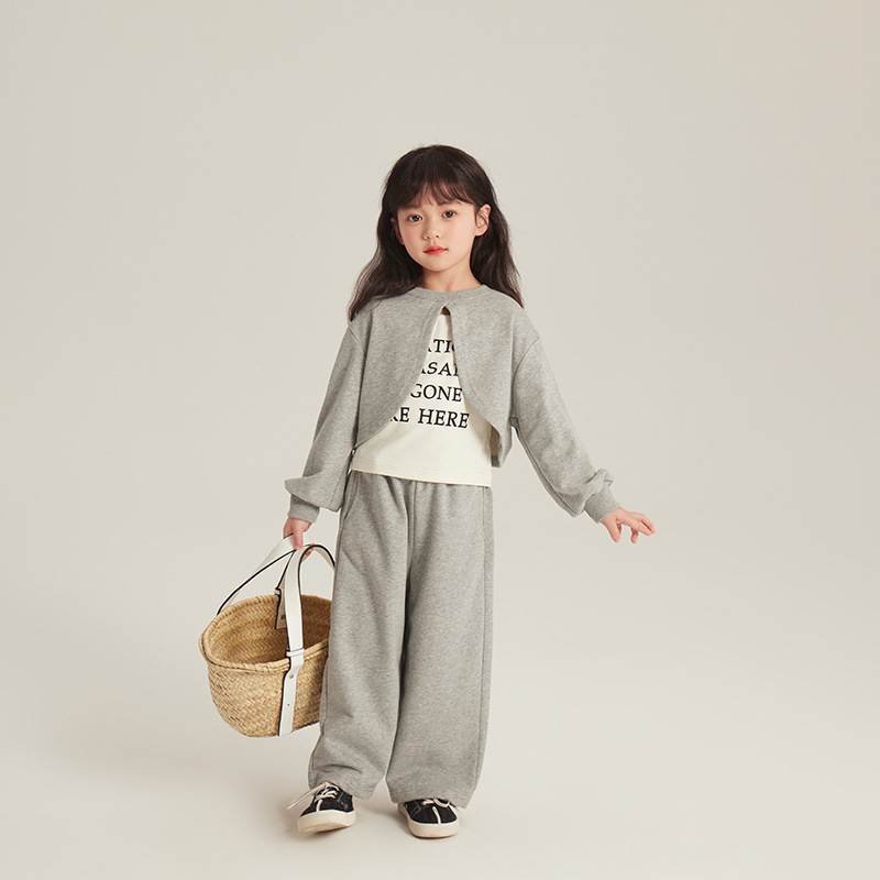 여자 세트 2024 봄 새로운 유행 어린 소녀 캐주얼 짧은 목도리 탑 조끼 바지 3 피스 세트스토어 가기