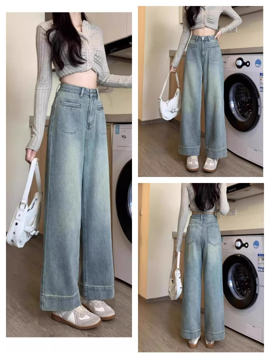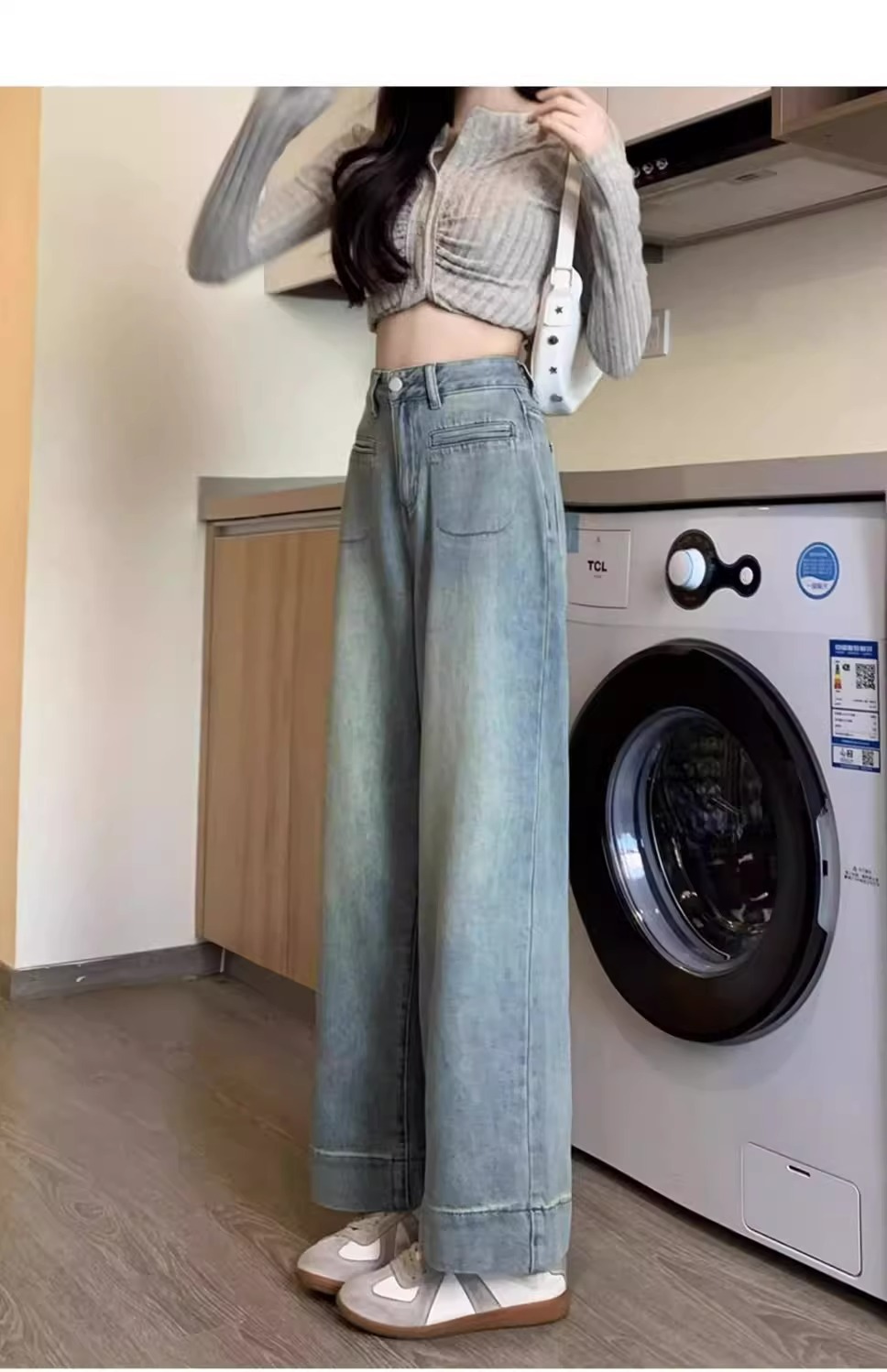 틈새 다재다능한 복고풍 넓은 다리 청바지 봄과 가을 새로운 여성 의류 2024 새로운 높은 허리 슬리밍 느슨한 스트레이트 바지