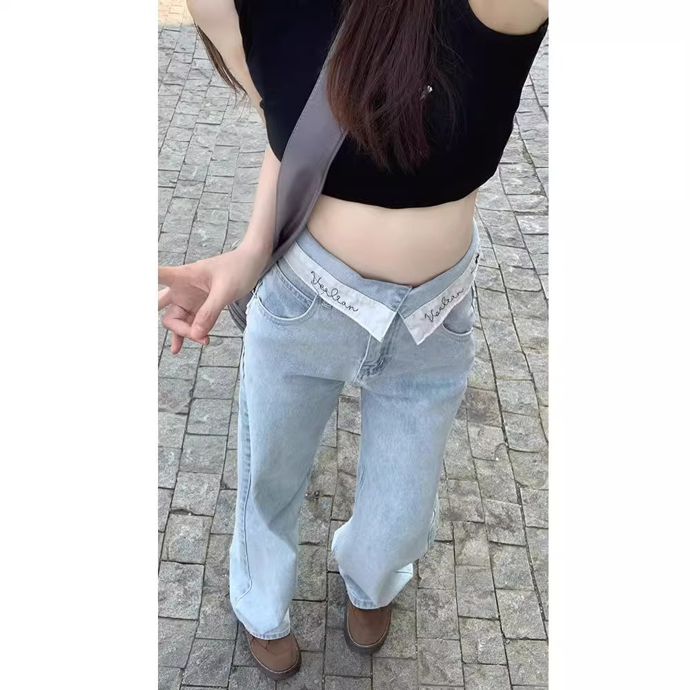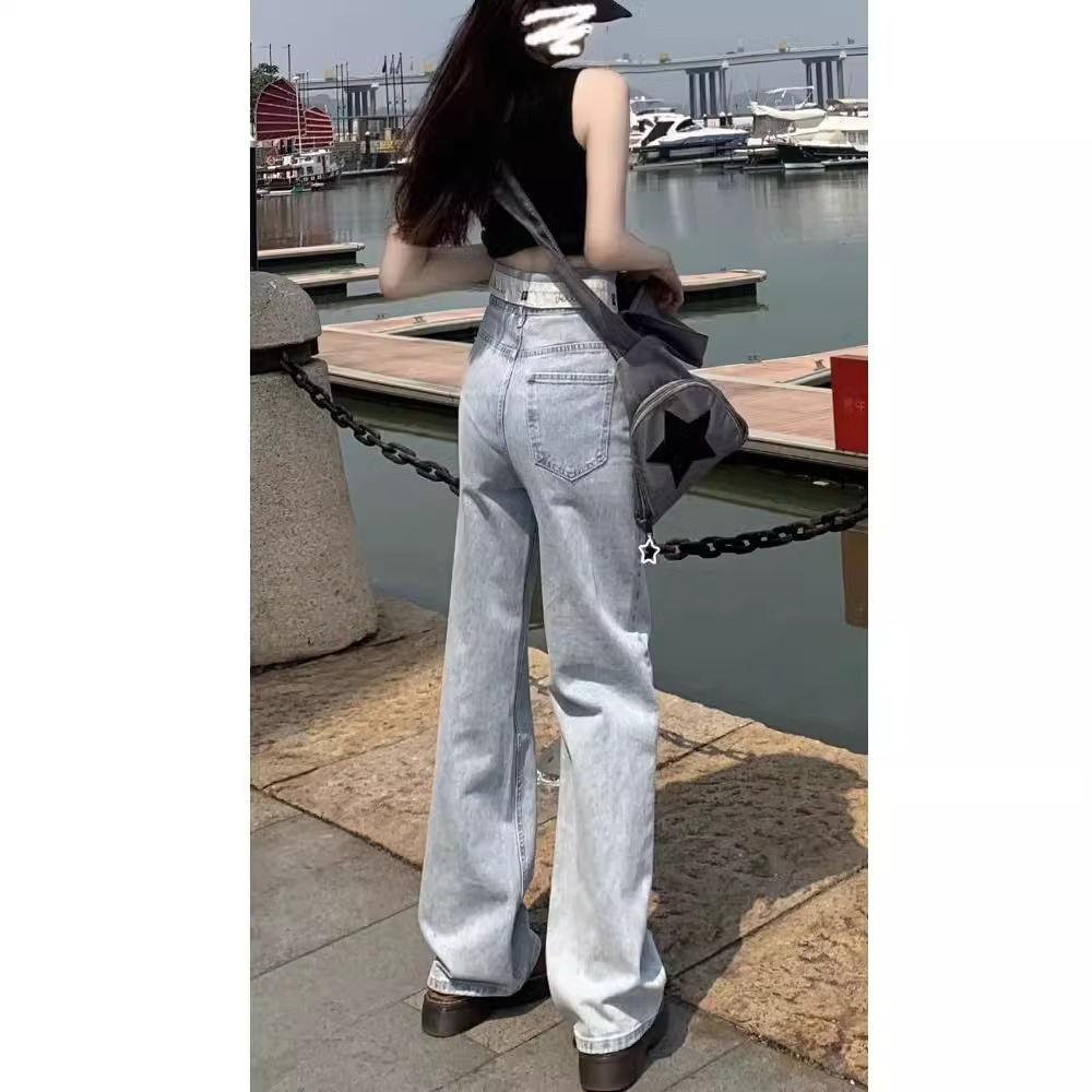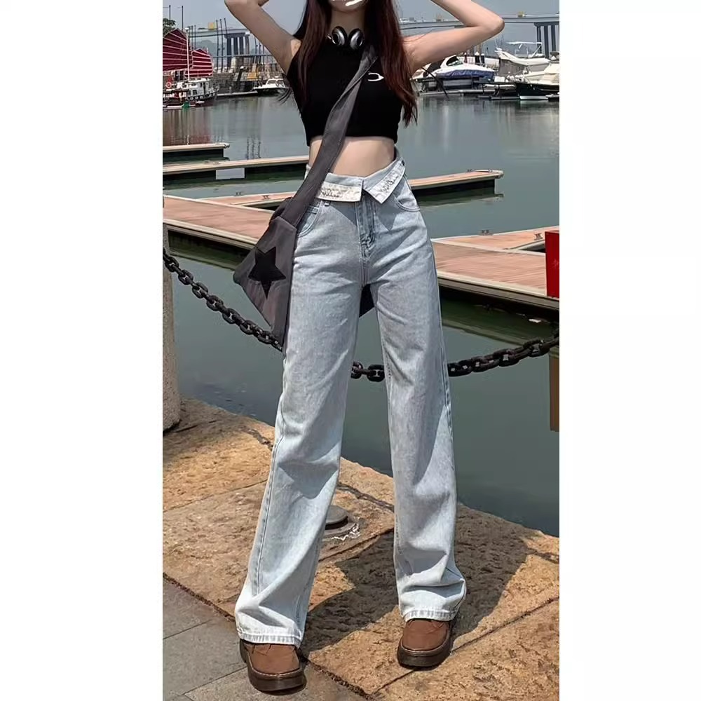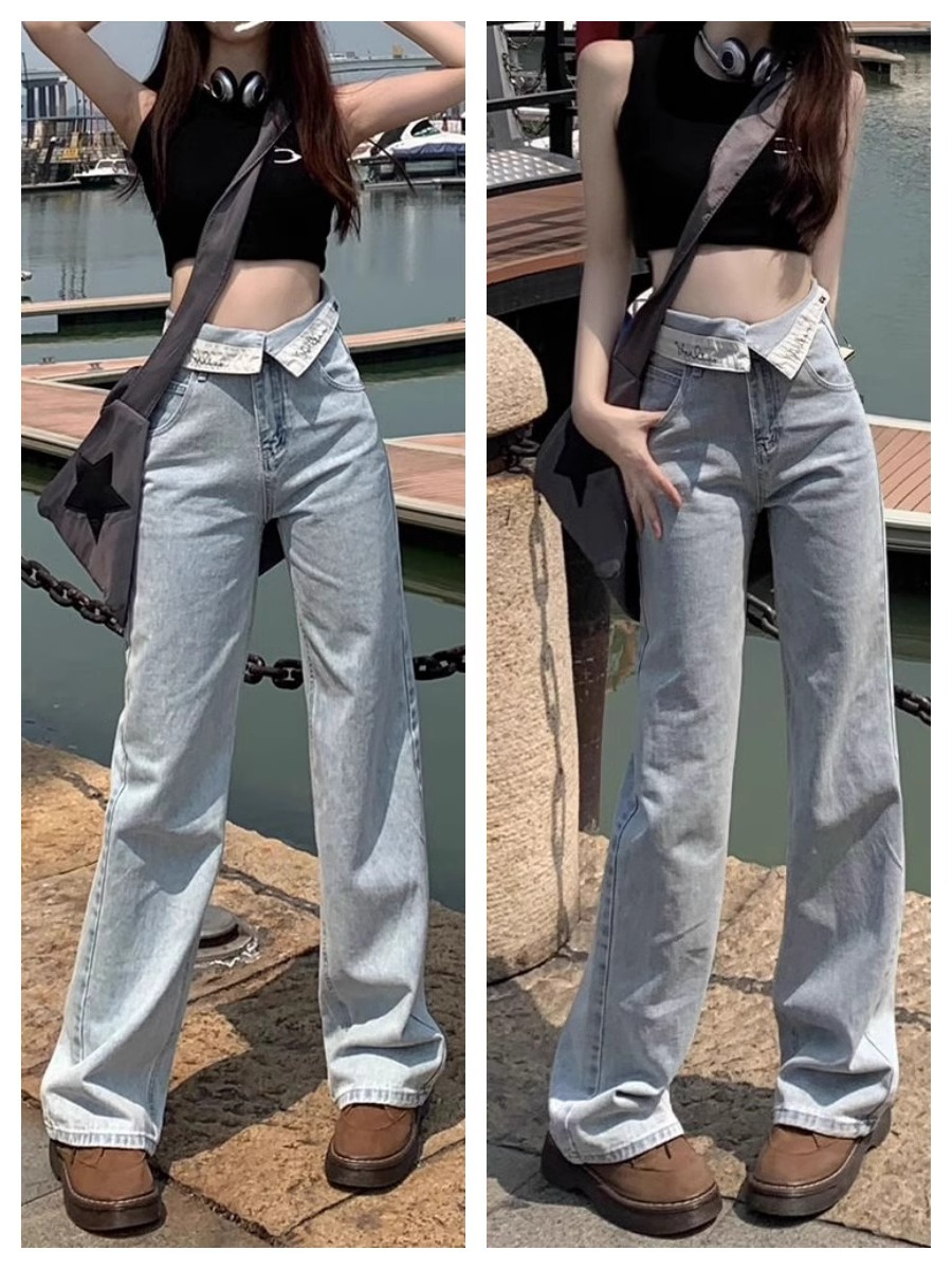 미국식 플랜지 디자인 하이 웨이스트 스트레이트 청바지 여성의 틈새 느슨한 슬리밍 좁은 와이드 레그 팬츠 올 매칭 바지스토어 가기