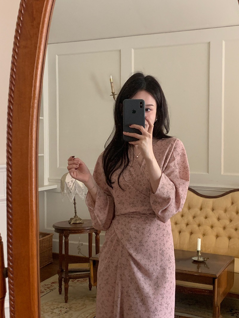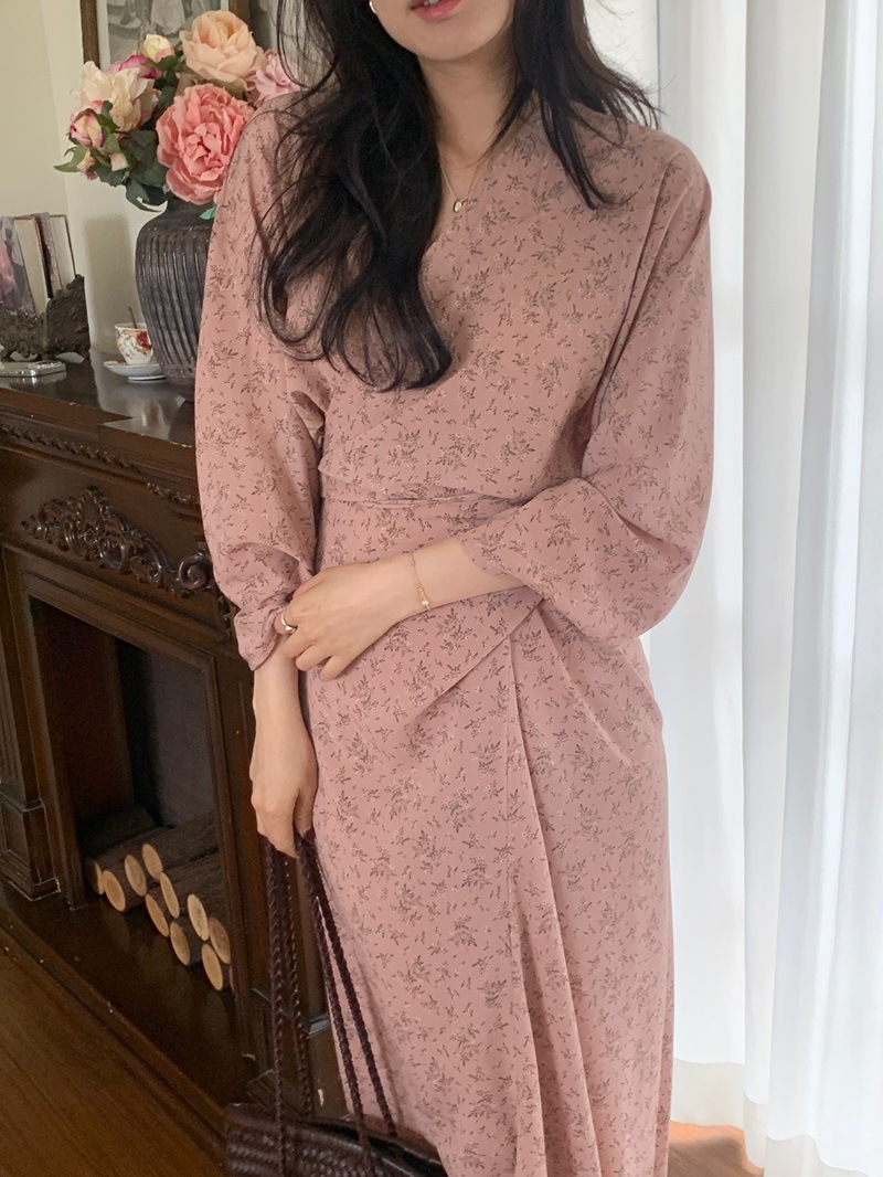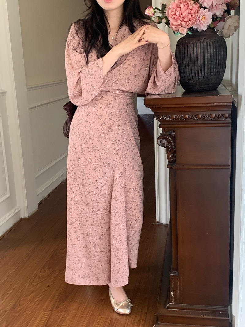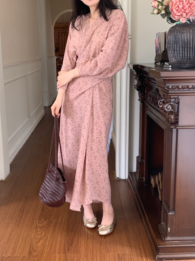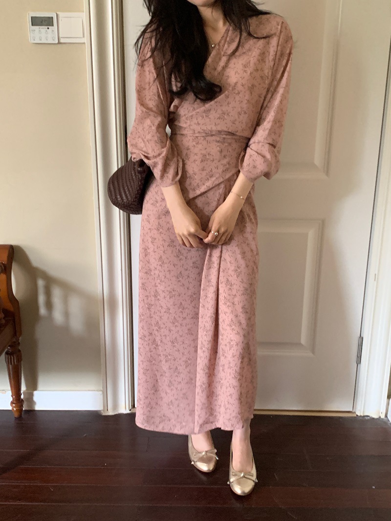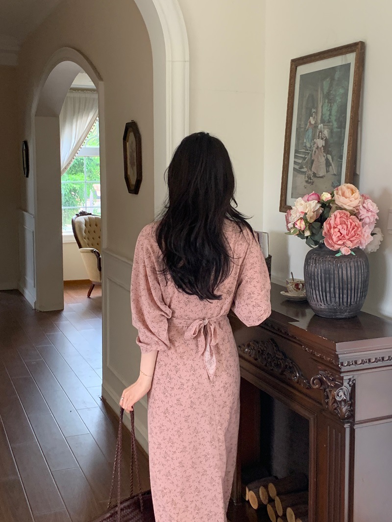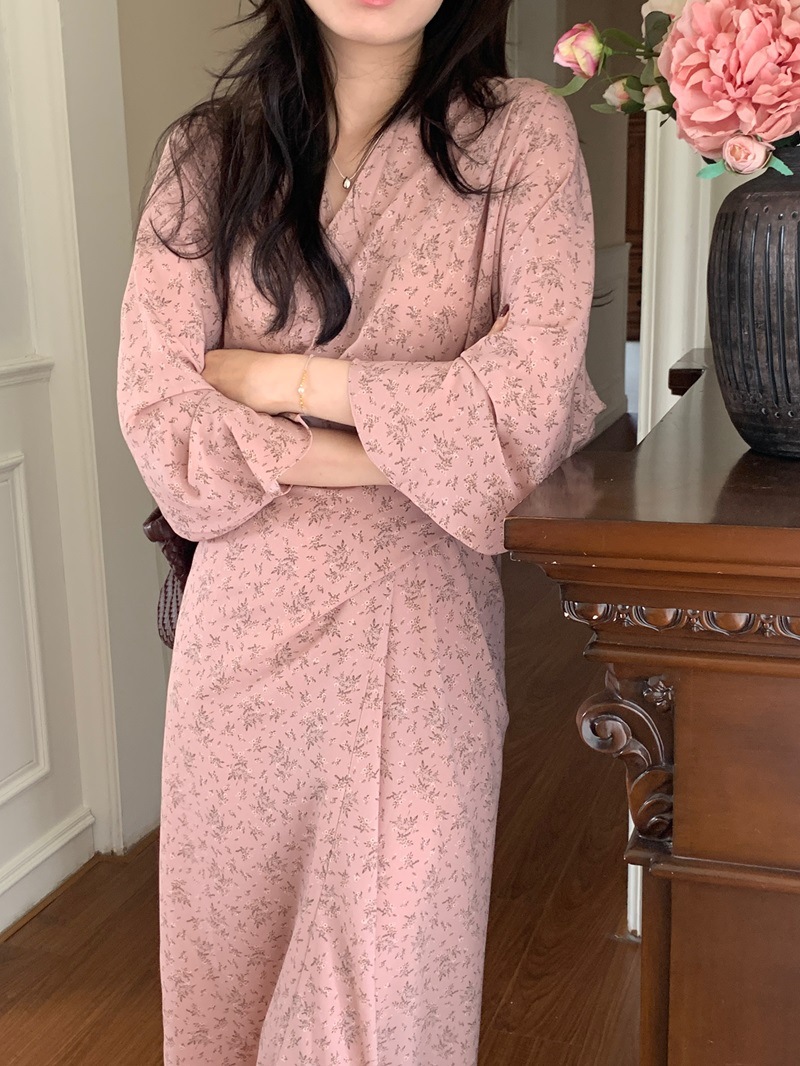 리얼 샷 이른 봄 새로운 복고풍 디자인 크로스 스트랩 V 넥 타이트한 허리 슬리밍 중간 길이의 꽃 원피스 여성스토어 가기