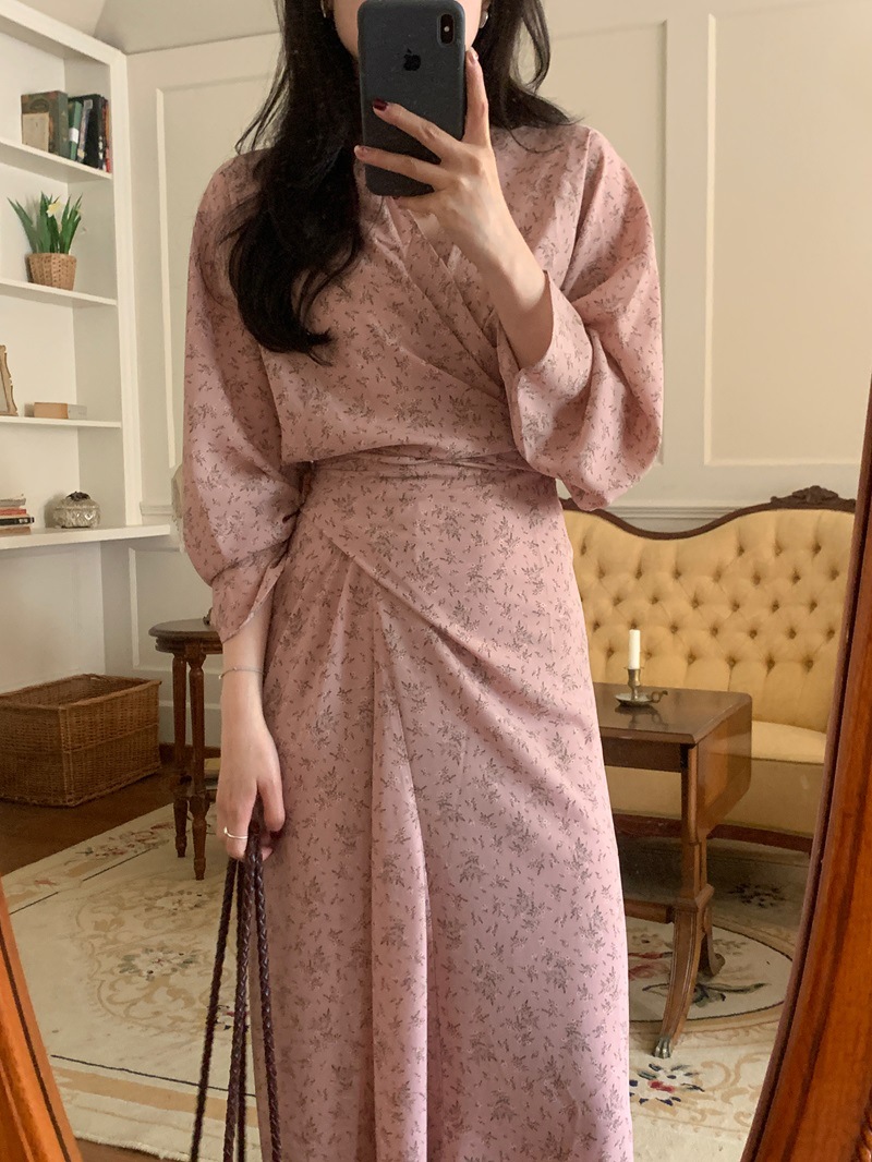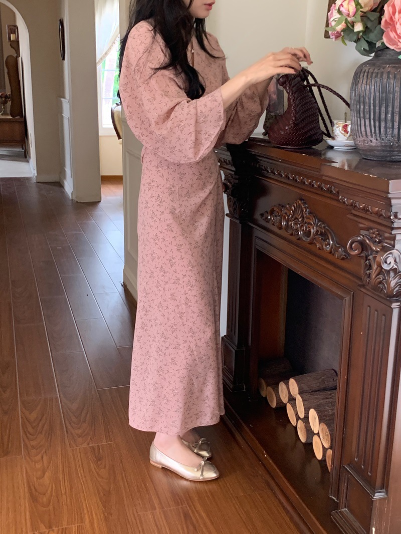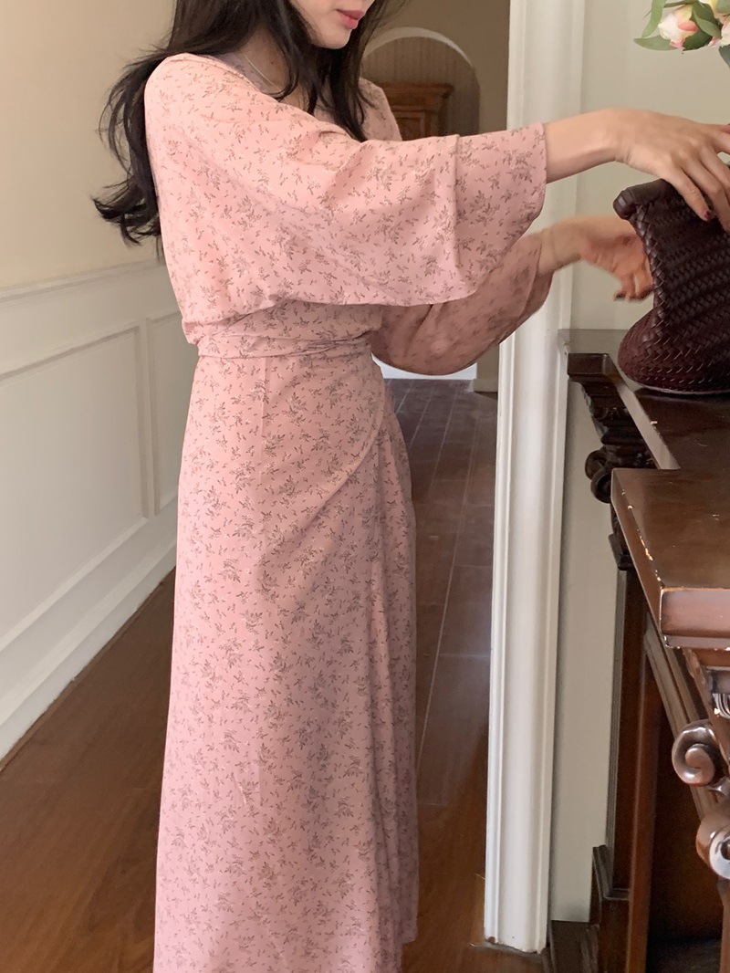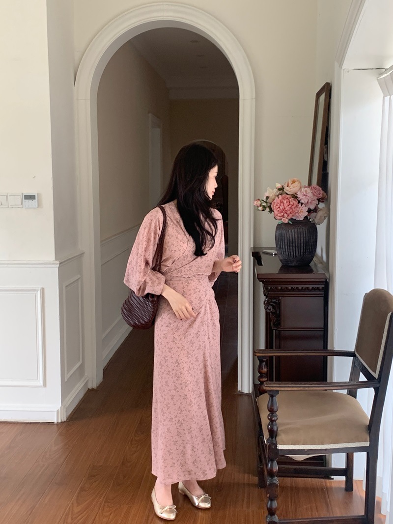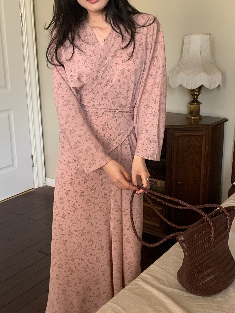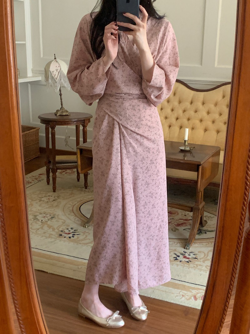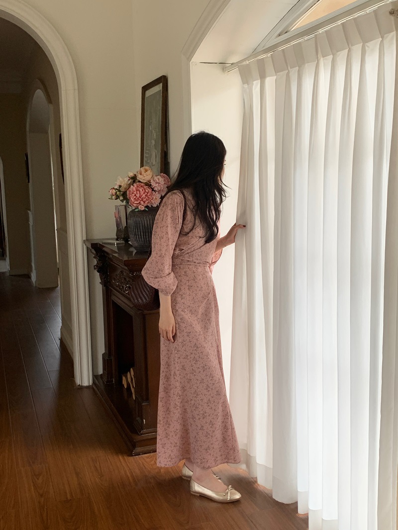 리얼 샷 이른 봄 새로운 복고풍 디자인 크로스 스트랩 V 넥 타이트한 허리 슬리밍 중간 길이의 꽃 원피스 여성스토어 가기
