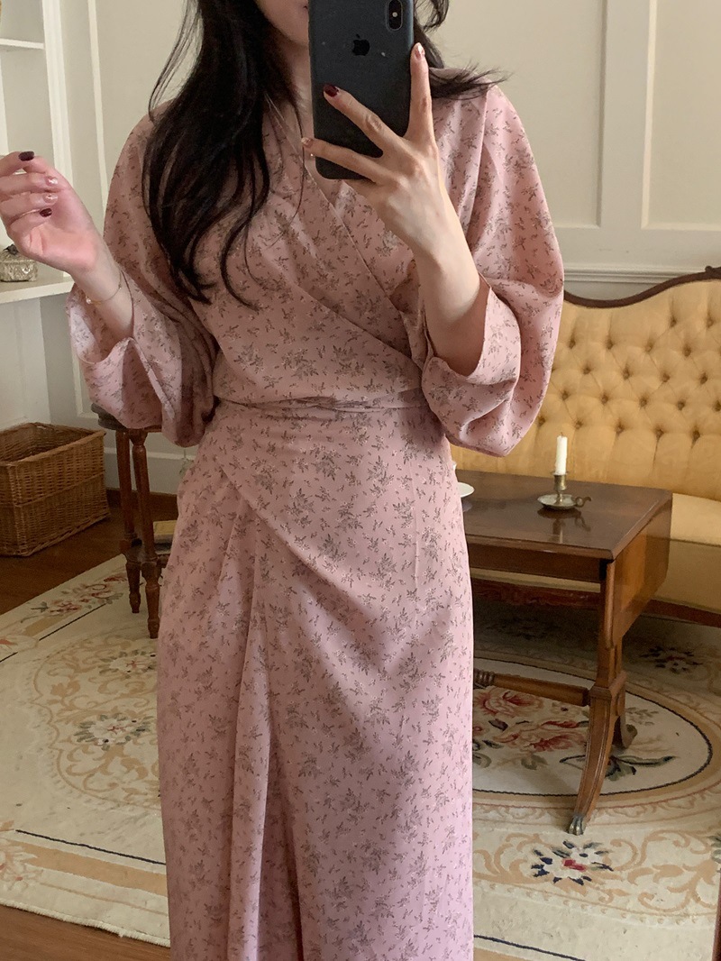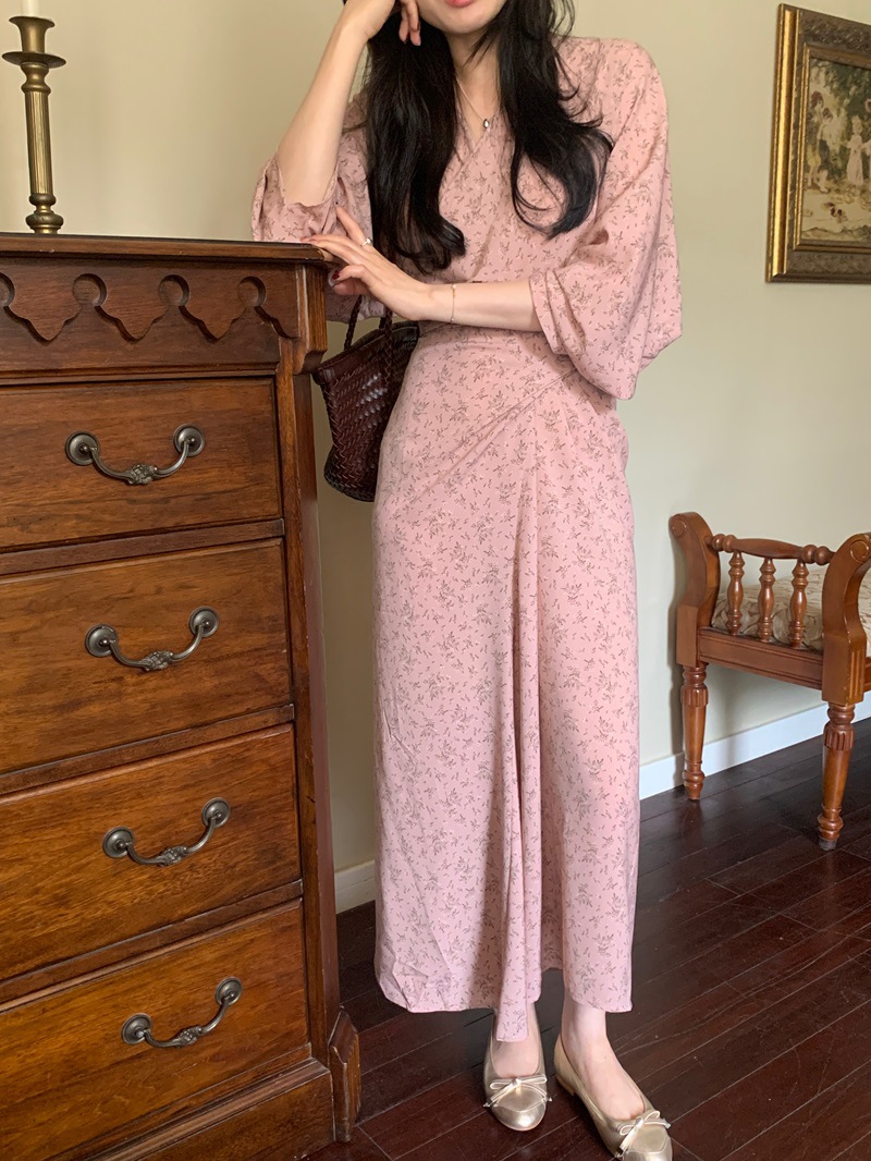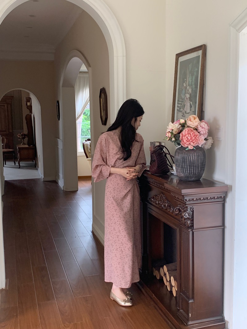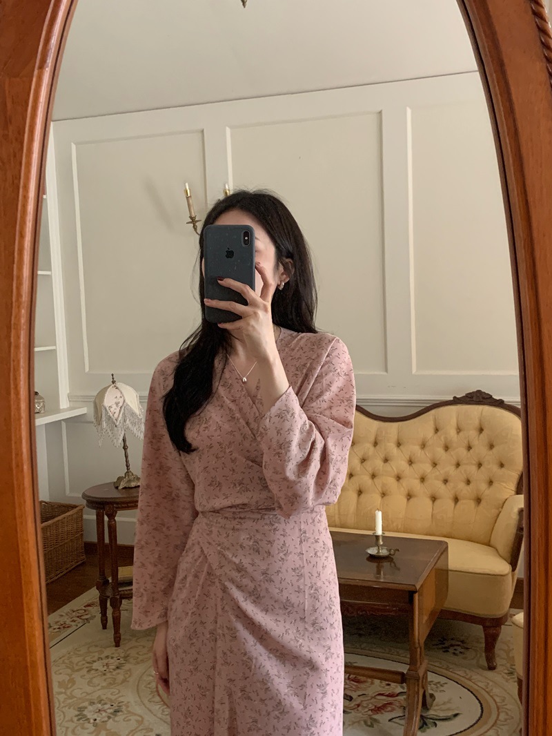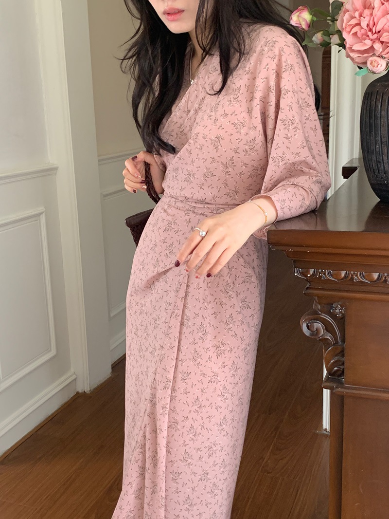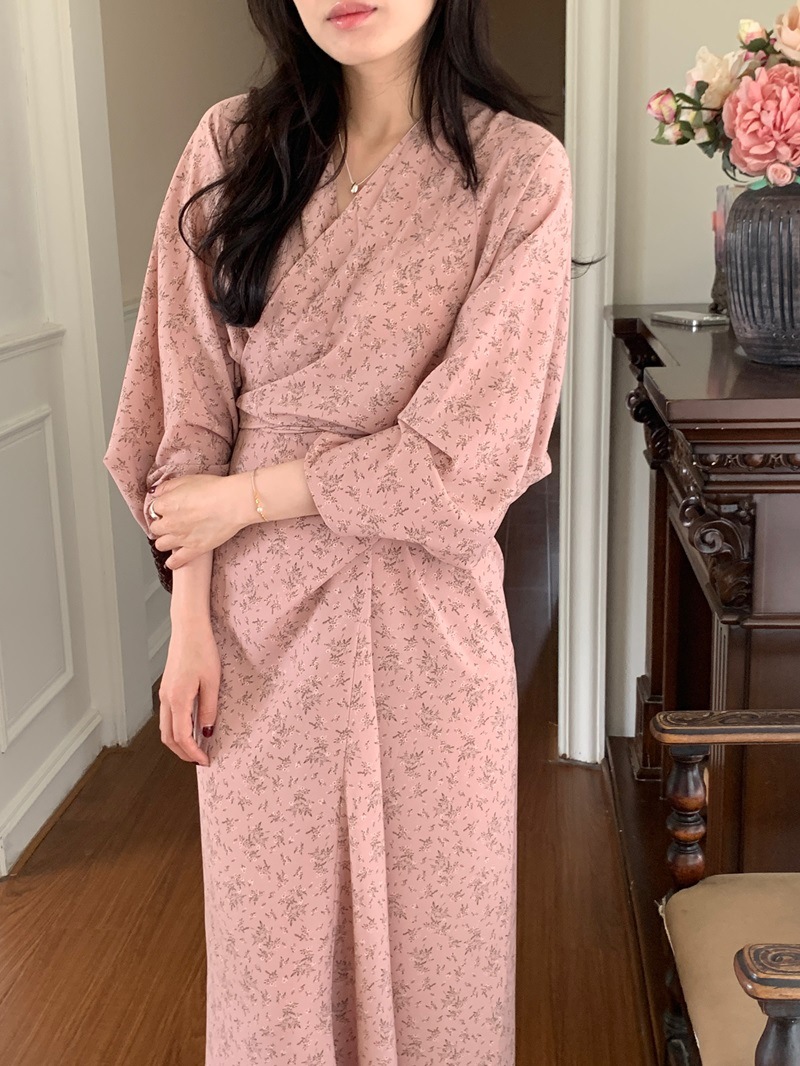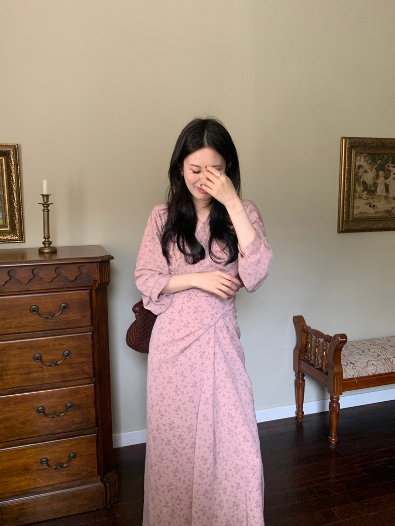 리얼 샷 이른 봄 새로운 복고풍 디자인 크로스 스트랩 V 넥 타이트한 허리 슬리밍 중간 길이의 꽃 원피스 여성스토어 가기