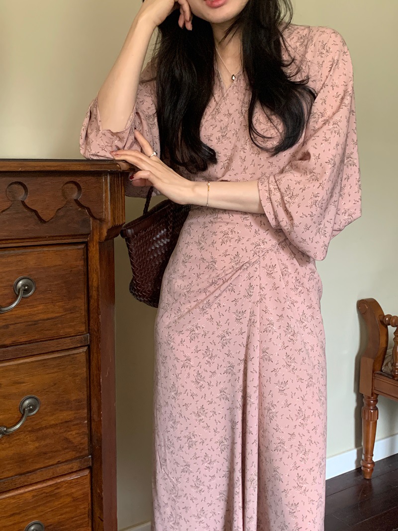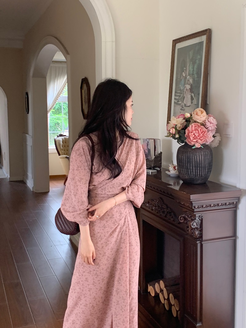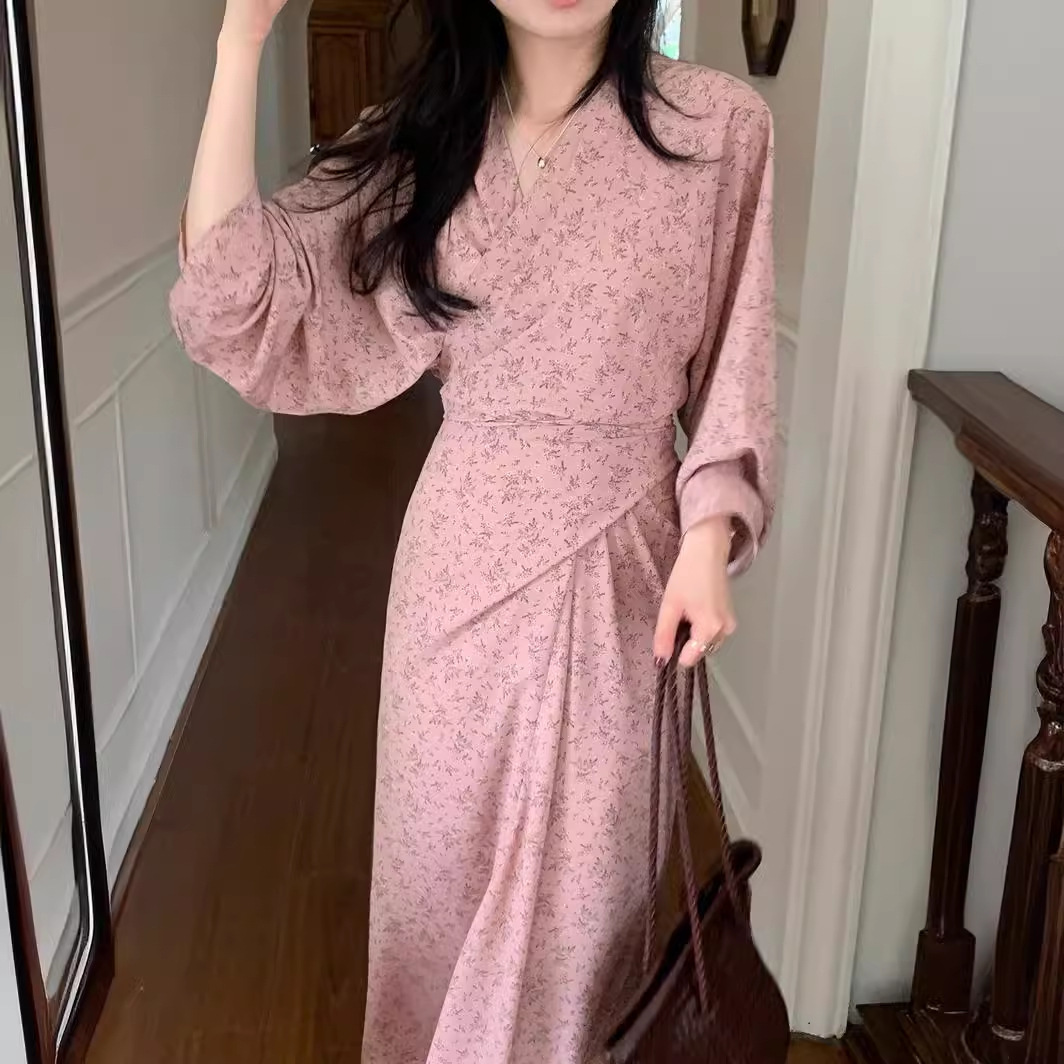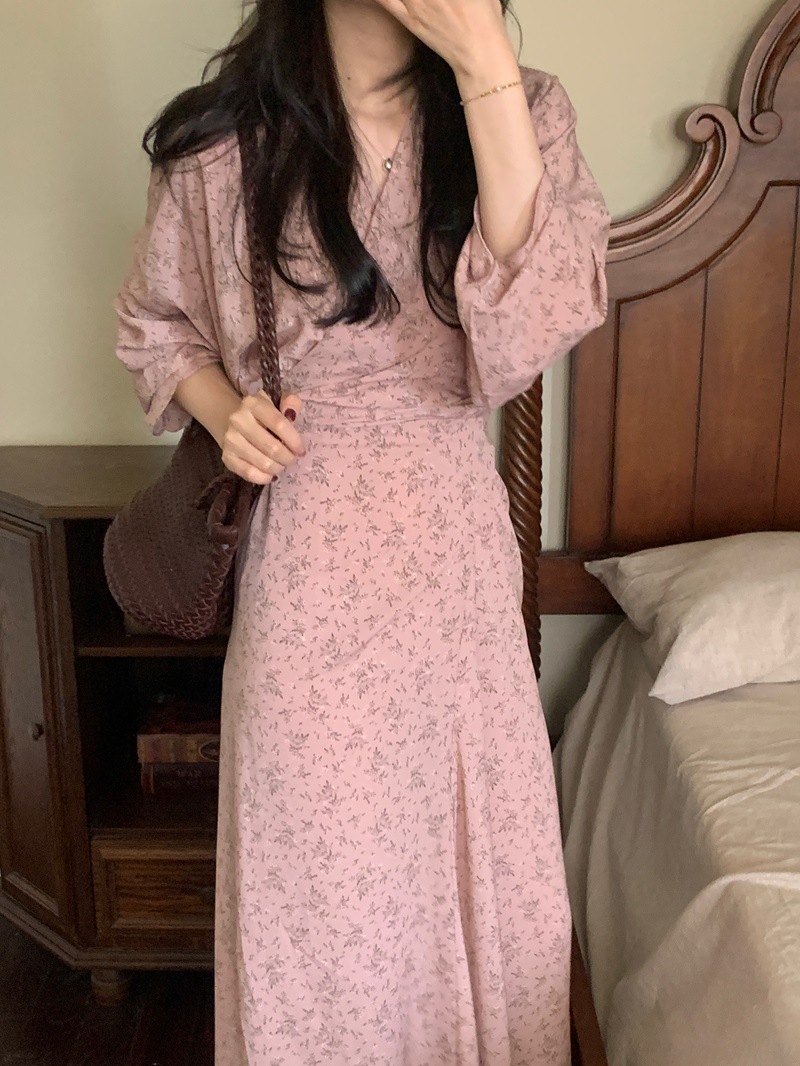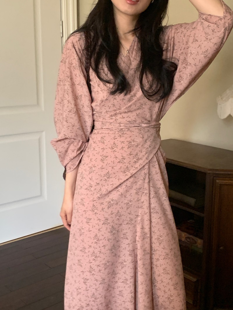 리얼 샷 이른 봄 새로운 복고풍 디자인 크로스 스트랩 V 넥 타이트한 허리 슬리밍 중간 길이의 꽃 원피스 여성