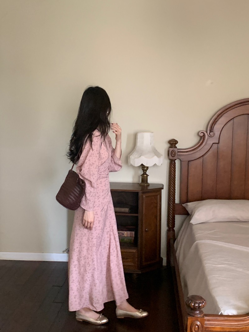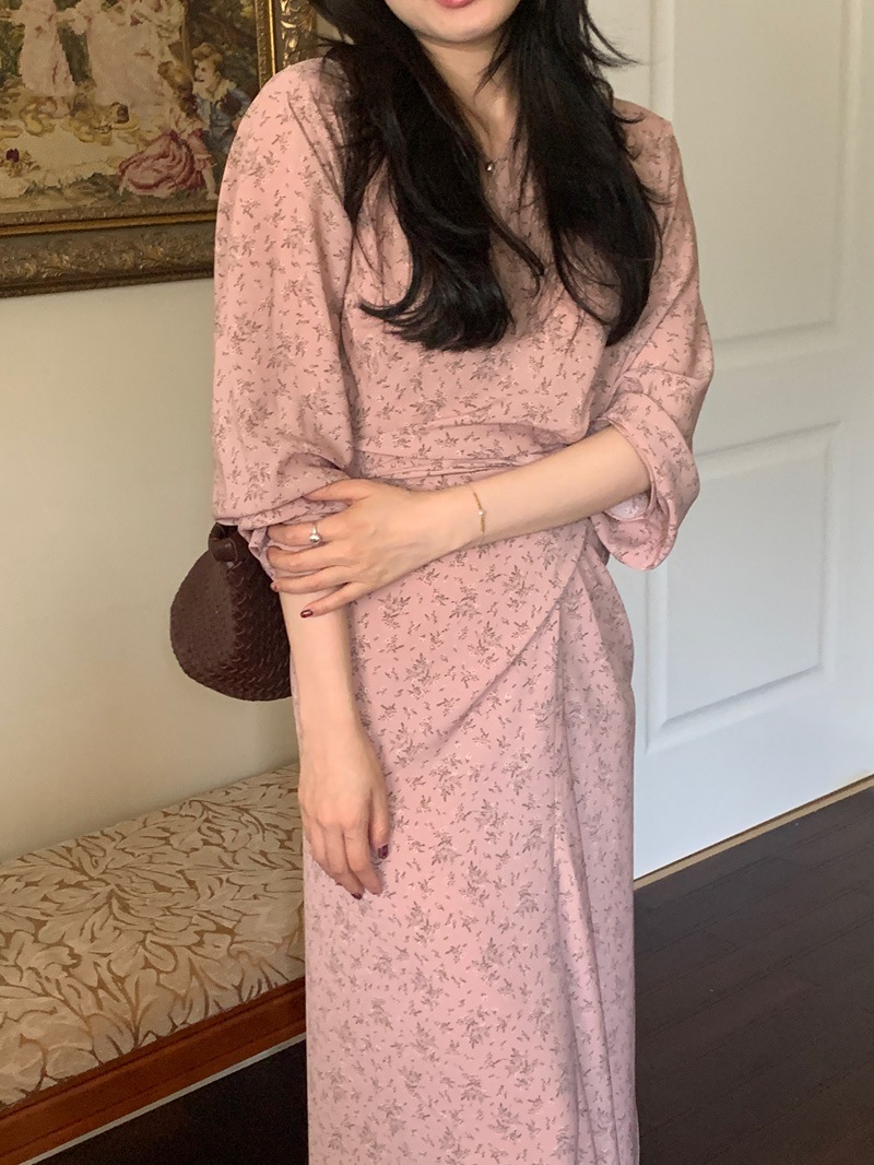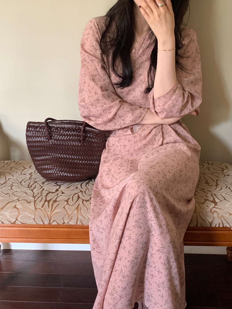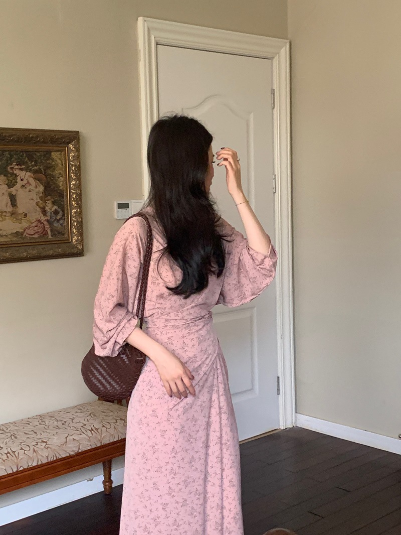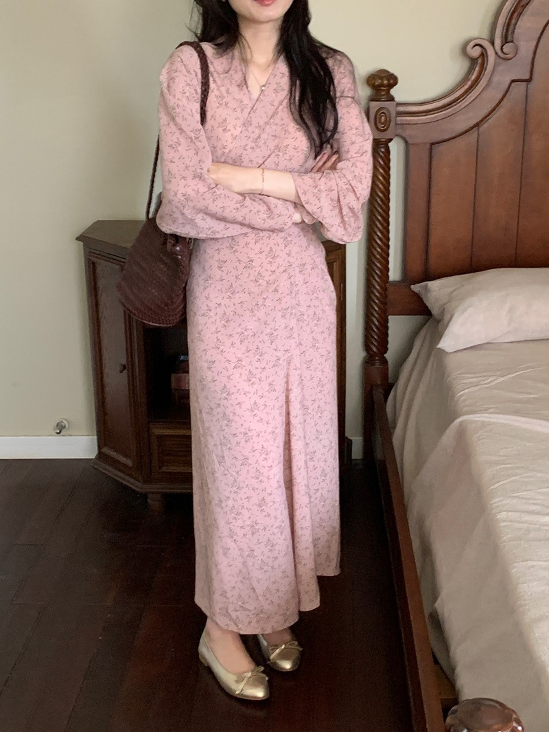 리얼 샷 이른 봄 새로운 복고풍 디자인 크로스 스트랩 V 넥 타이트한 허리 슬리밍 중간 길이의 꽃 원피스 여성