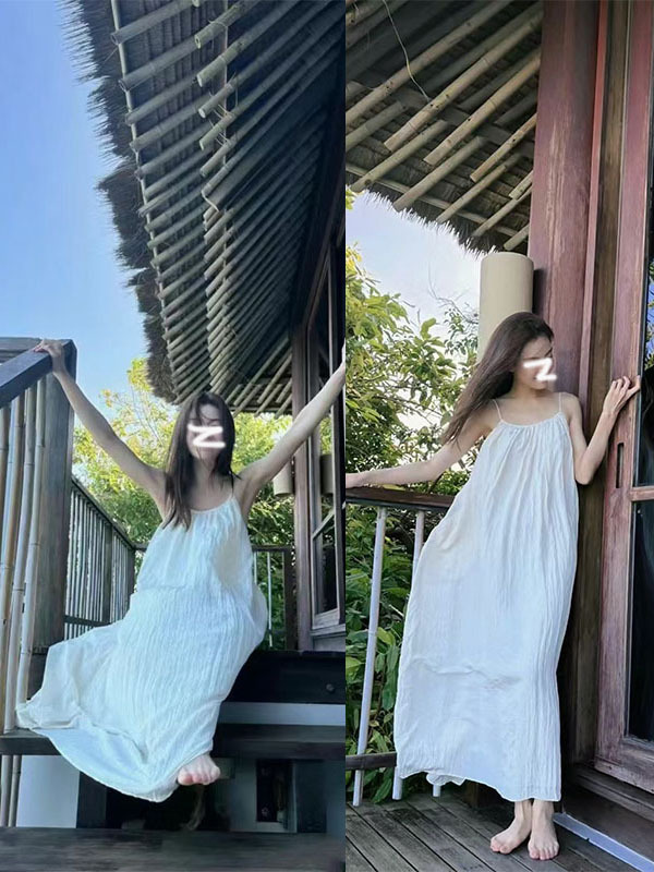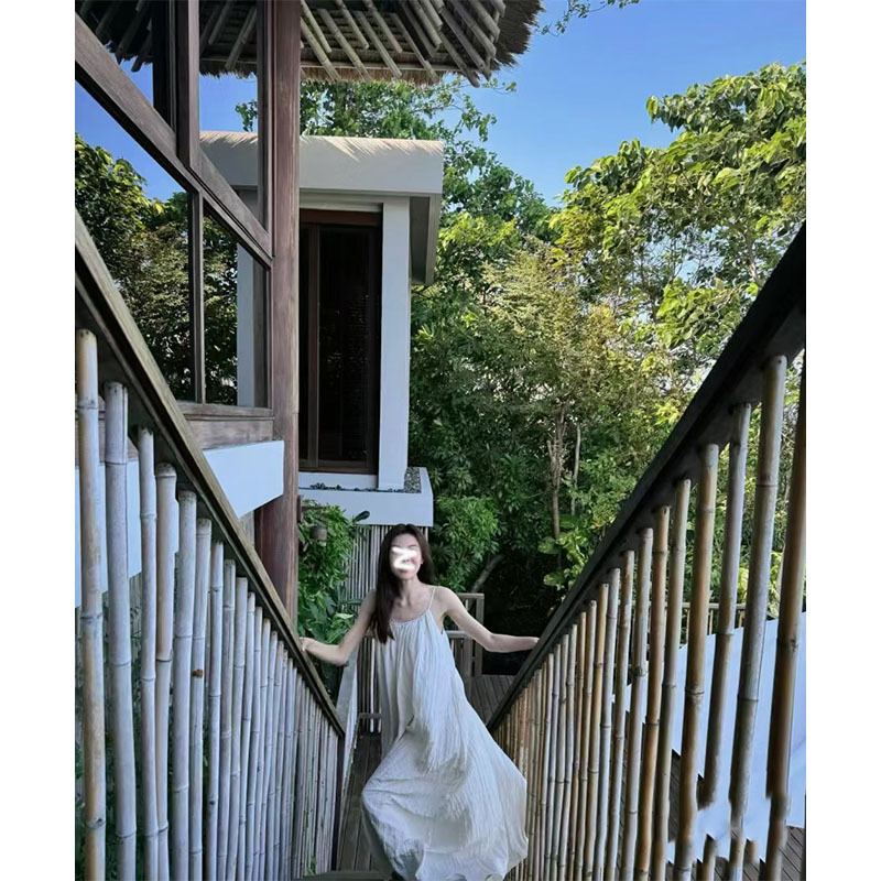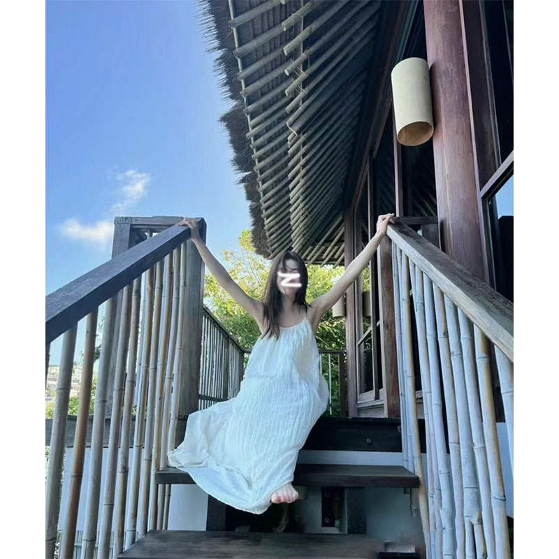 Zhong Chuxi 같은 스타일의 옷 백리스 슬링 주름 원피스 2024 여름 타이트한 허리 고급 느슨한 휴가 원피스스토어 가기