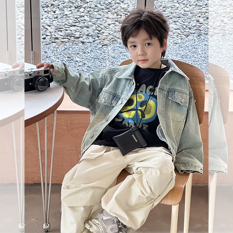 Elmo Beibei 어린이 복고풍 데님 재킷 2025 봄, 가을 소년과 소녀 아기 잘 생긴 짧은 카디건 탑 유행스토어 가기