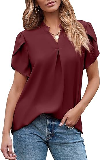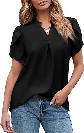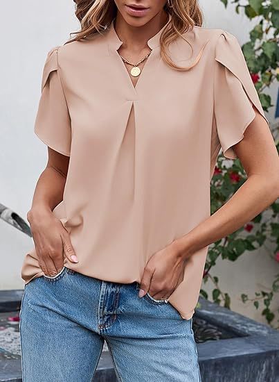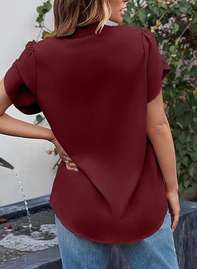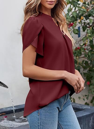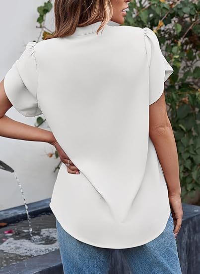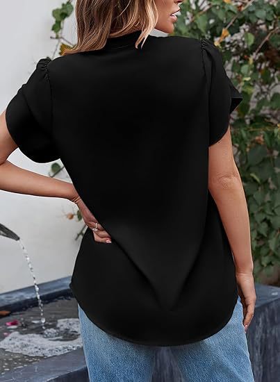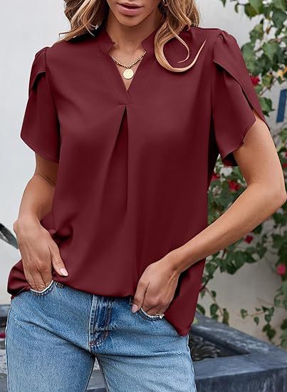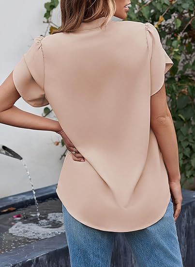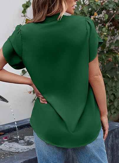 2024 아마존 독립 역 인기 여성 패션 쉬폰 셔츠 V 넥 꽃잎 연꽃 잎 짧은 소매 허리 상단스토어 가기