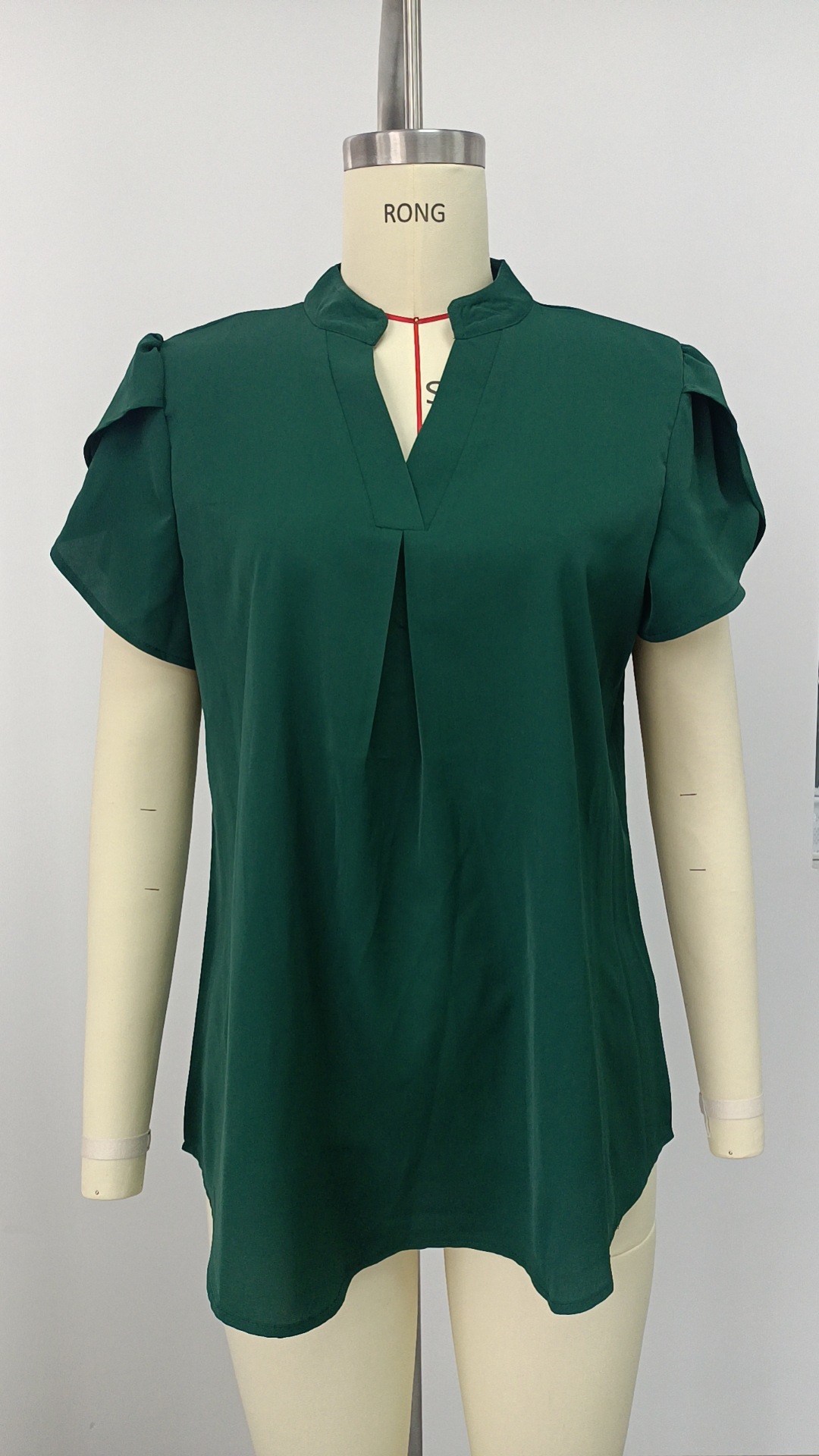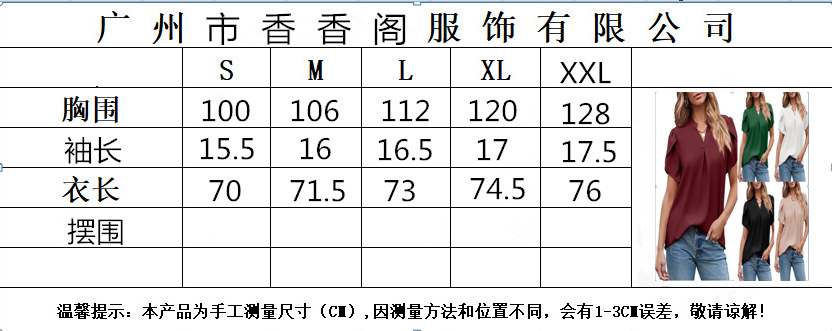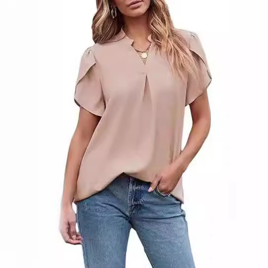 2024 아마존 독립 역 인기 여성 패션 쉬폰 셔츠 V 넥 꽃잎 연꽃 잎 짧은 소매 허리 상단