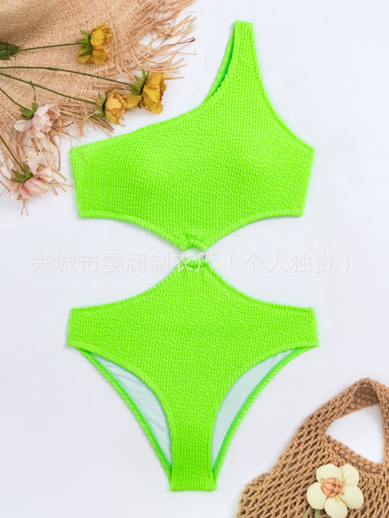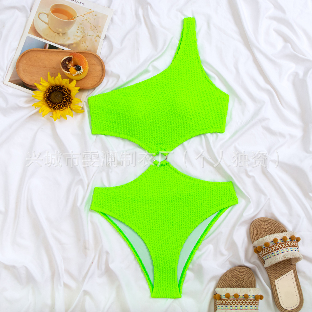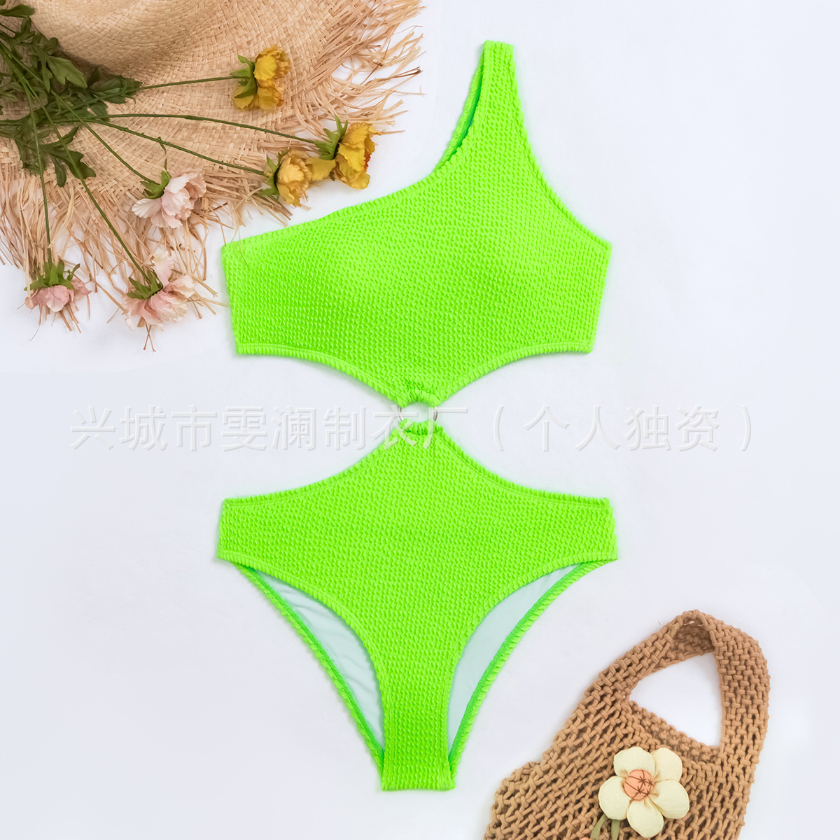 2024 국경 간 여성의 새로운 원피스 수영복 형광 녹색 높은 탄성 슬림 핏 단색 원숄더 유럽과 미국 수영복 도매스토어 가기