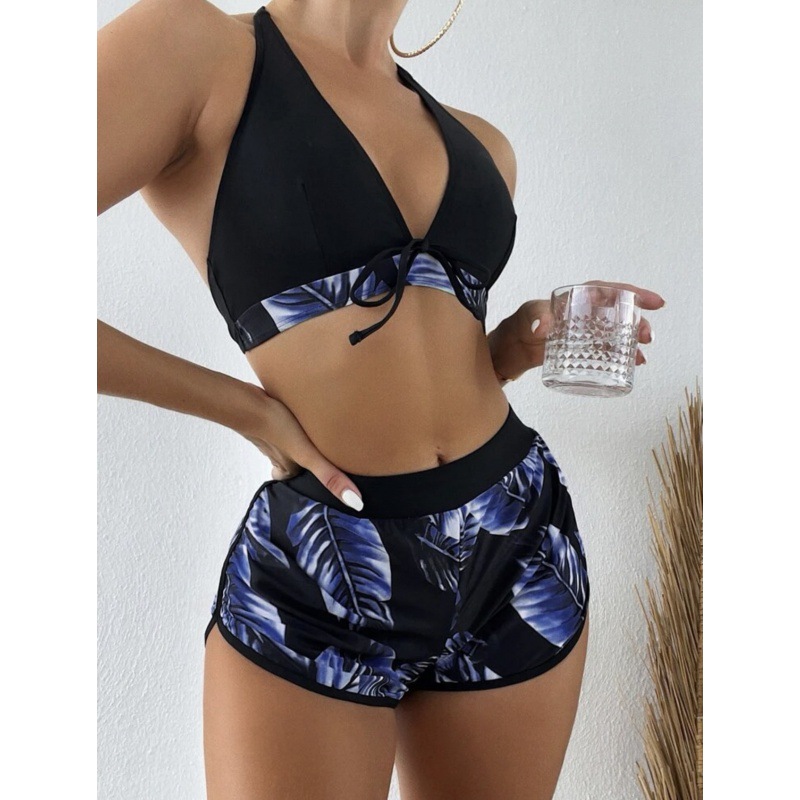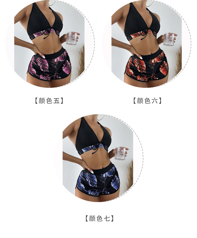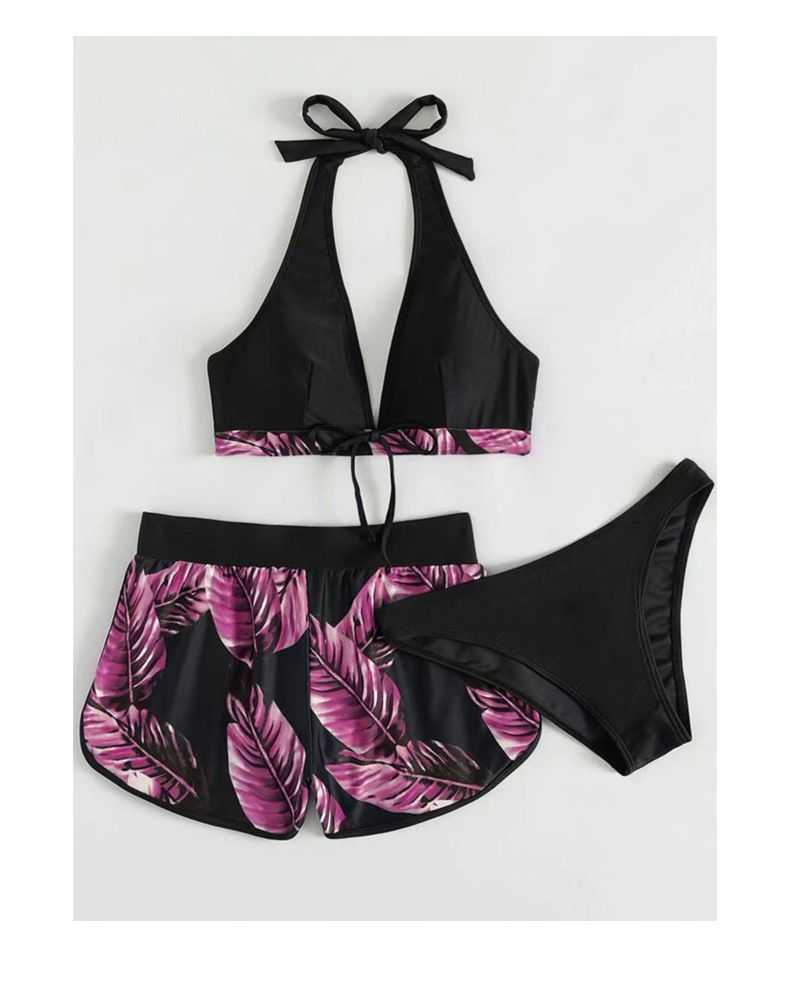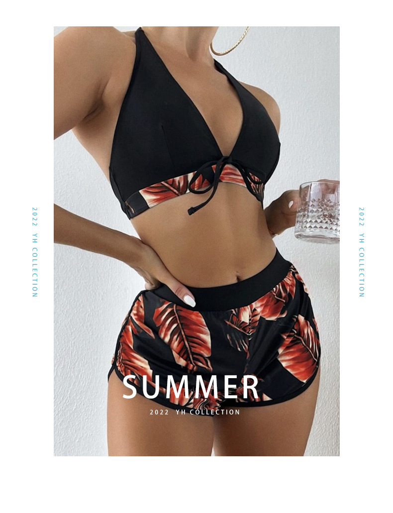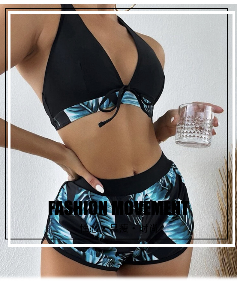 유럽과 미국의 새로운 비키니 3 피스 수영복 여성 리프 프린트 섹시한 스플릿 수영복 반바지 비치 수영복