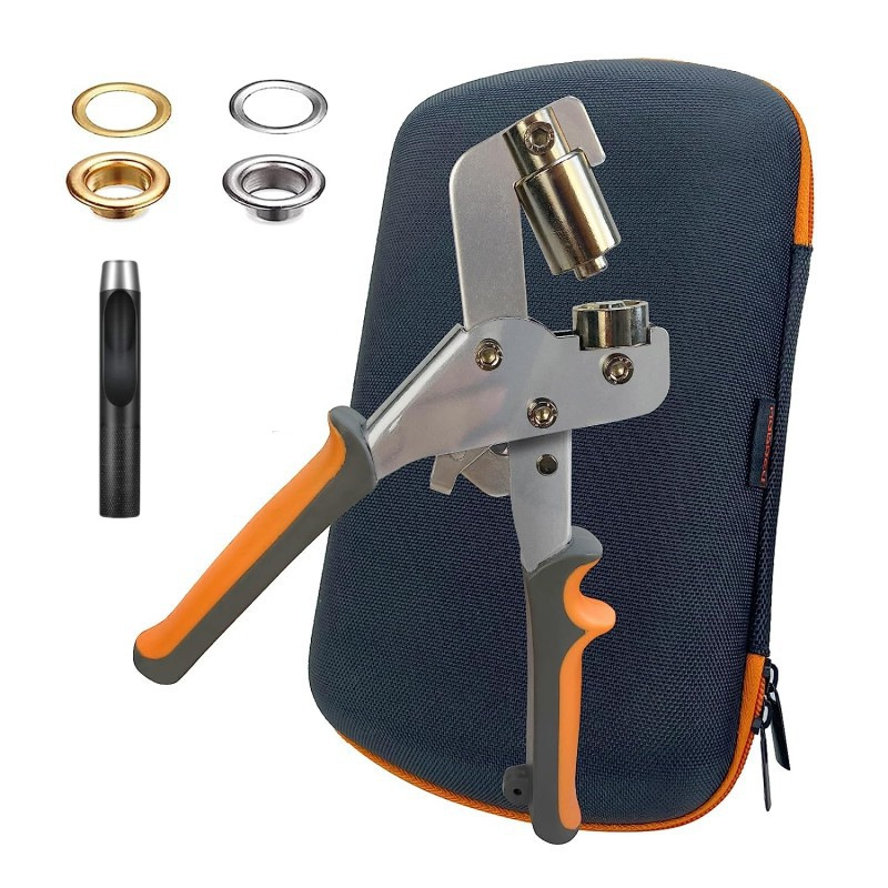 品名:100套10mm气眼(50银+50金)+黑橘色钳子+10mm黑色冲子+白色垫片+工具包