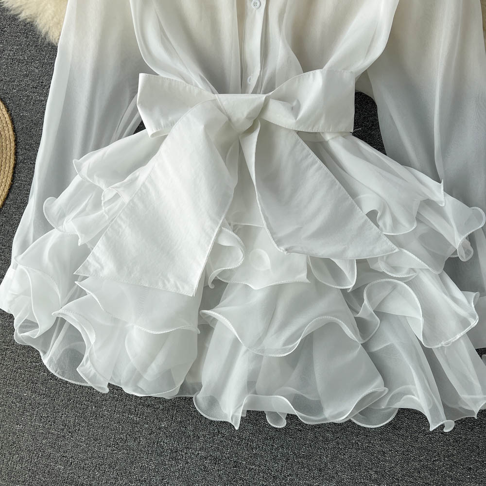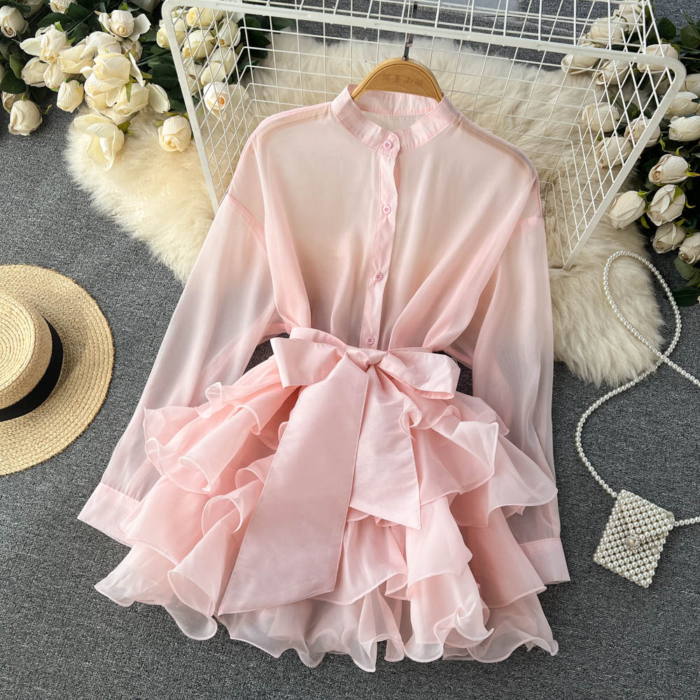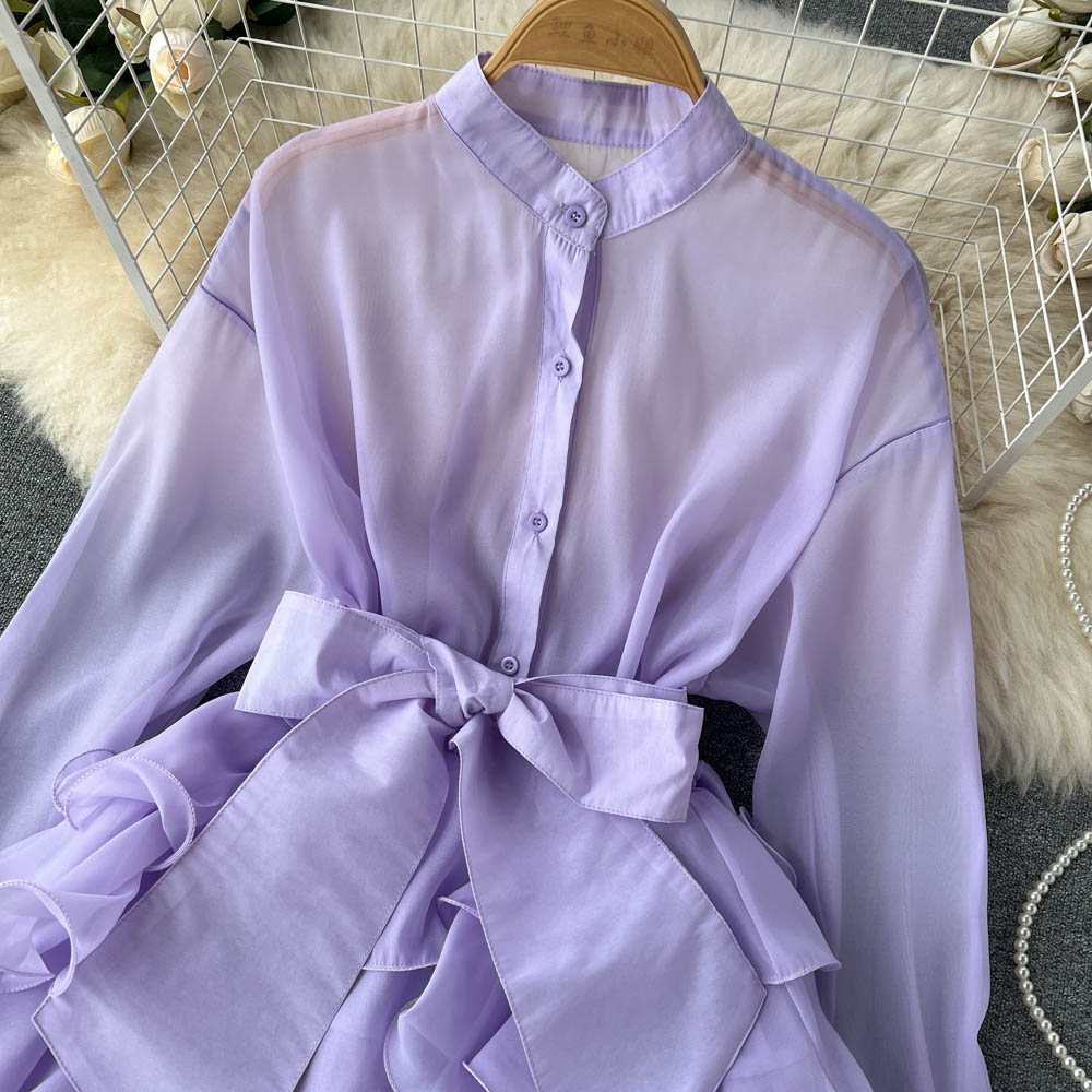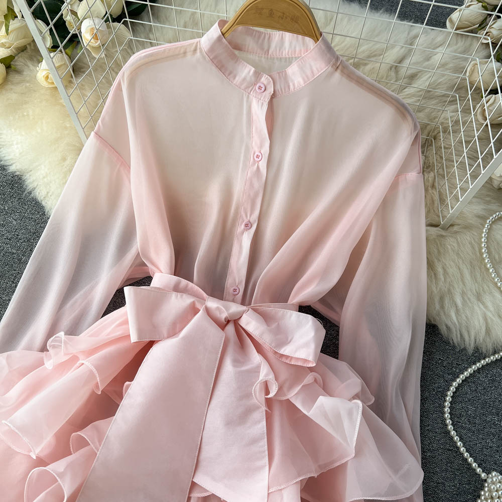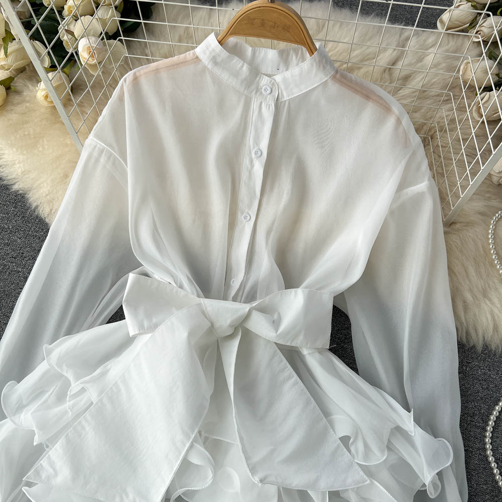 시폰 세련된 최고의 여성 가을 새로운 주름 서양식 하이 엔드 디자인 나비 스트랩 틈새 셔츠