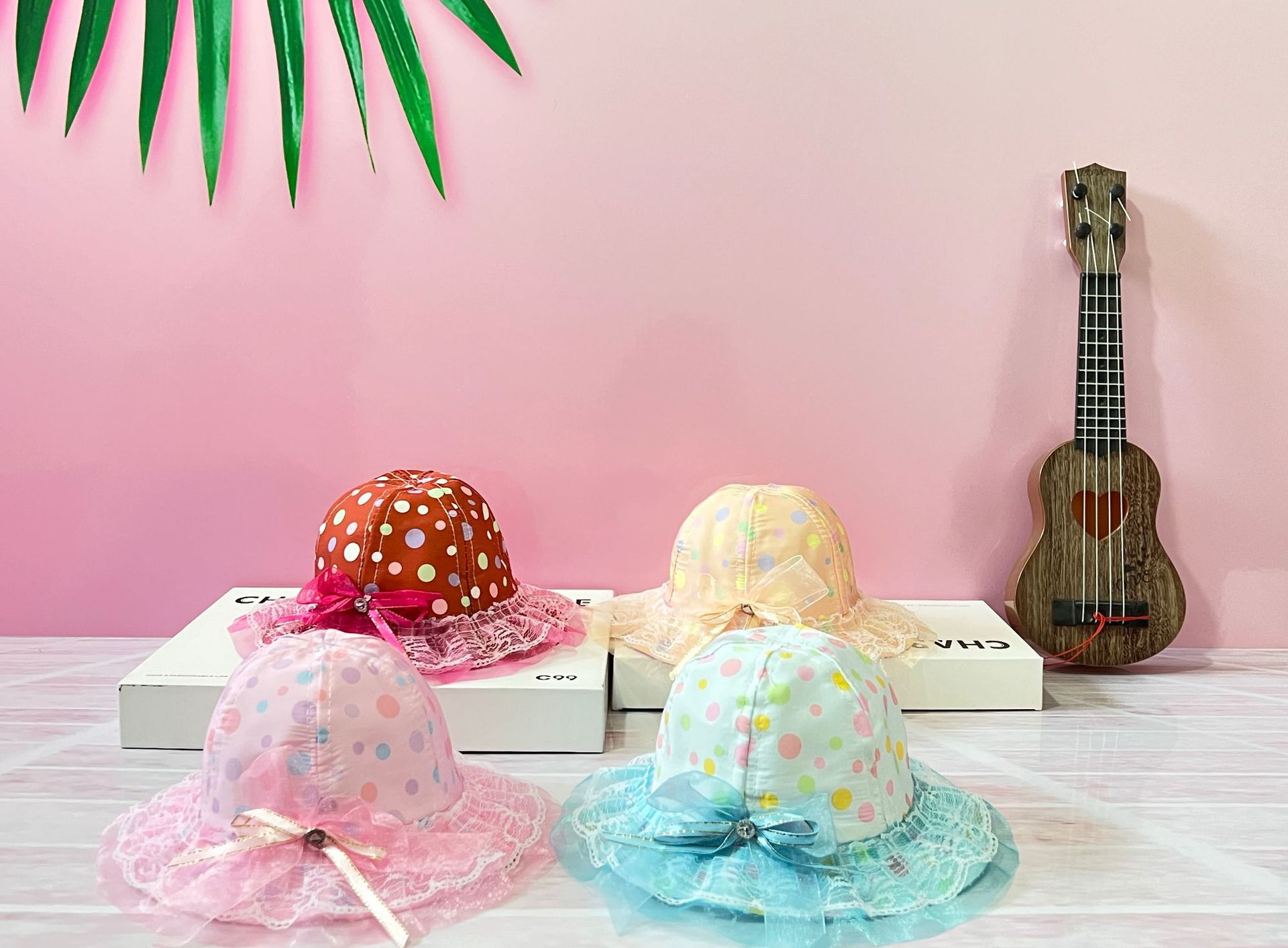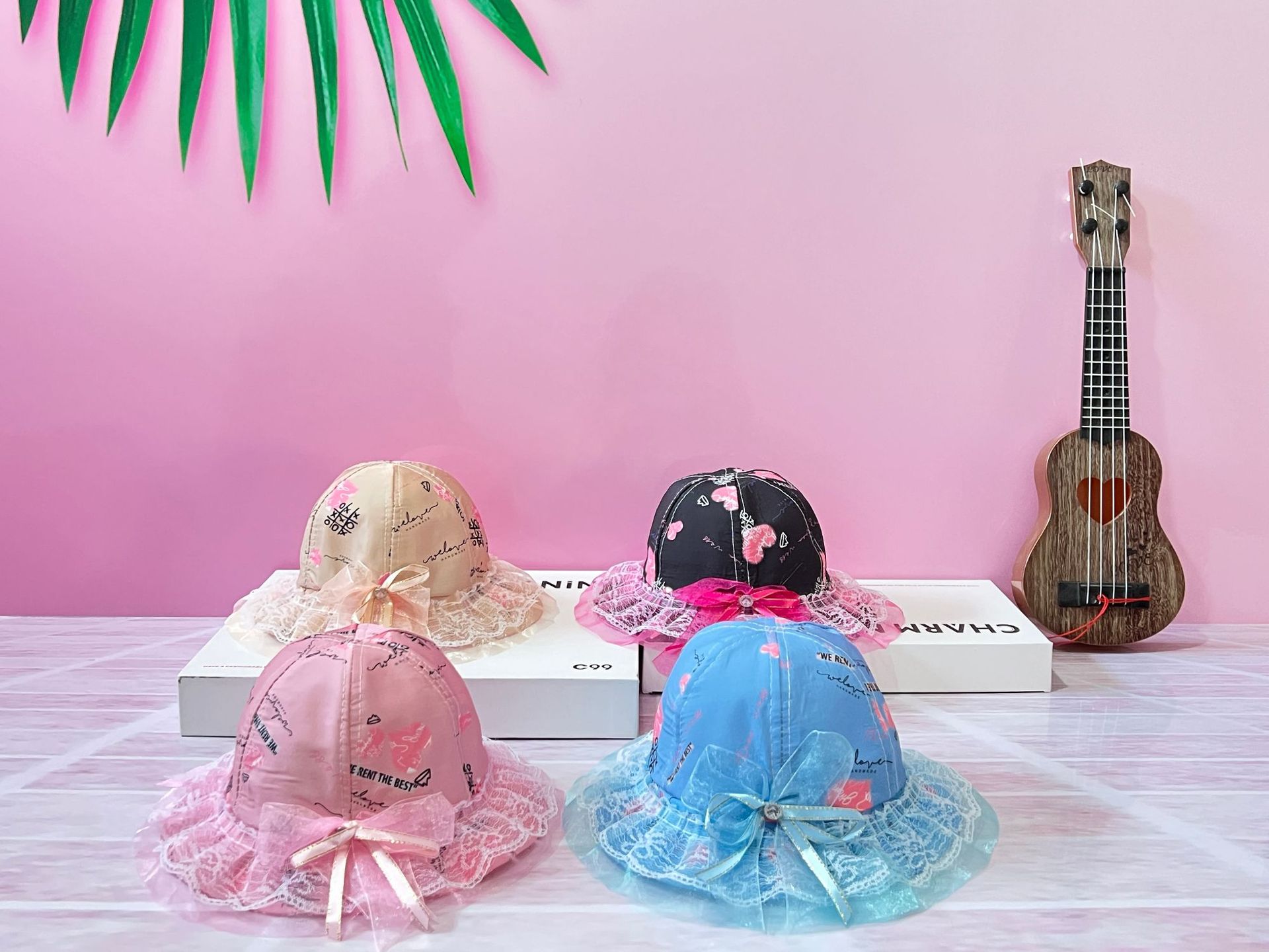 봄과 여름 새로운 아기 소녀 복숭아 심장 활 공주 분지 메쉬 모자 레이스 어린이 어부 태양 모자
