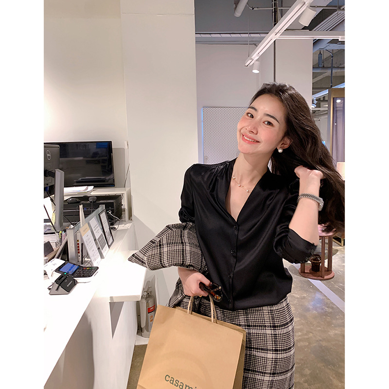 여성을위한 통근 v 넥 긴팔 셔츠 봄, 여름 새로운 프랑스 디자인 캐주얼 다목적 전문 새틴 탑스토어 가기