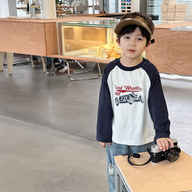 Aimo Beibei 어린이 최고 2024 봄 만화 Raglan 긴팔 티셔츠 소년의 잘 생긴 둥근 목 대비 색 바닥 셔츠스토어 가기