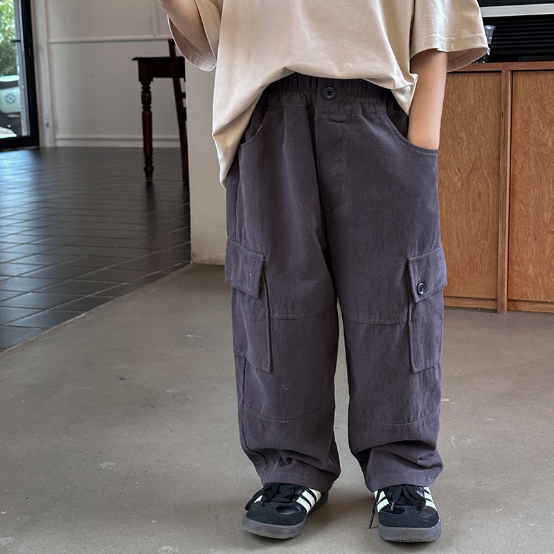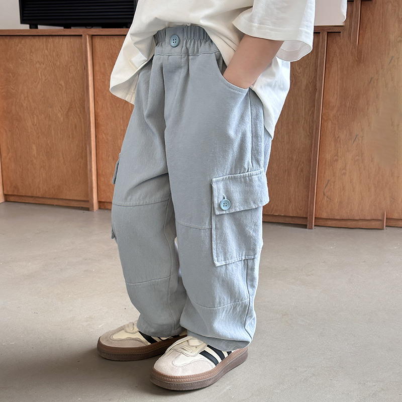 Aimo Beibei 어린이 바지 2024 봄 소년 소녀 작업복 스트레이트 포켓 바지 아기 올 매치 단색 바지