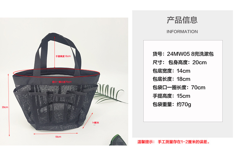 大容量网眼洗漱袋,中间适当收纳洗漱用品以及毛巾等,边上有7个小兜可以收纳小物件。
