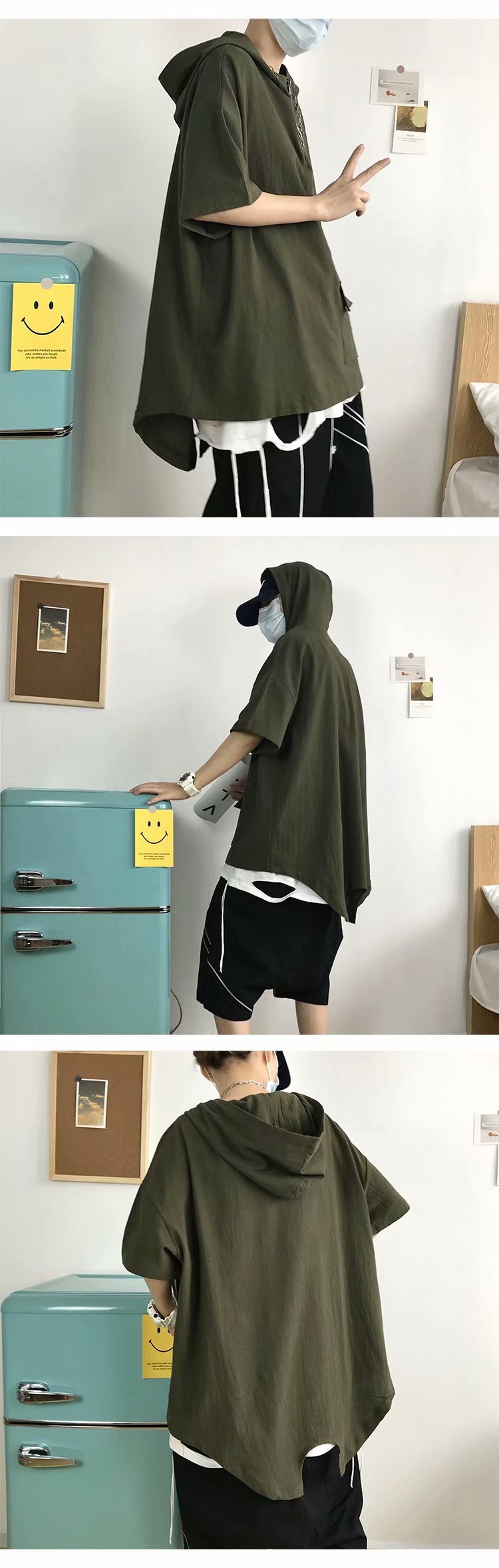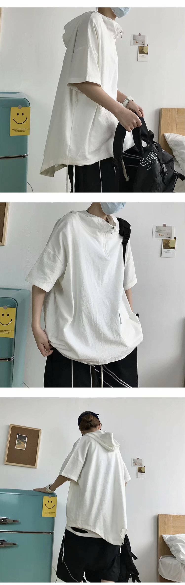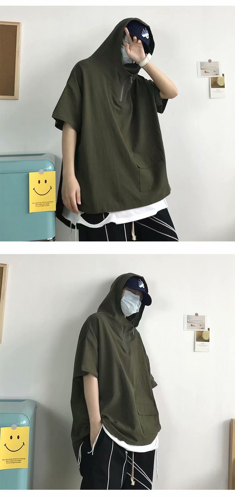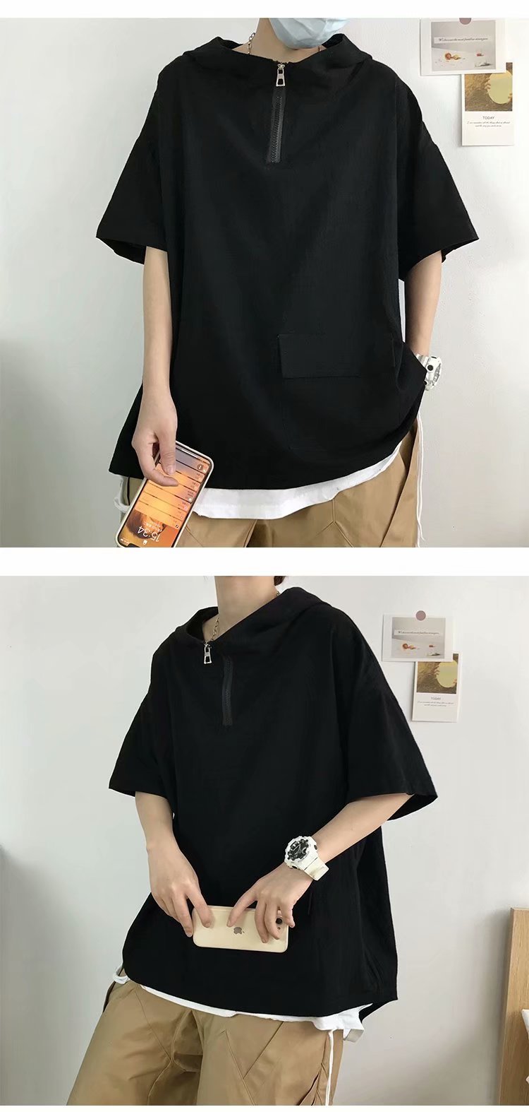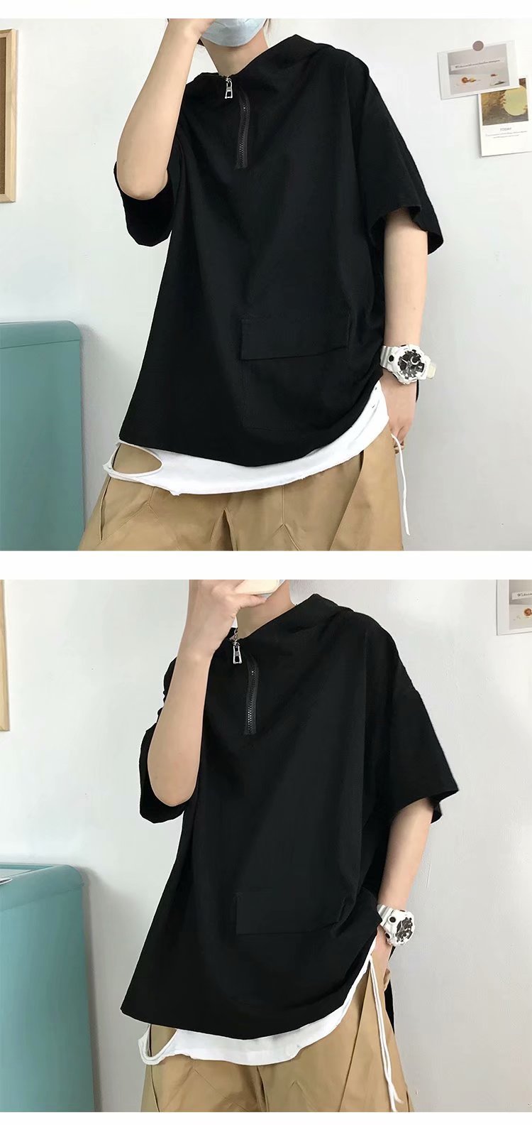 여름 반팔 티셔츠 남성 트렌디 브랜드 트렌디 루즈 반팔 후드 탑 홍콩 스타일 다용도 학생 하프 터틀넥 스웨트 셔츠스토어 가기