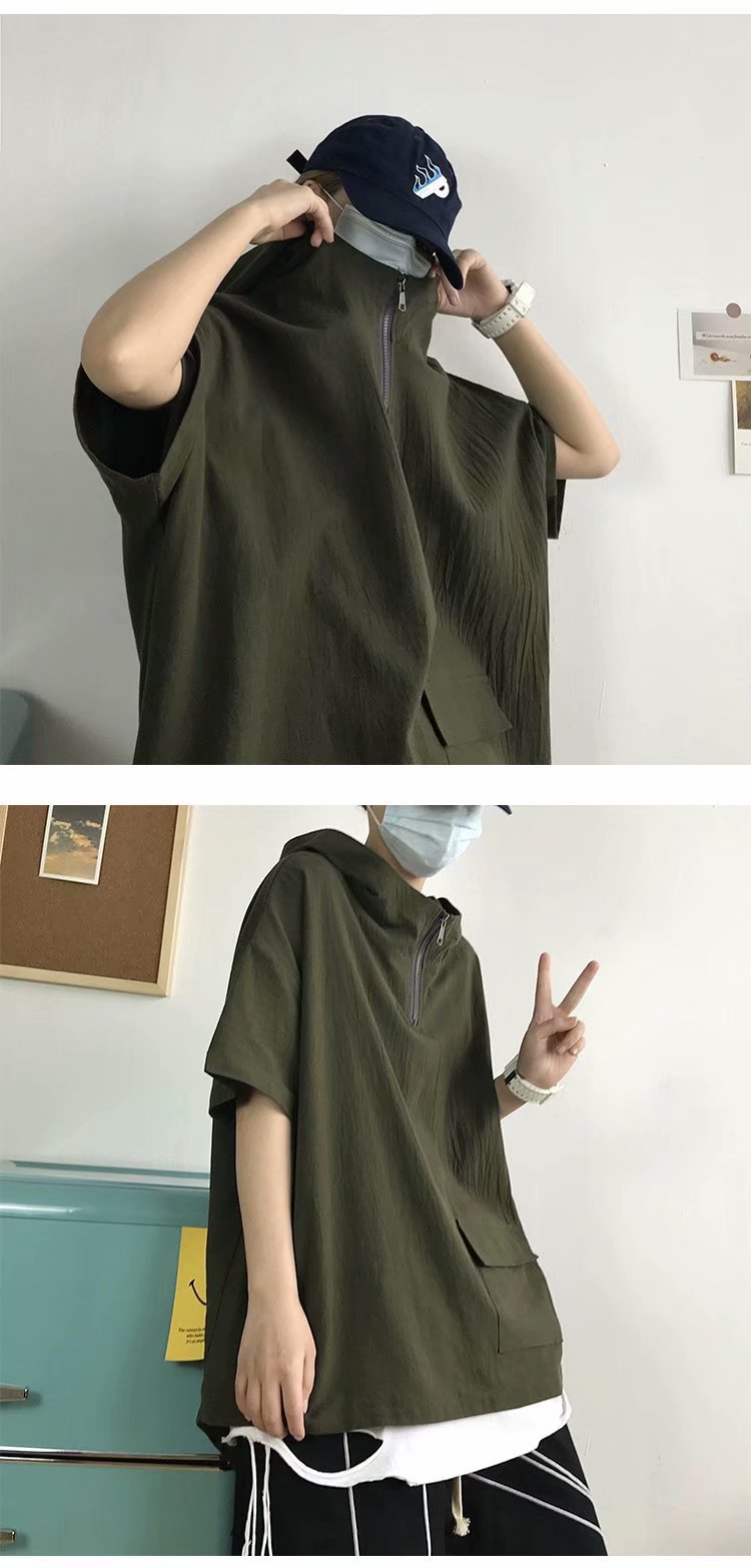 여름 반팔 티셔츠 남성 트렌디 브랜드 트렌디 루즈 반팔 후드 탑 홍콩 스타일 다용도 학생 하프 터틀넥 스웨트 셔츠