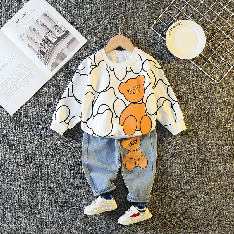2024 아동복 도매 아기 봄과 가을 세트 한국식 서양식 소년 데님 바지 곰 투피스 세트 원피스 배달스토어 가기