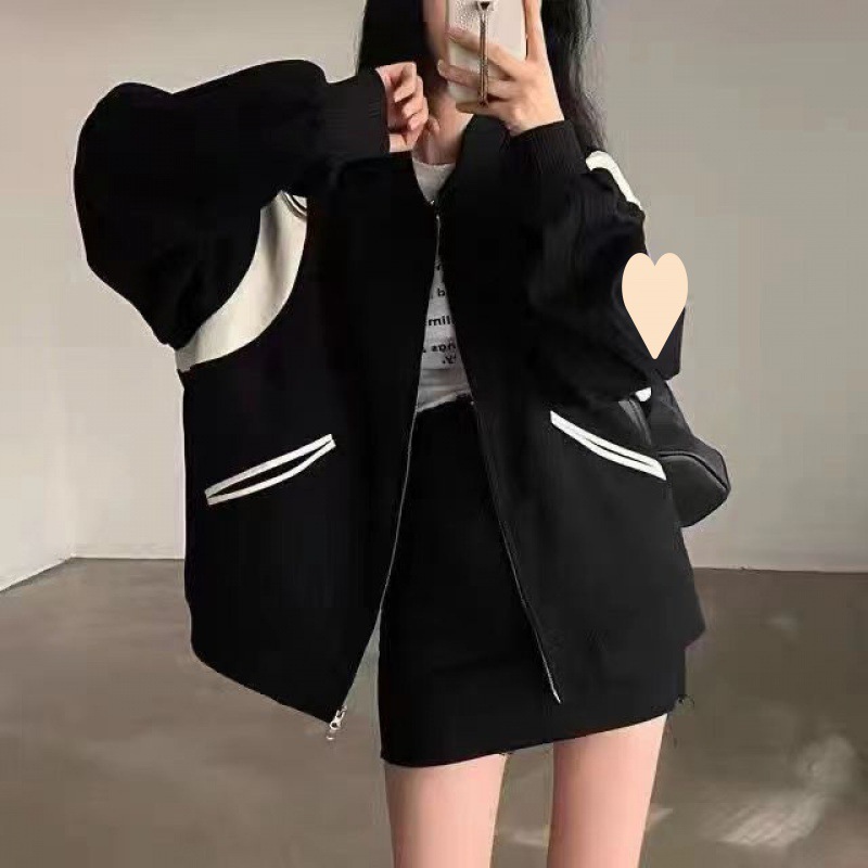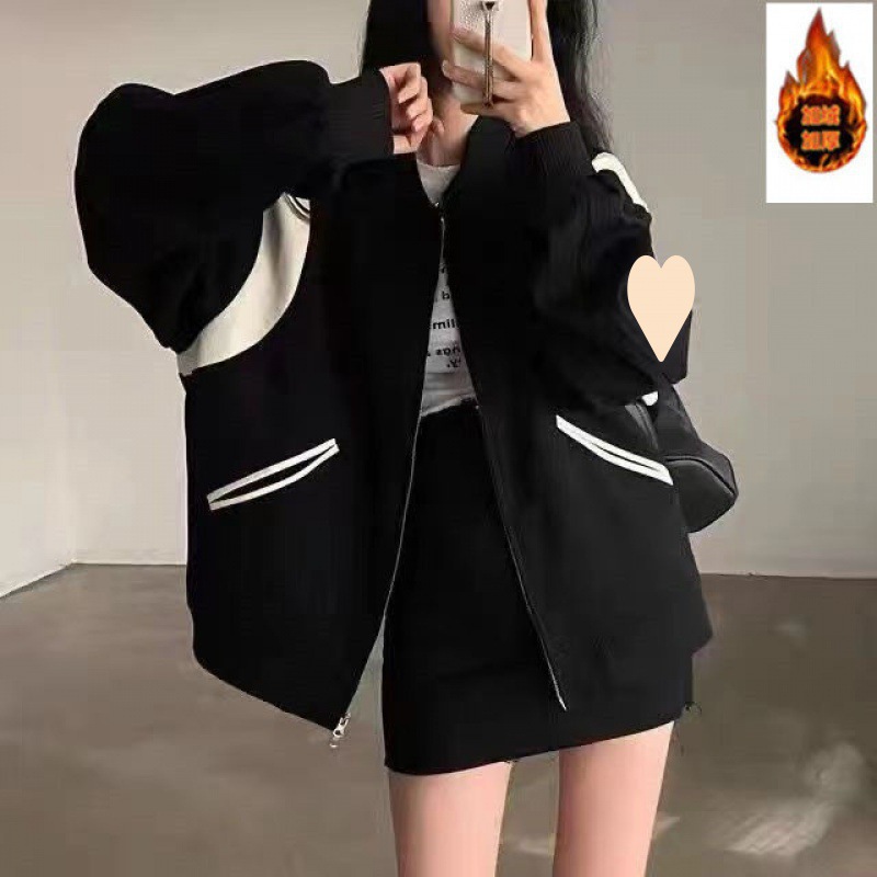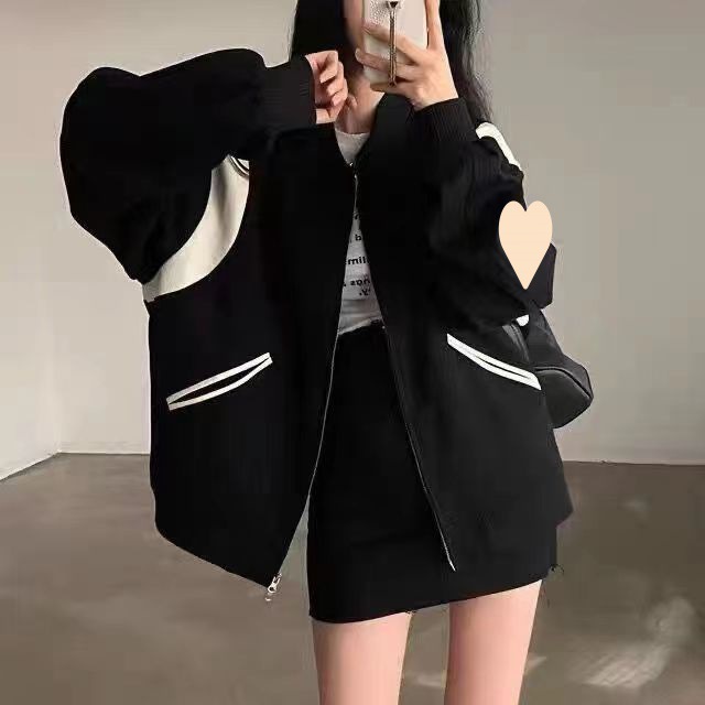 미국 복고풍 느슨한 학생 야구 유니폼 대비 색상 Maillard 가을 코트 여성 카디건 가을과 겨울 기모 스웨터 패션스토어 가기