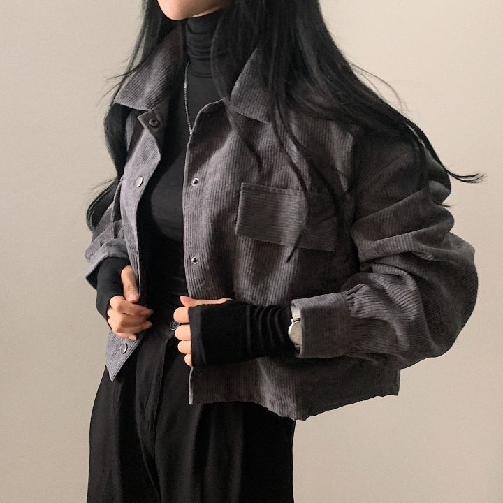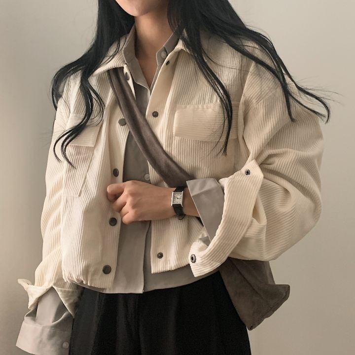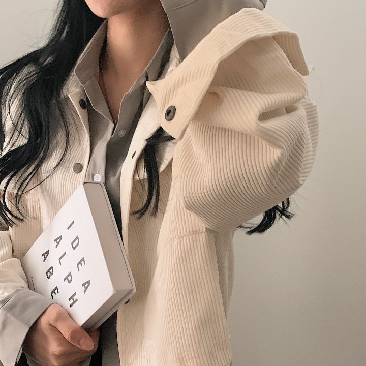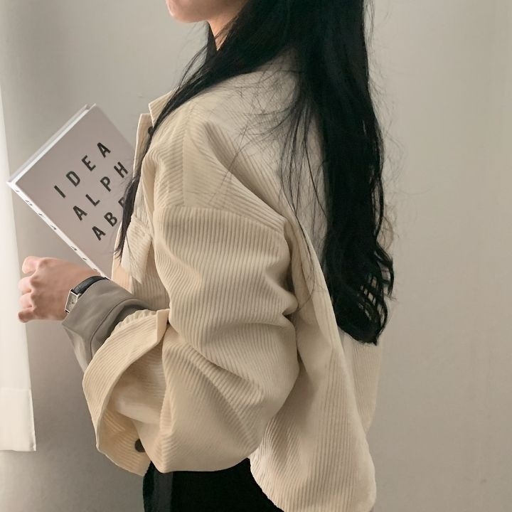 한국 세련된 가을과 겨울 여성을위한 새로운 느슨한 올 매치 싱글 브레스트 라펠 짧은 코듀로이 셔츠 드로 스트링 코트스토어 가기