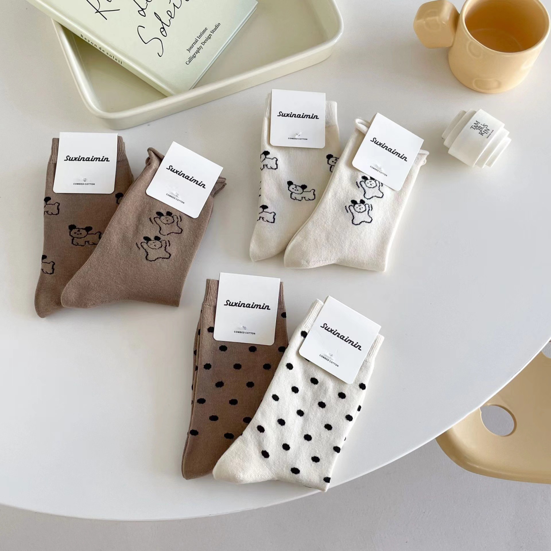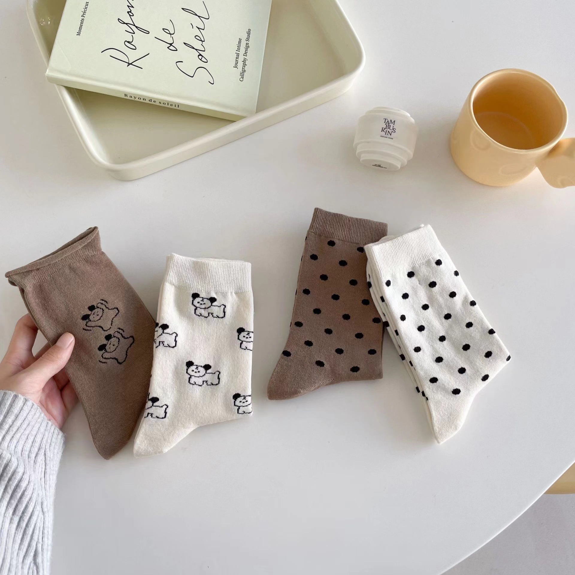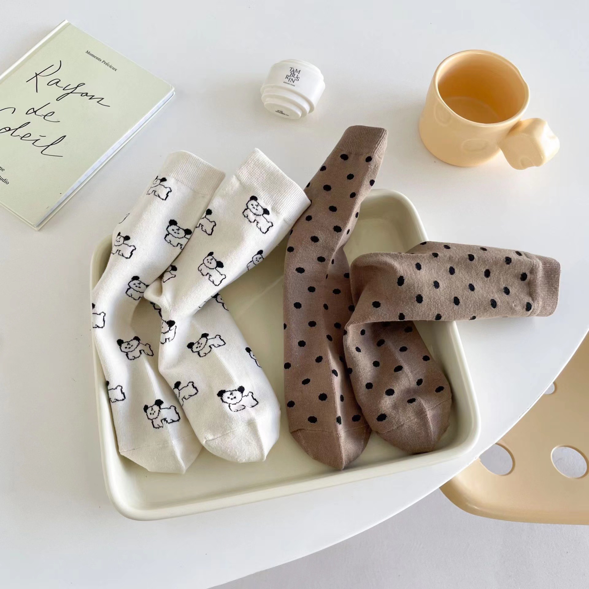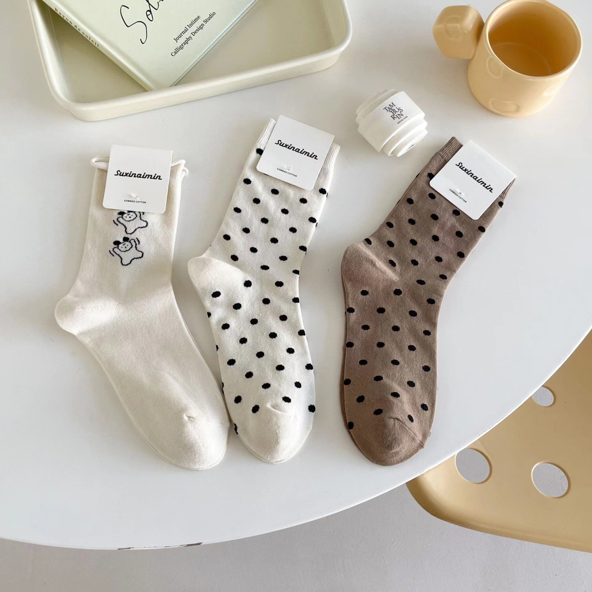 라이트 베이지 만화 양말 여성 봄과 여름 새로운 일본 스타일 컬링 폴카 도트 귀여운 강아지 온라인 인기있는 중간 송아지 길이 양말스토어 가기