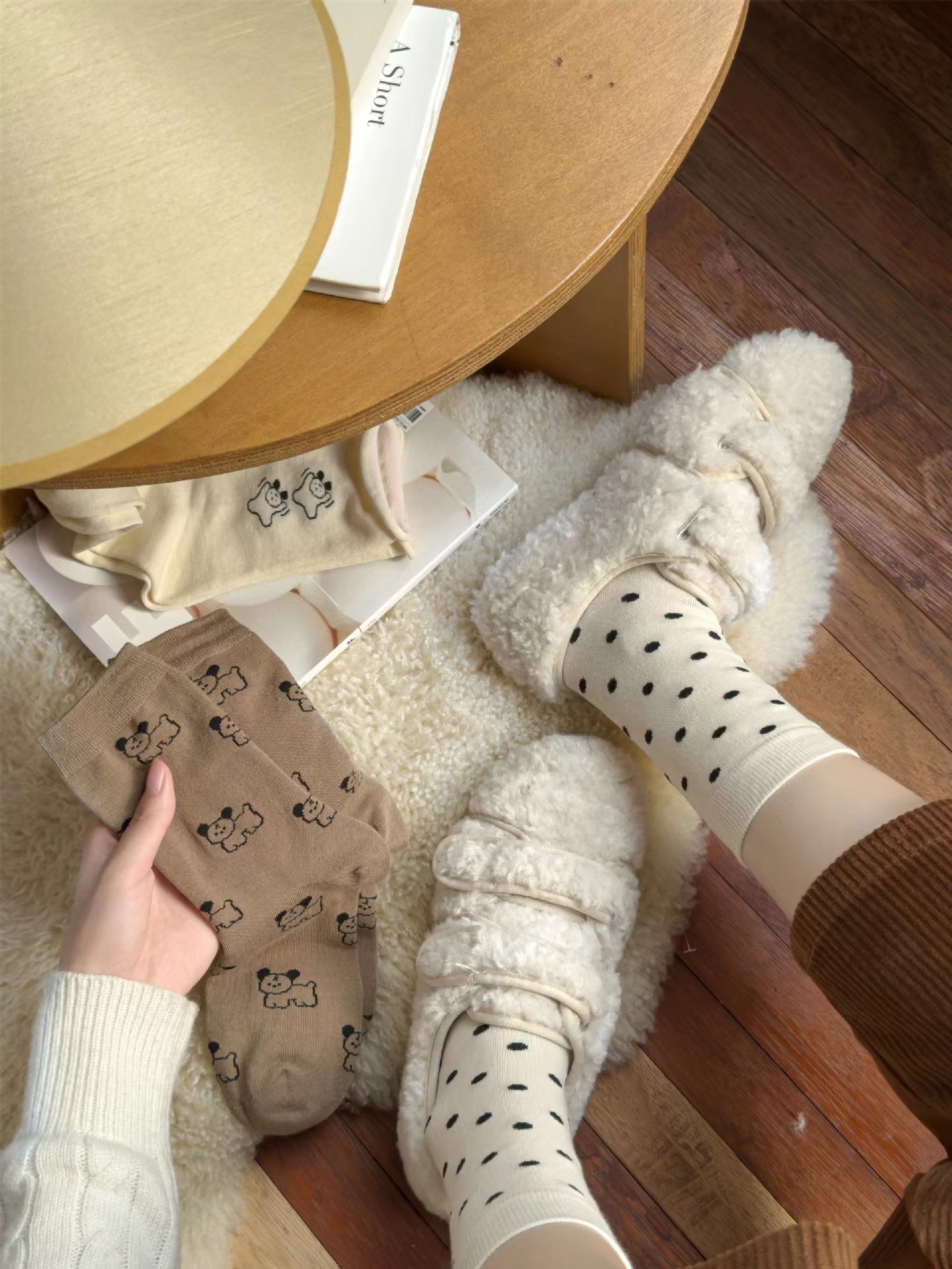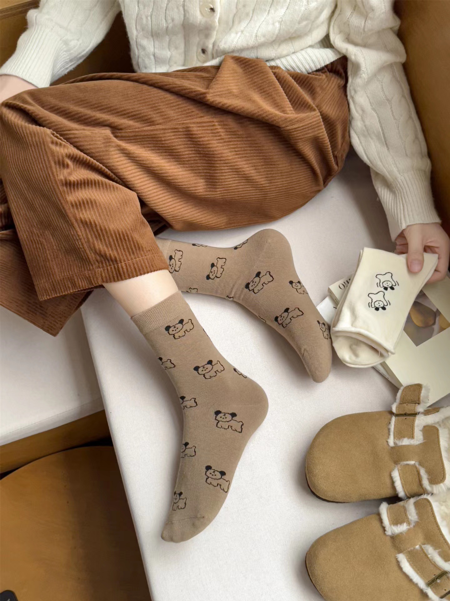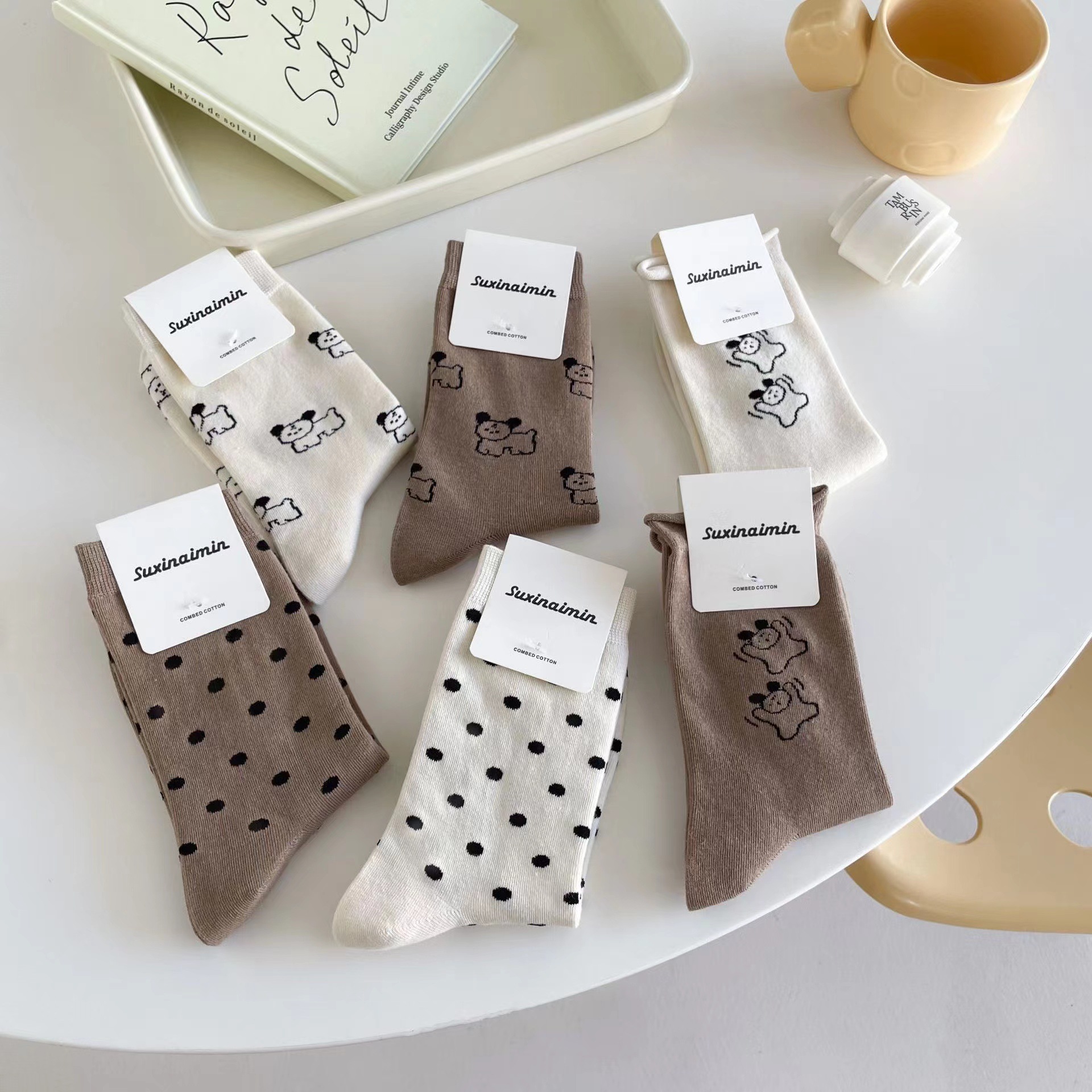 라이트 베이지 만화 양말 여성 봄과 여름 새로운 일본 스타일 컬링 폴카 도트 귀여운 강아지 온라인 인기있는 중간 송아지 길이 양말스토어 가기
