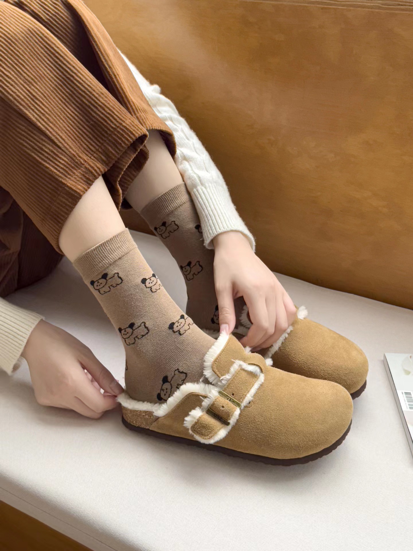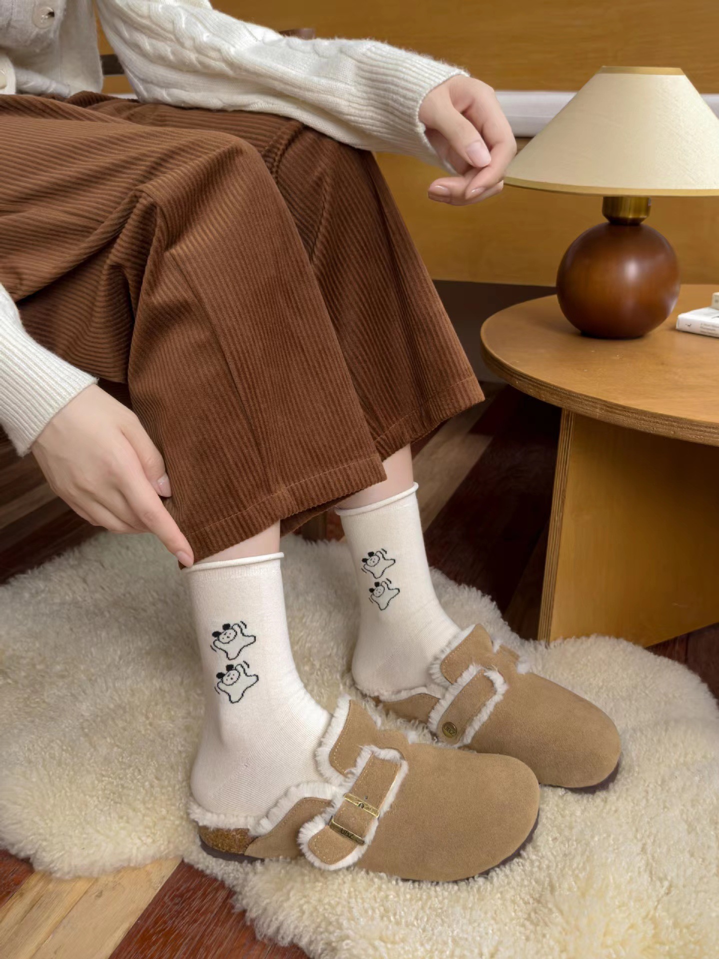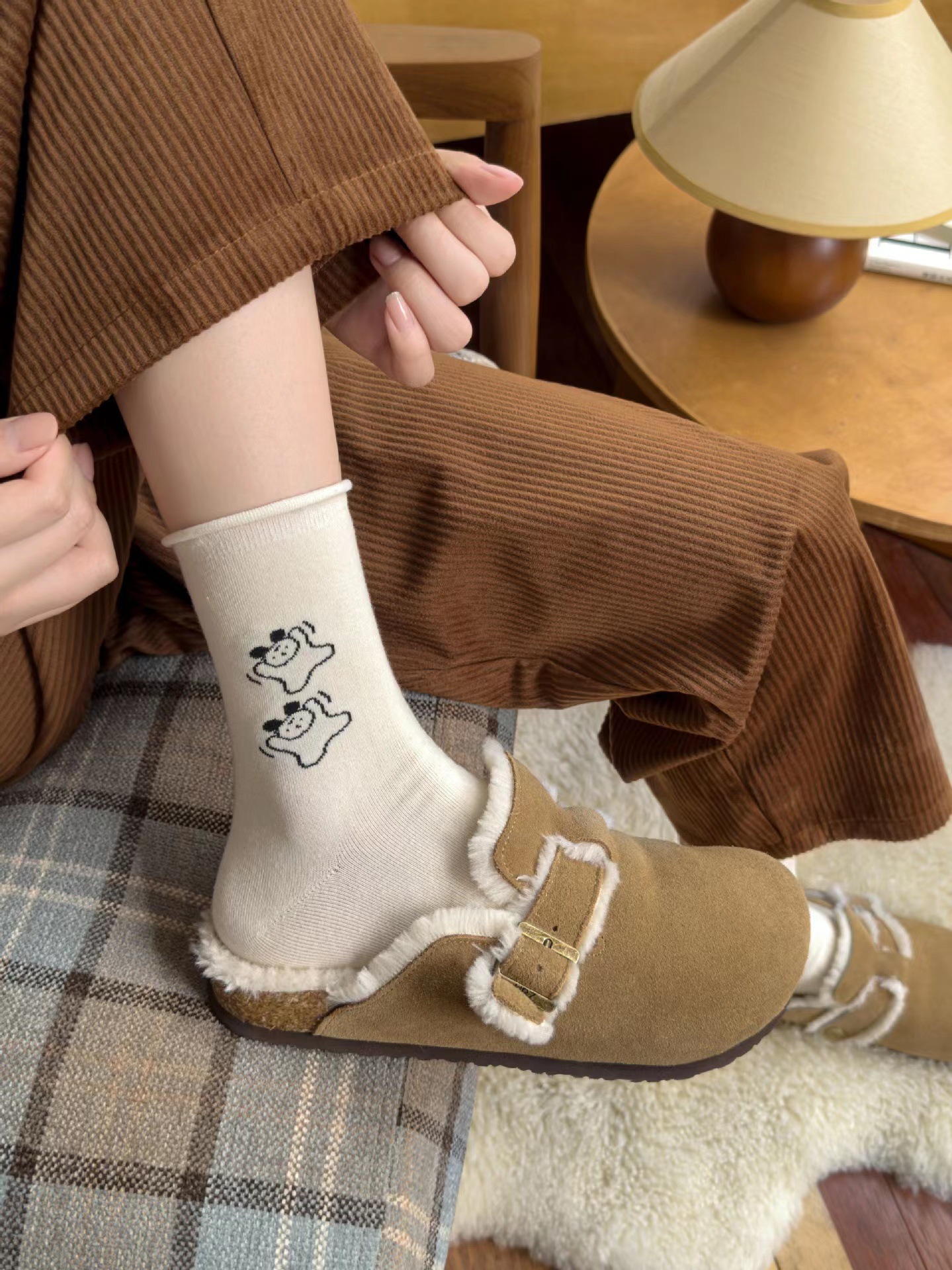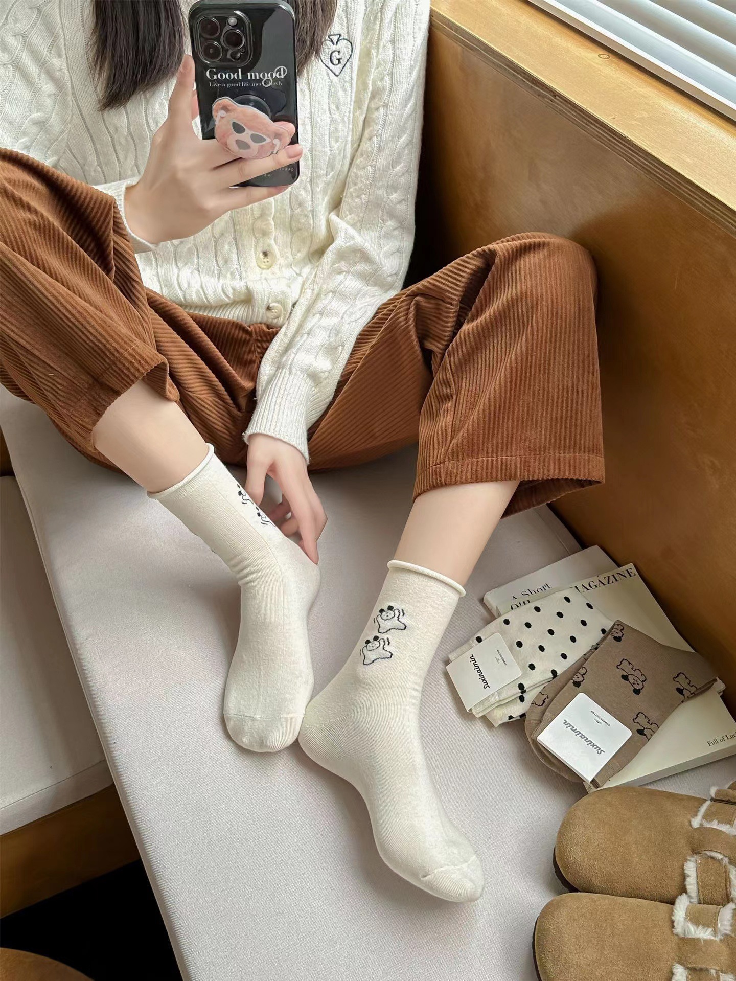 라이트 베이지 만화 양말 여성 봄과 여름 새로운 일본 스타일 컬링 폴카 도트 귀여운 강아지 온라인 인기있는 중간 송아지 길이 양말스토어 가기