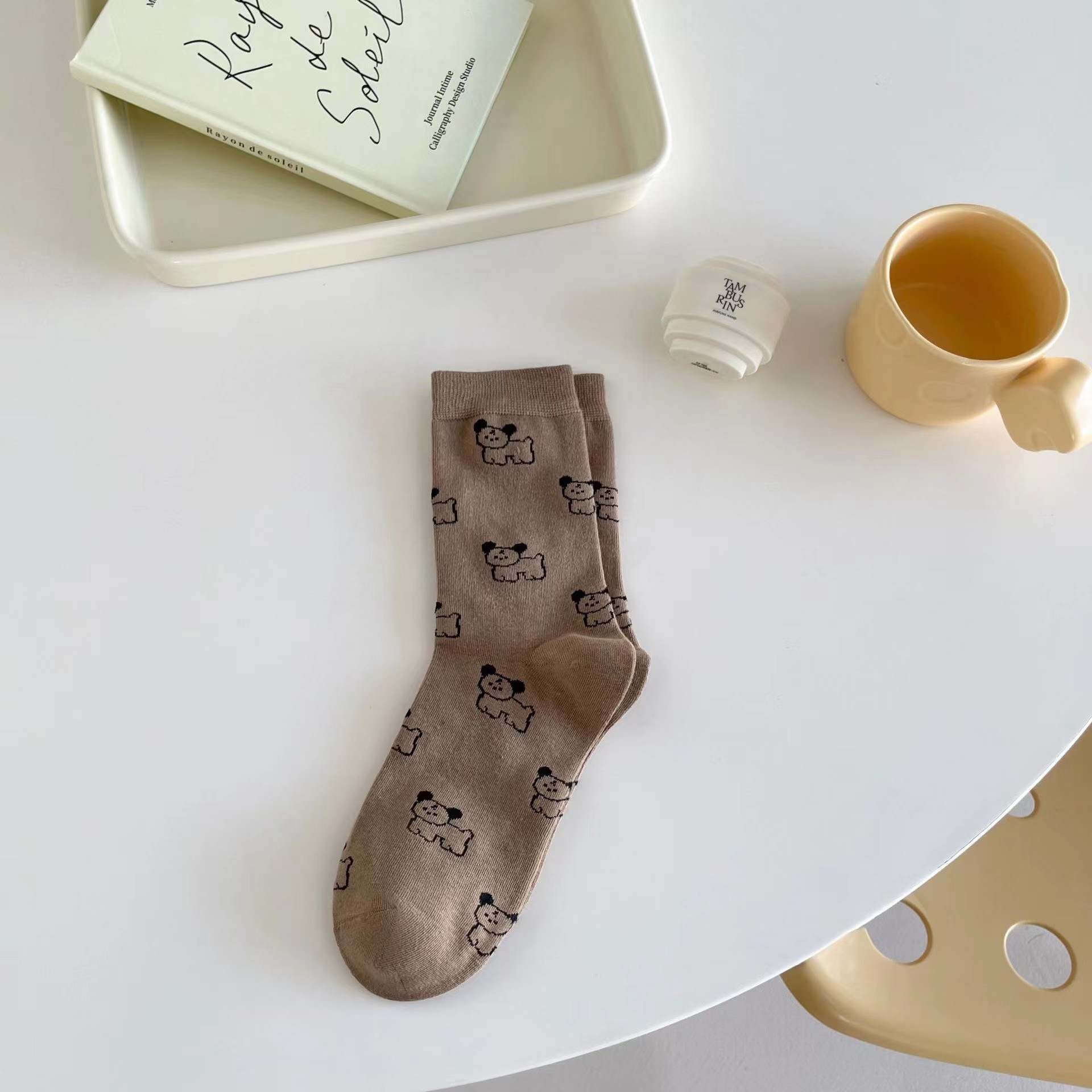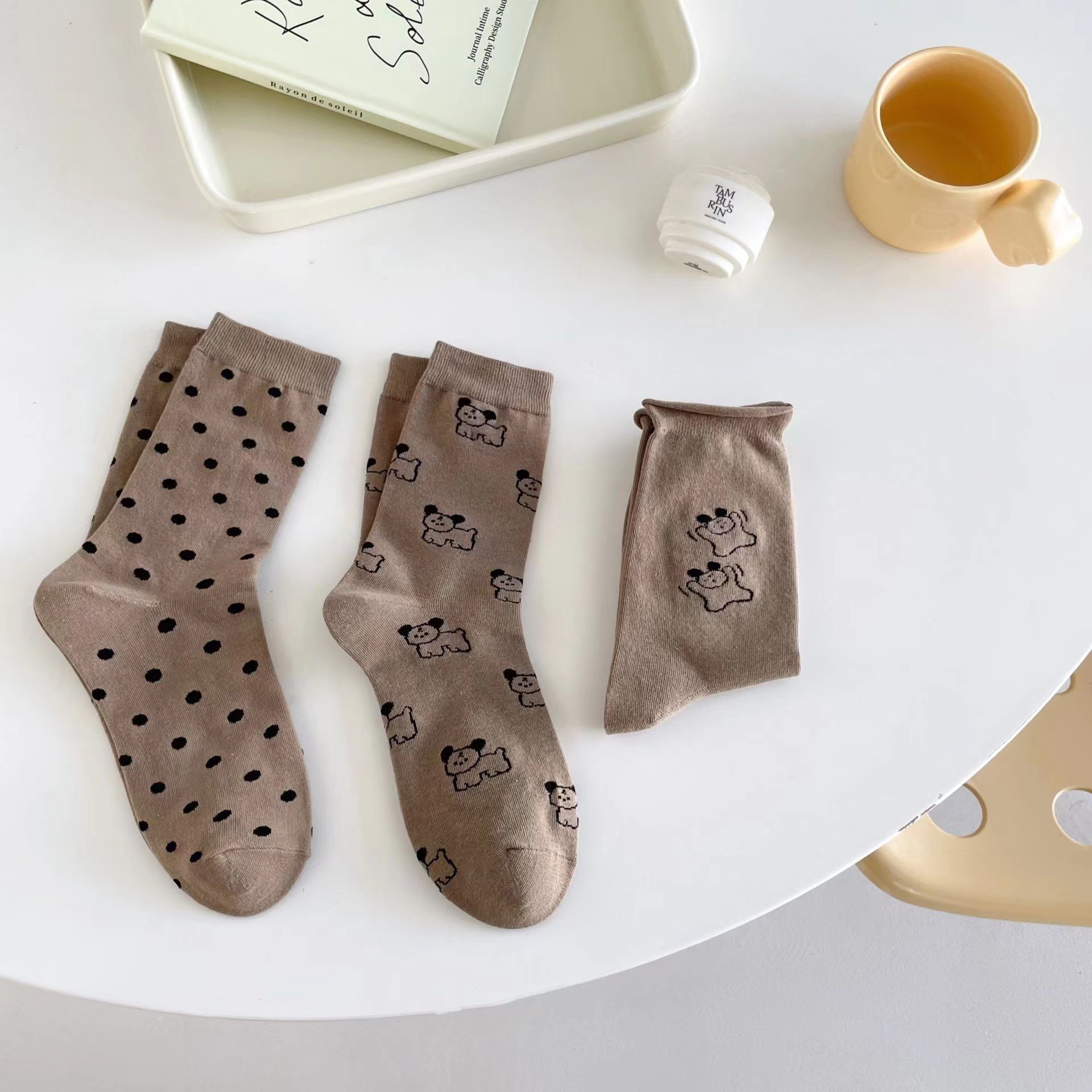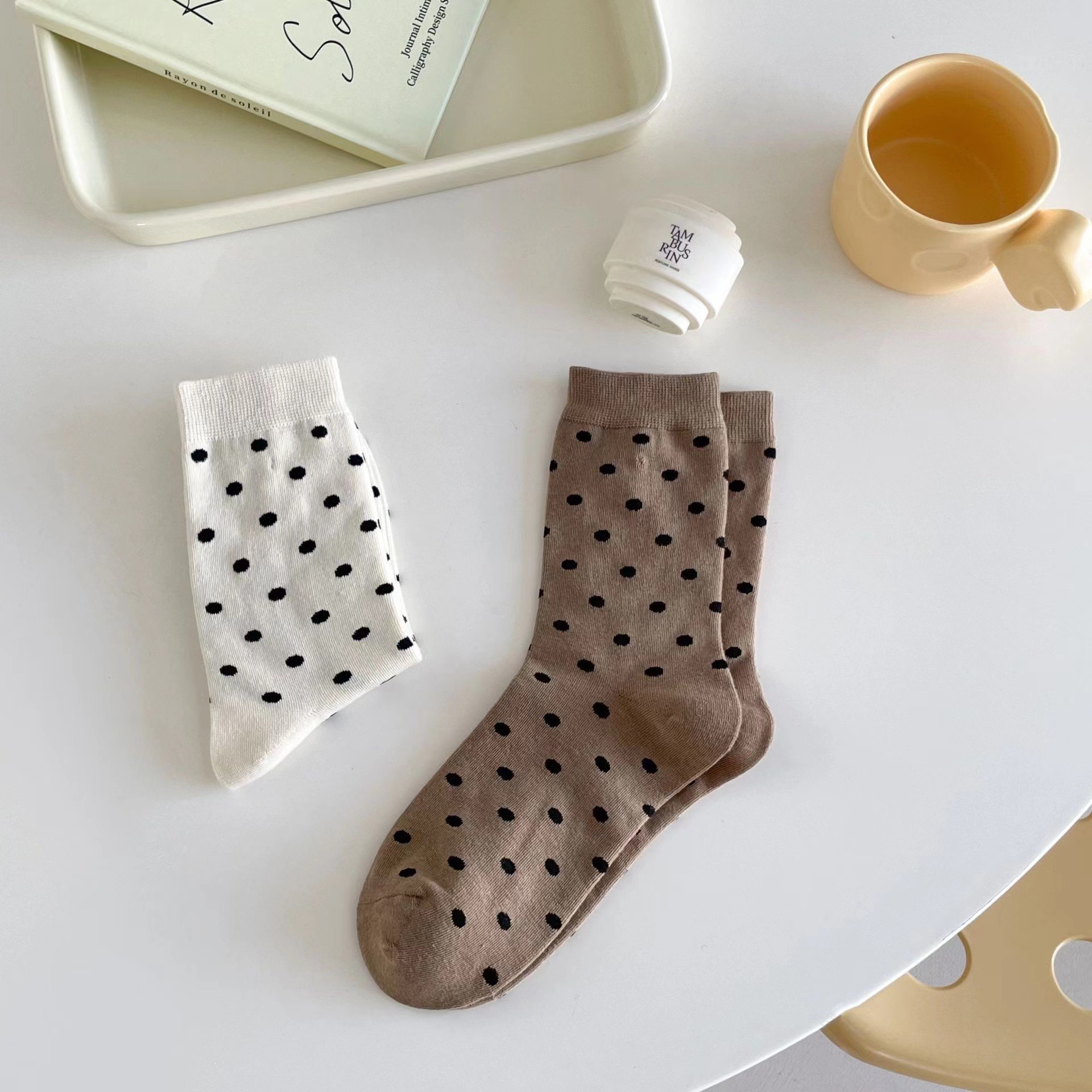 라이트 베이지 만화 양말 여성 봄과 여름 새로운 일본 스타일 컬링 폴카 도트 귀여운 강아지 온라인 인기있는 중간 송아지 길이 양말