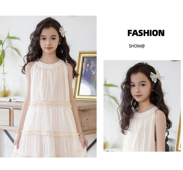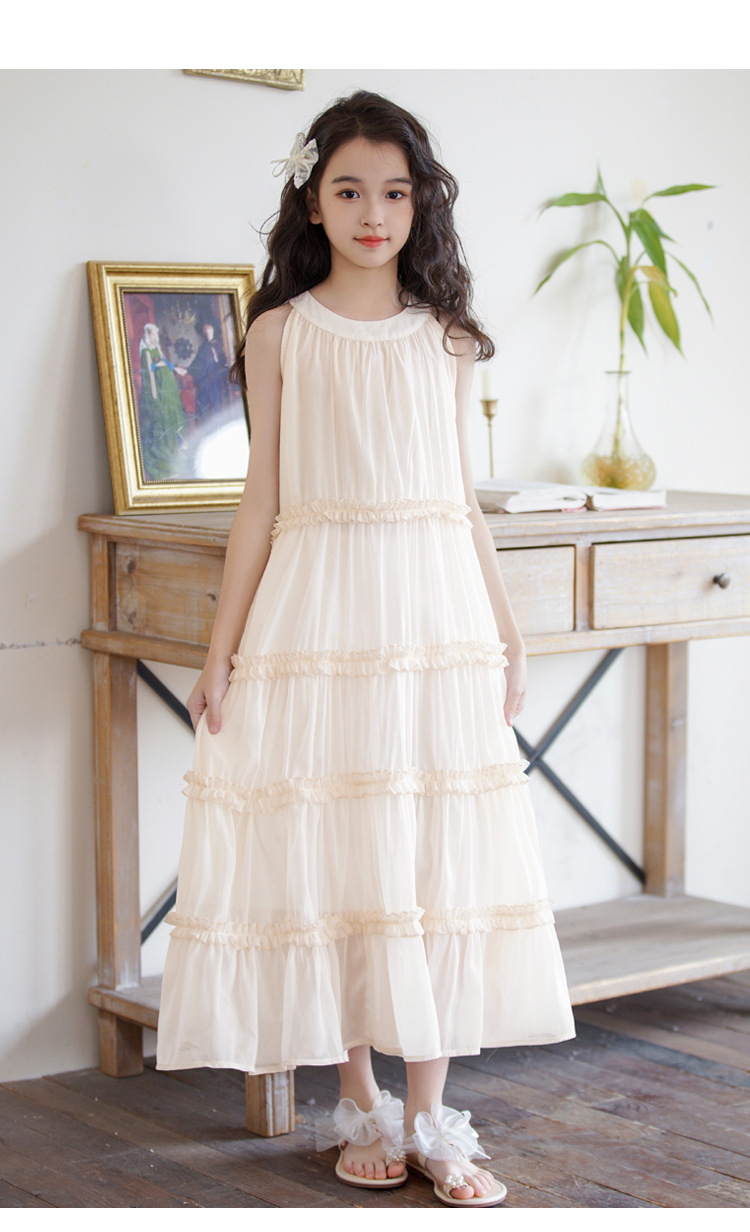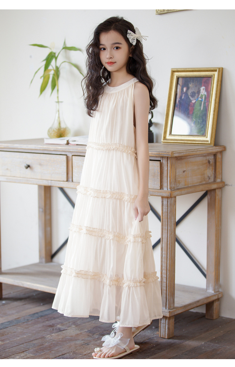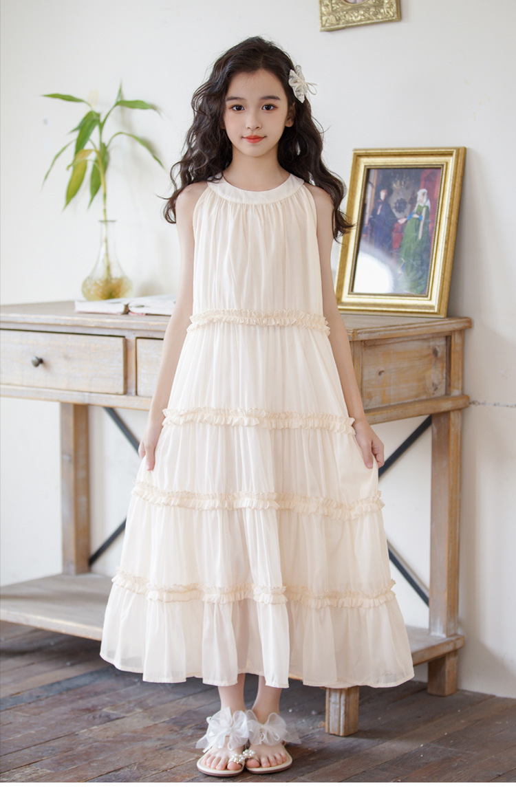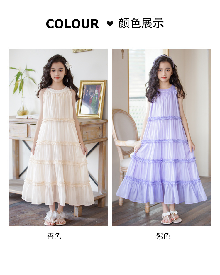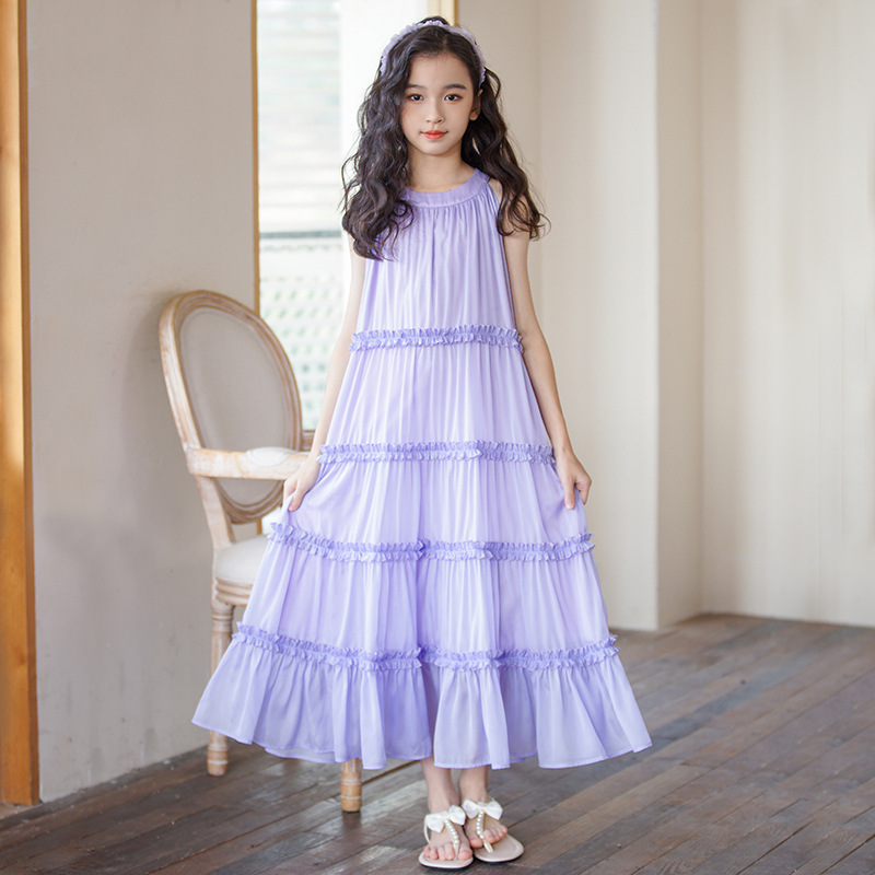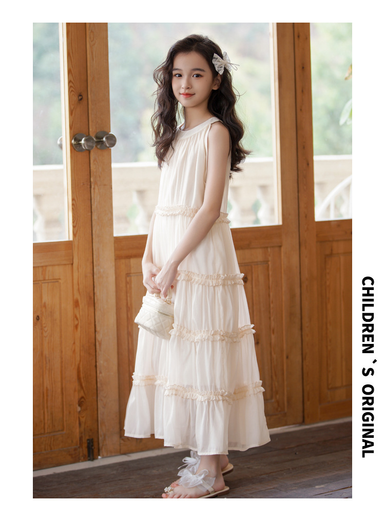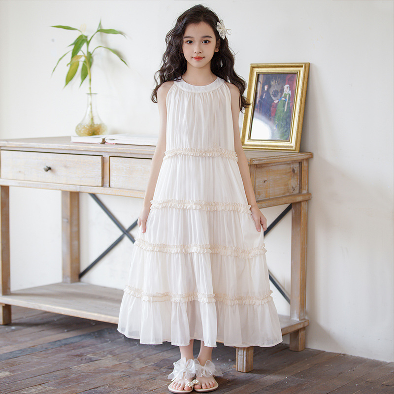소녀 원피스 여름 민소매 서스펜더 긴 치마 2024 새로운 미디어와 큰 어린이 소녀 서양식 쉬폰 스커트