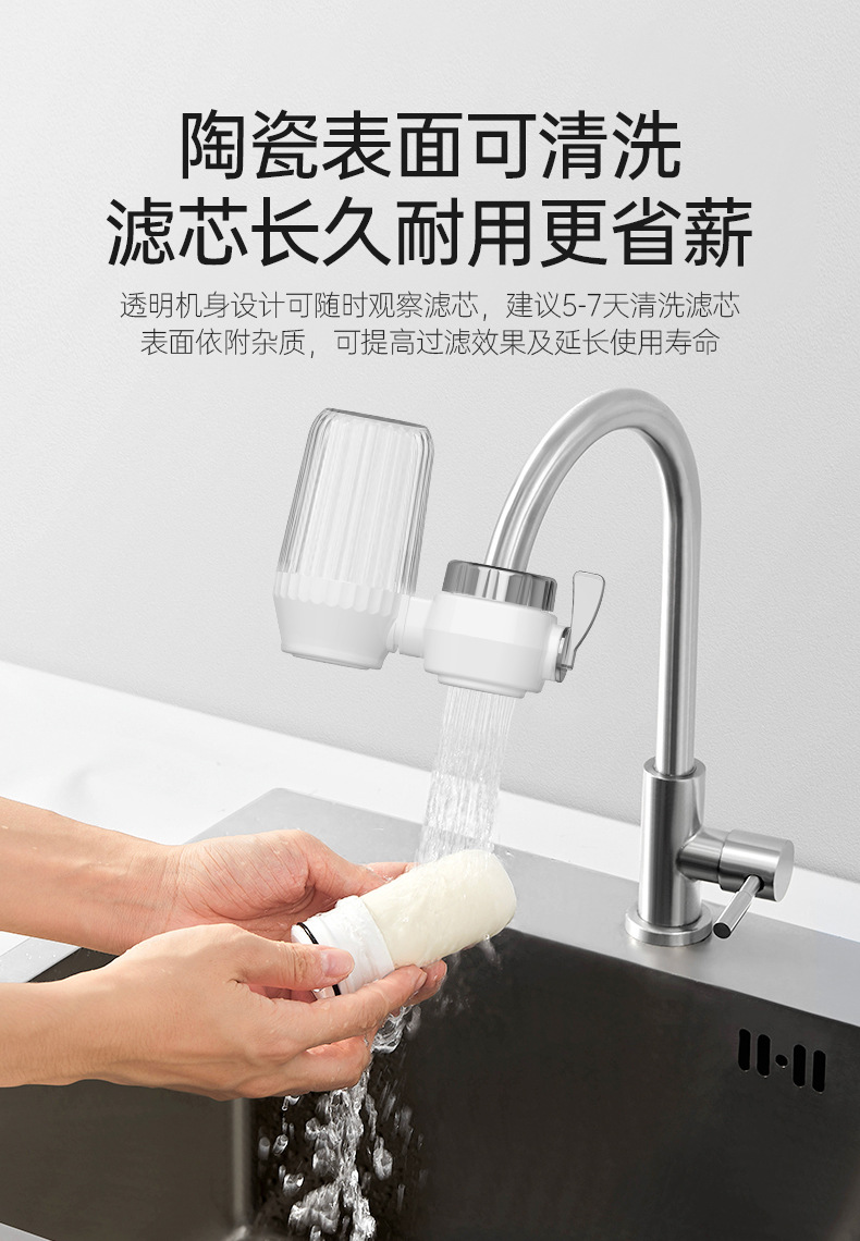多功能水龙头过滤器,升级7级复合陶瓷滤芯,净水无需用电,配件齐全安装简便,(温馨提示:过滤器出厂内置一个滤芯,请必须撕开表面的保护膜后再使用),滤芯建议每周清洗1次,约3-6个月需更换新的滤芯。(水质较差的建议更早更换)