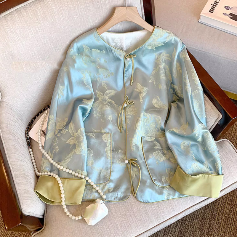 신중국풍 라운드넥 배색 프린트 새틴 숏 재킷 여성용 2025 가을 겨울 신상 레트로 독특한 중국풍 상의