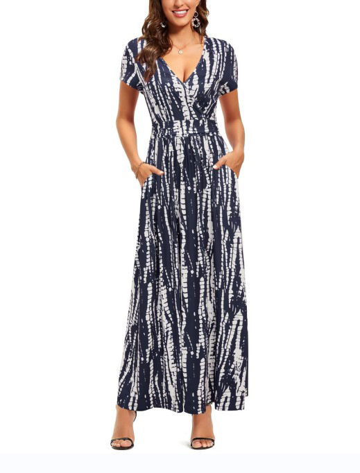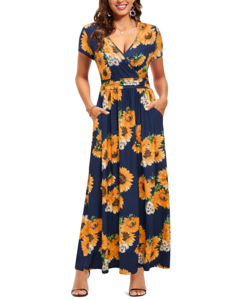 대외 무역 2024 새로운 AliExpress 독립 역 여성 의류 인쇄 V 넥 포장 가슴 짧은 소매 포켓 원피스