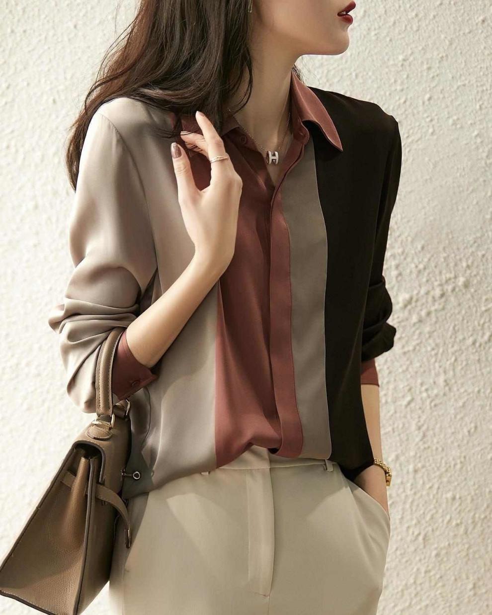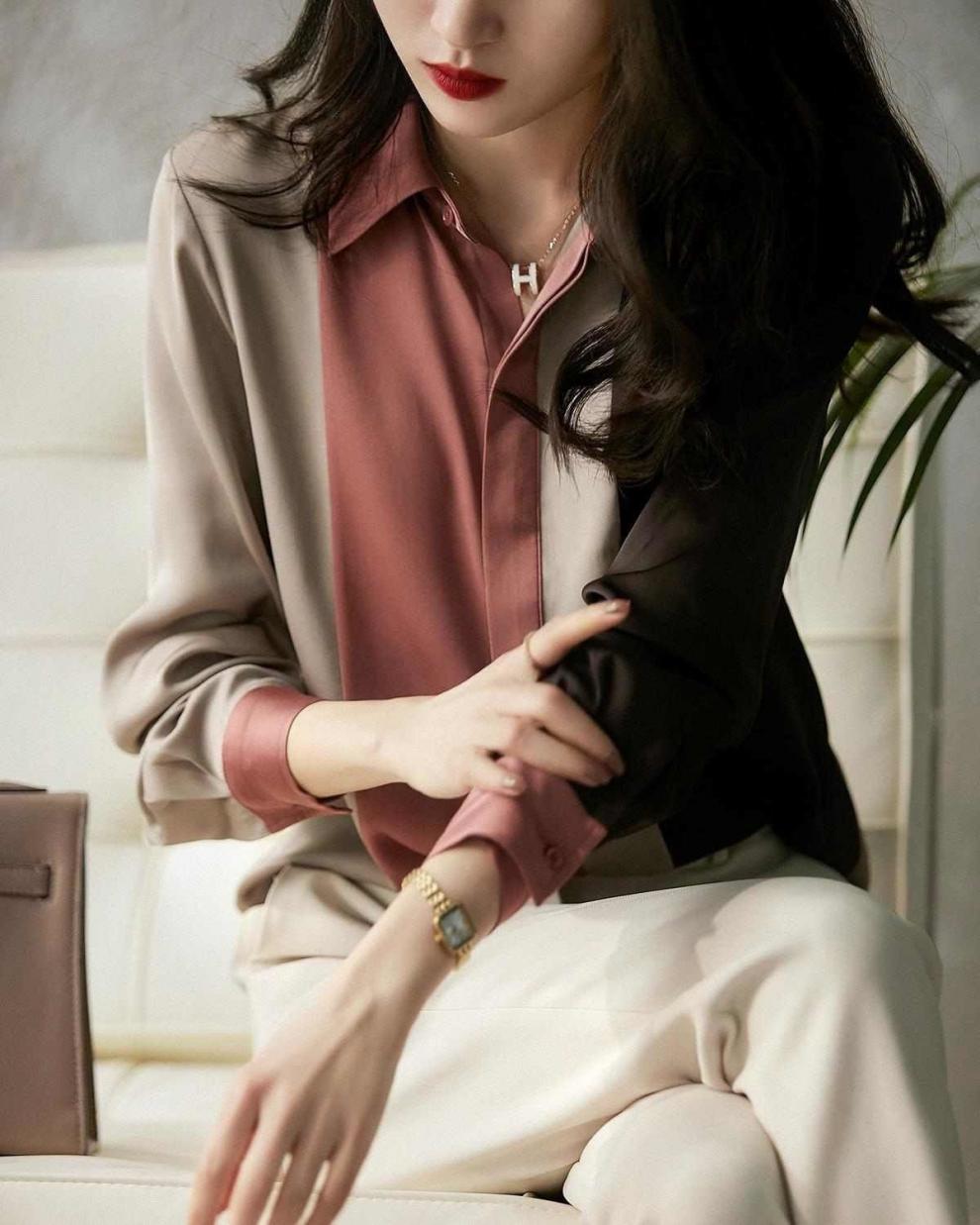 컬러 블록 셔츠 긴팔 여성용 가을 2024 새로운 스타일 셔츠 느슨한 서양식 틈새 쉬폰 셔츠 여성용 비즈니스 의류 탑스토어 가기