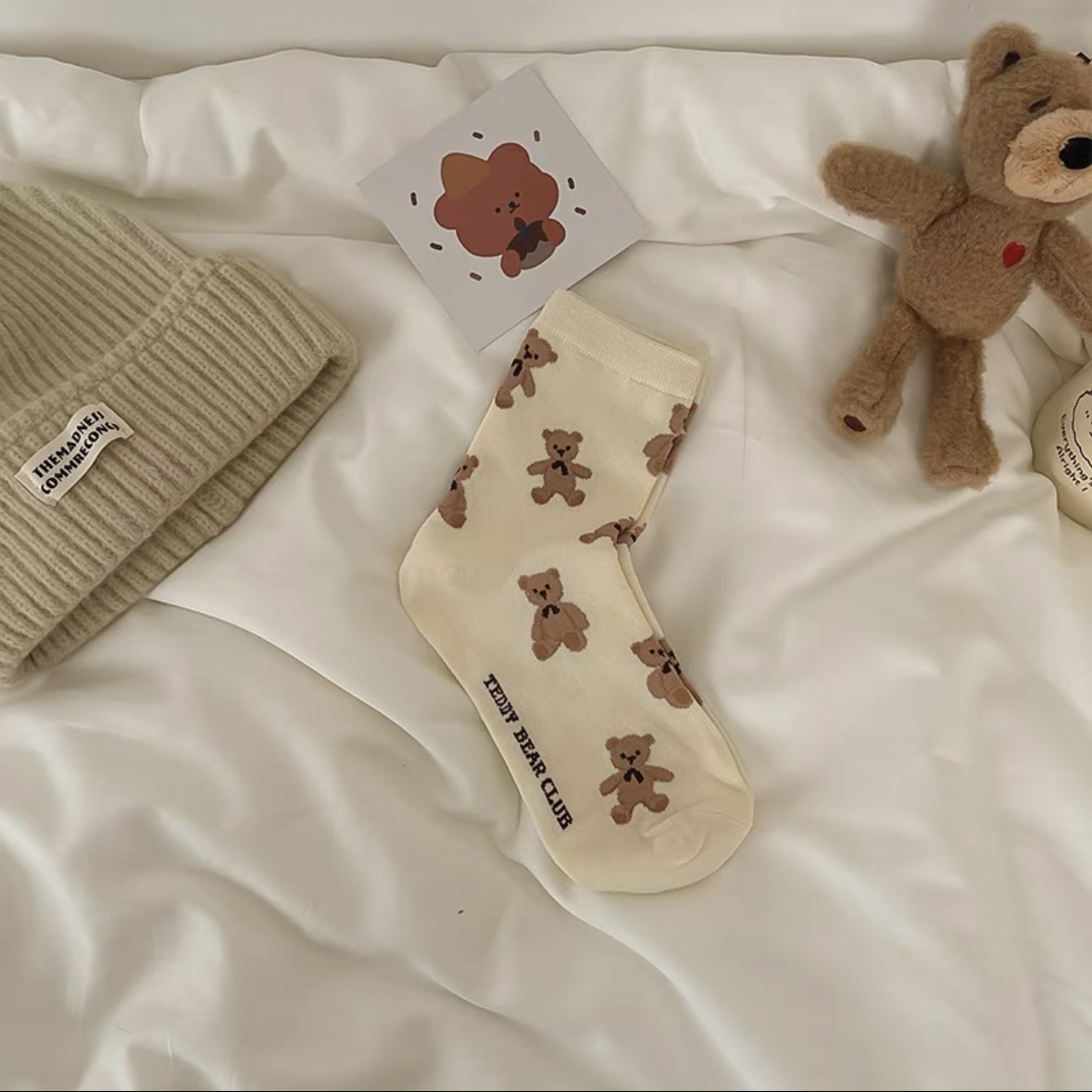 곰 양말 여성 중간 송아지 길이 양말 한국식 동대문, 트렌디 한 귀여운 달콤한 만화 봄과 가을 겨울 스타킹스토어 가기