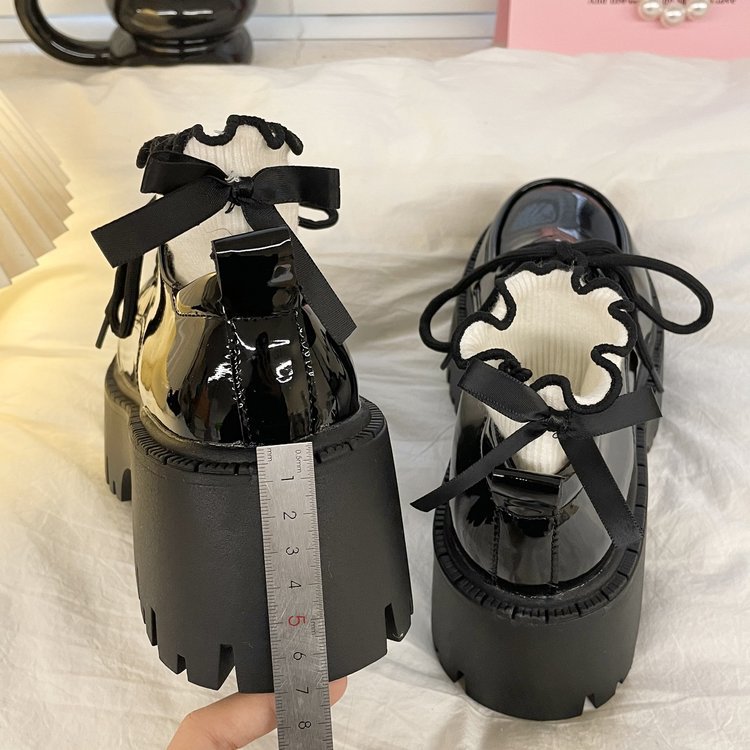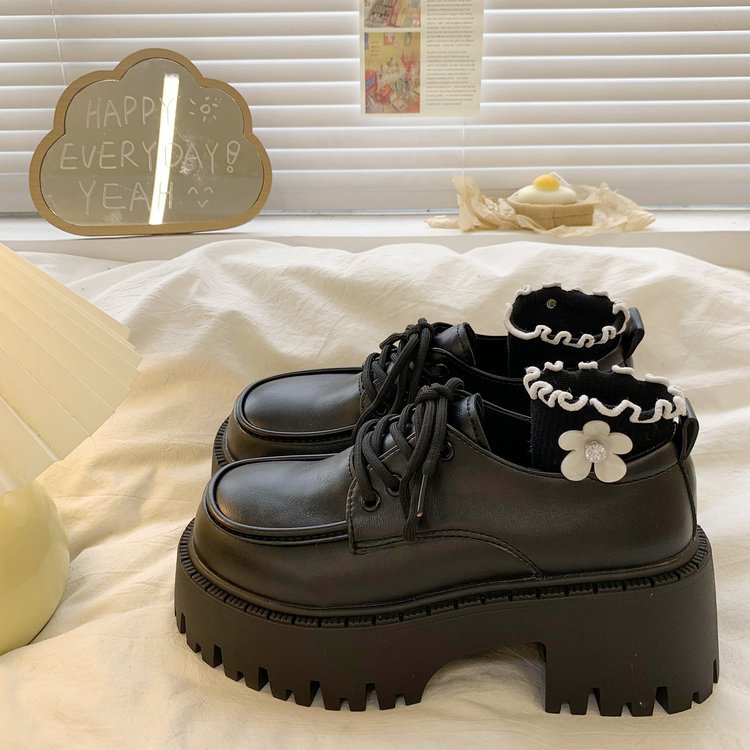 여성의 두꺼운 밑창 검은 가죽 신발 영국 스타일 2024 봄 새로운 일본 jk 신발 복고풍 레이스 업 청키 힐 로퍼